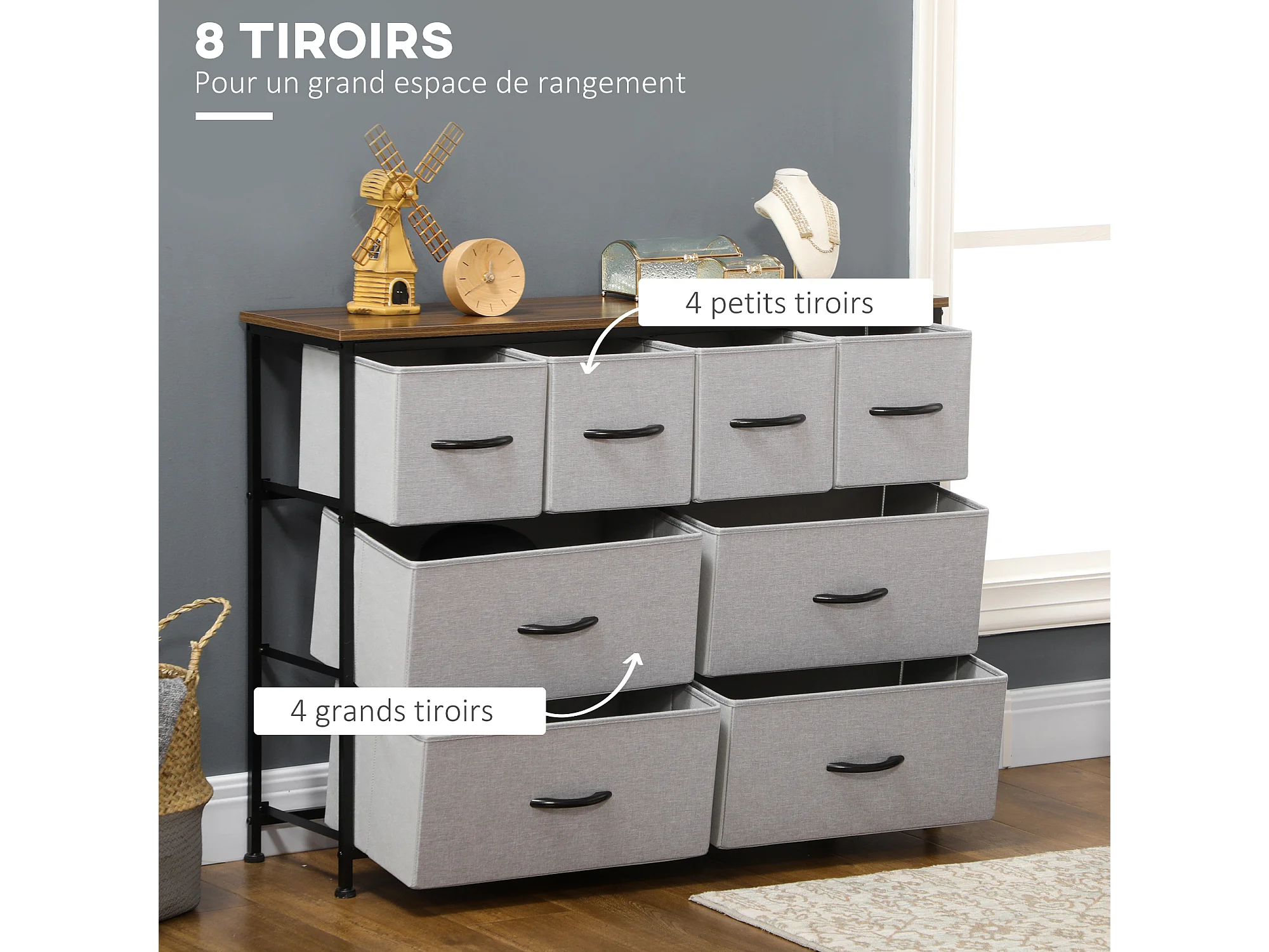 Commode meuble de rangement 8 tiroirs pliables châssis acier noir plateau aspect bois non tissé gris