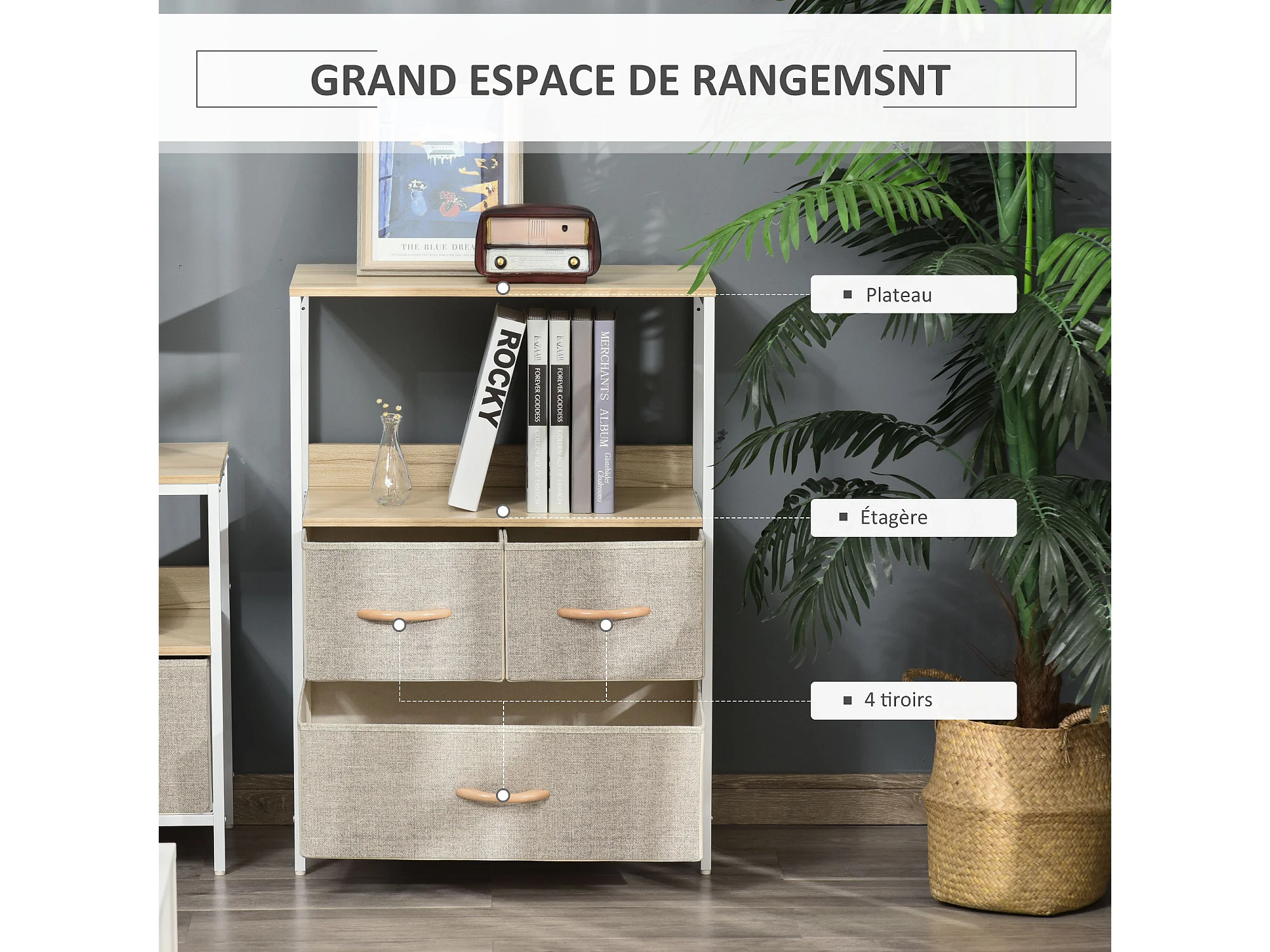 Commode meuble de rangement chiffonnier 4 tiroirs amovibles 1 étagère 58 x 29 x 103 cm gris blanc