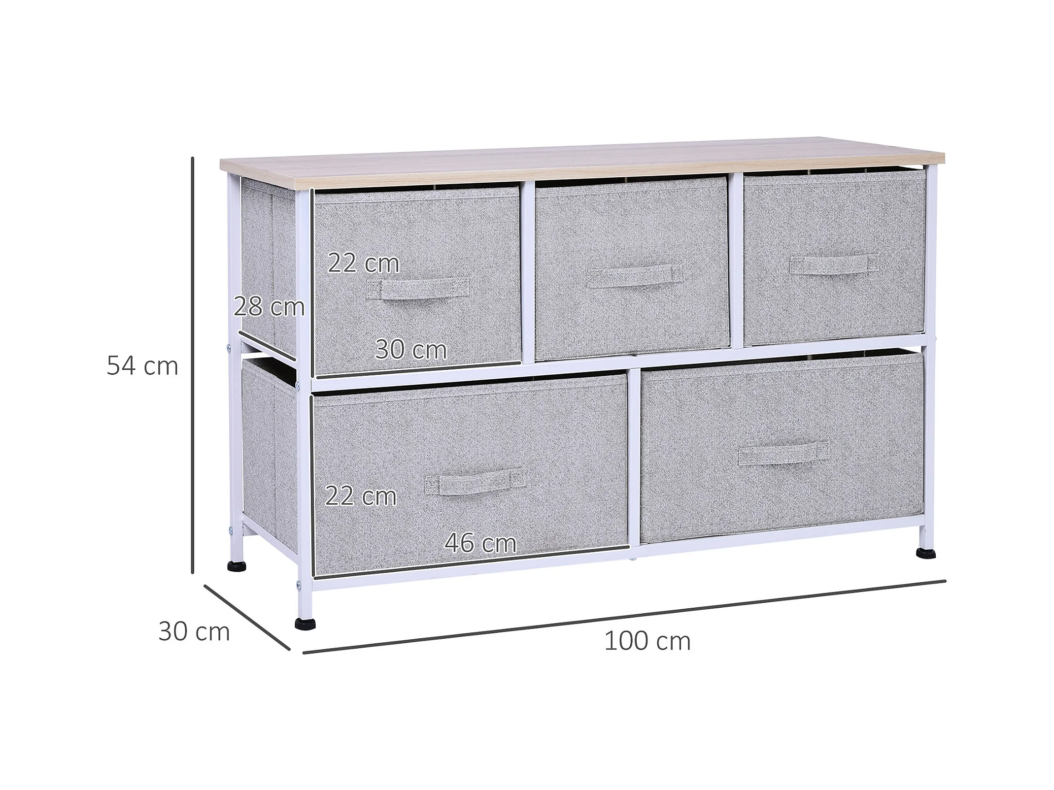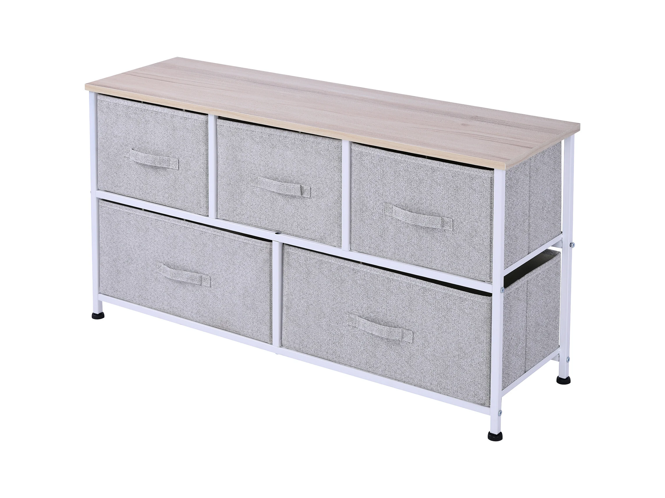 Commode meuble de rangement dim. 100L x 30l x 54H cm 5 tiroirs non-tissés gris structure métal blanc plateau MDF bois clair