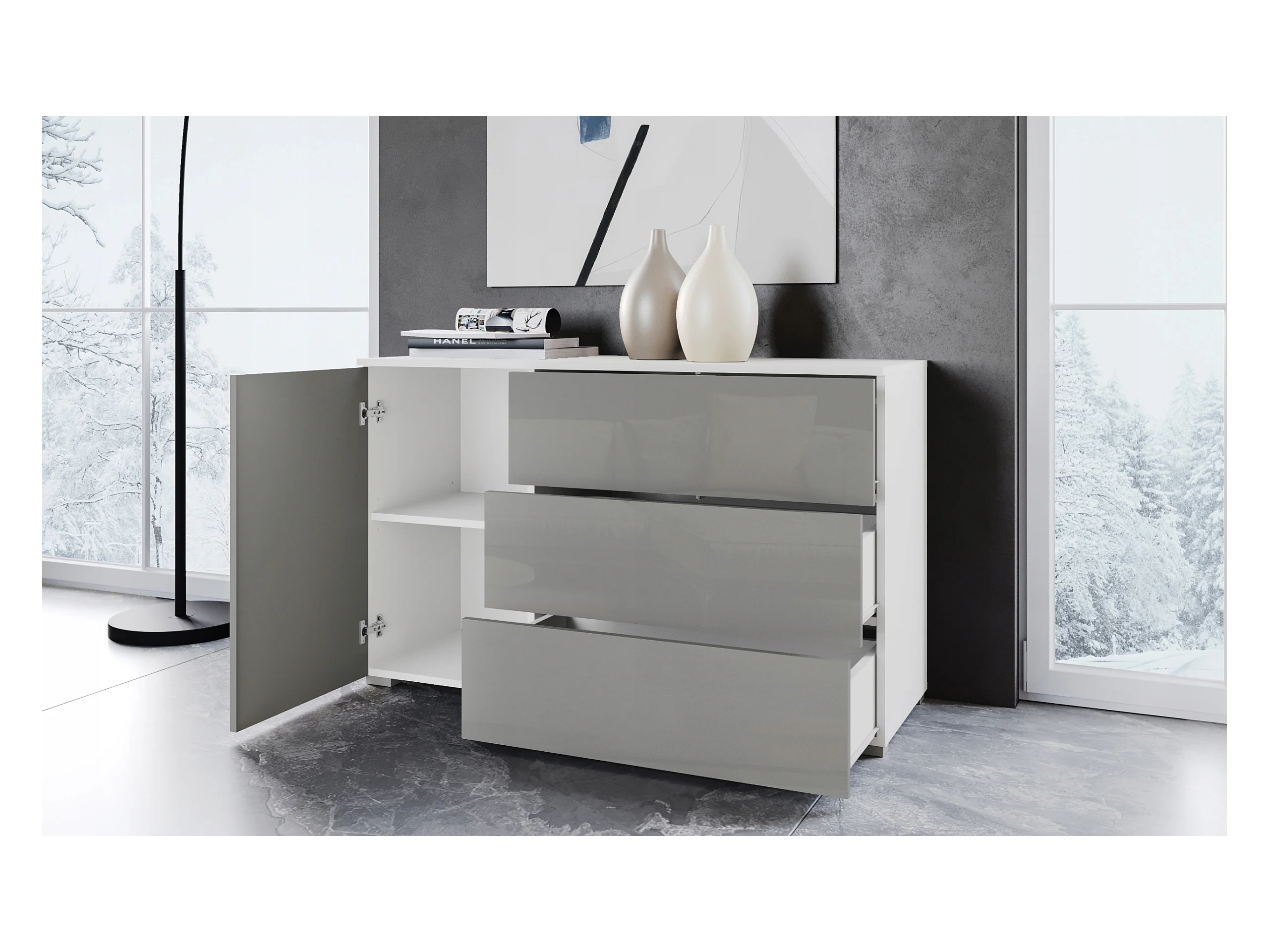 Commode moderne 110 cm pour salon – commode avec 3 tiroirs et 1 porte, corps blanc mat et façades gris brillant