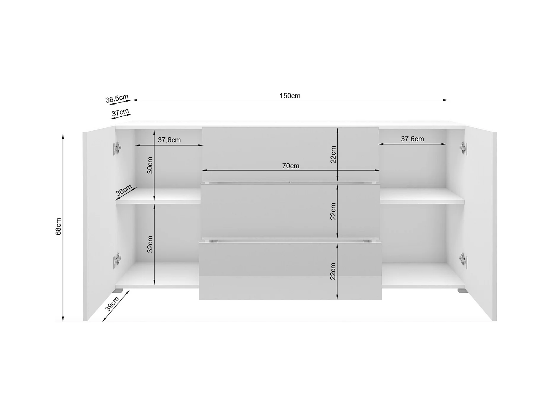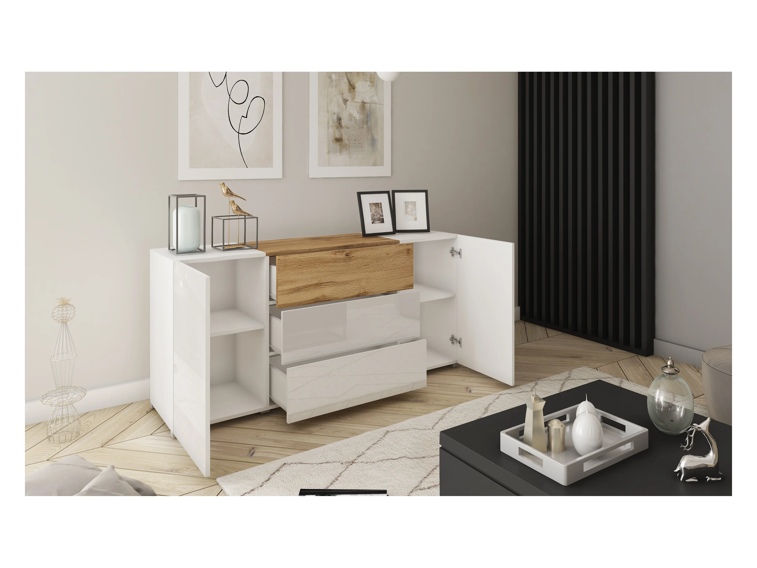 Buffet moderne 150 cm – sur pied, 3 tiroirs et 2 portes, corps blanc mat, façades blanc brillant, insert chêne wotan mat