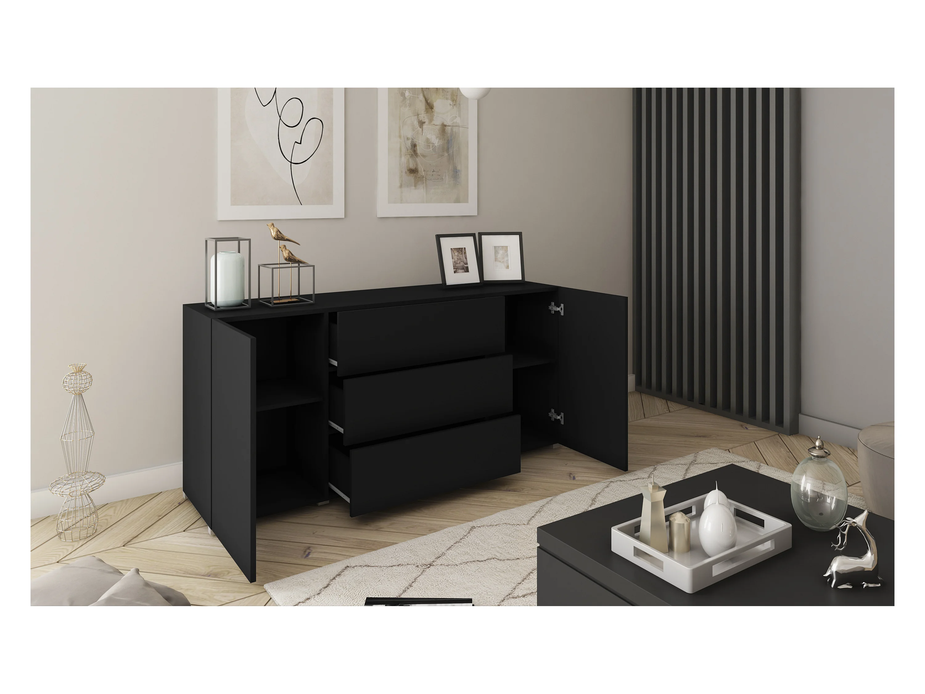 Buffet moderne 150 cm – sur pied, 3 tiroirs et 2 portes, couleur graphite noir mat