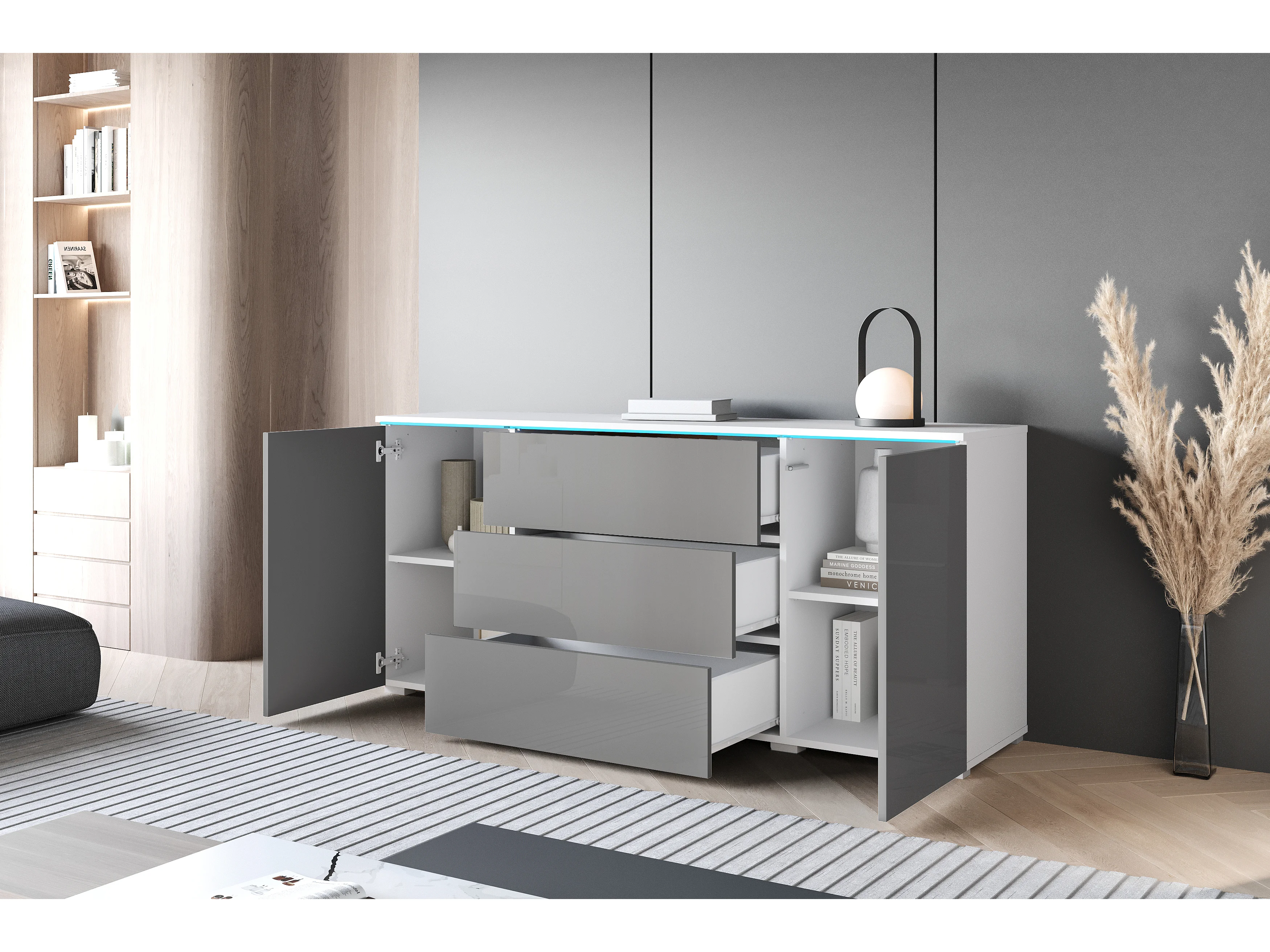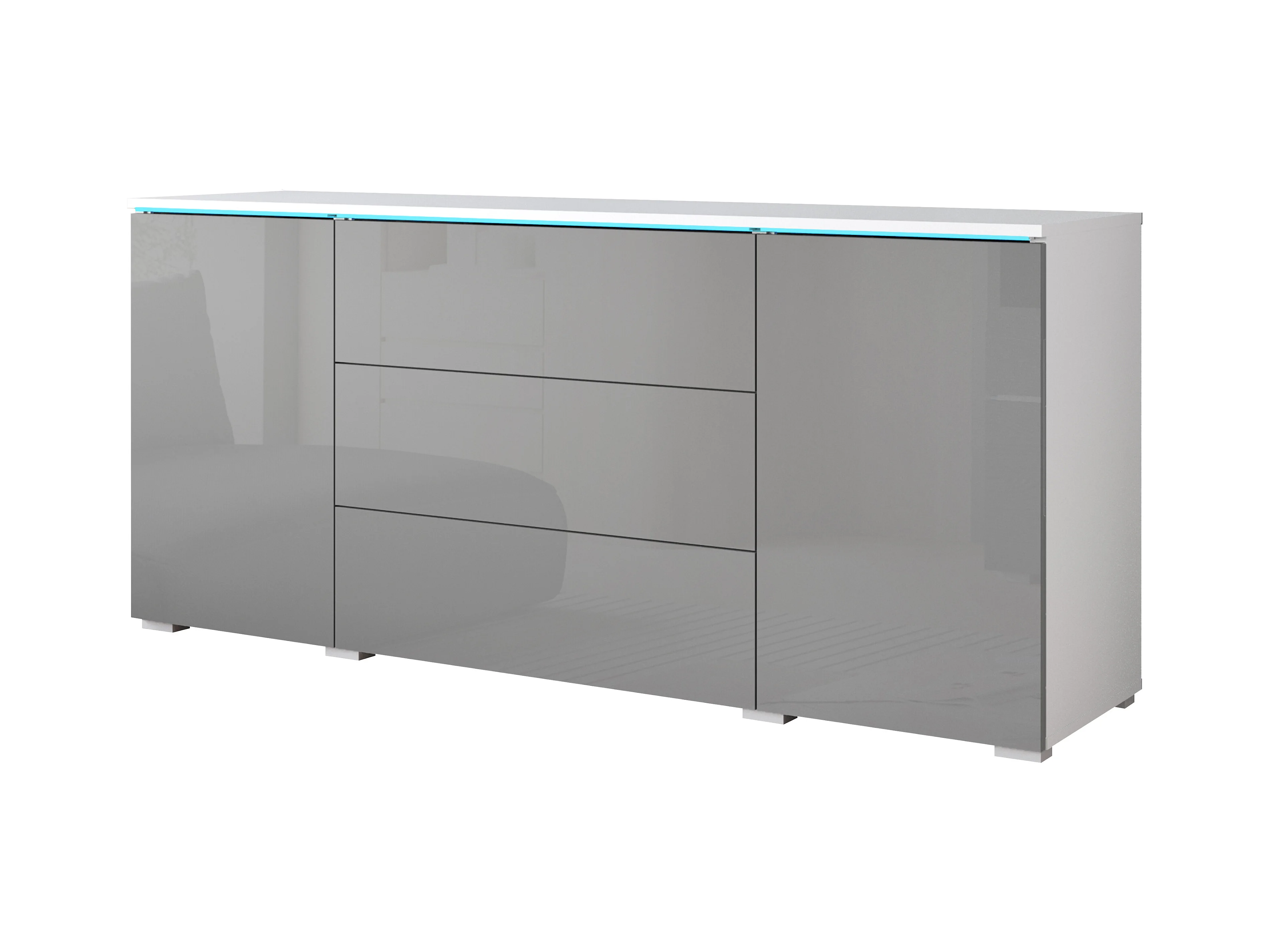 Commode moderne 150 cm avec LED pour salon – corps blanc mat, façades gris brillant, 3 tiroirs et 2 portes