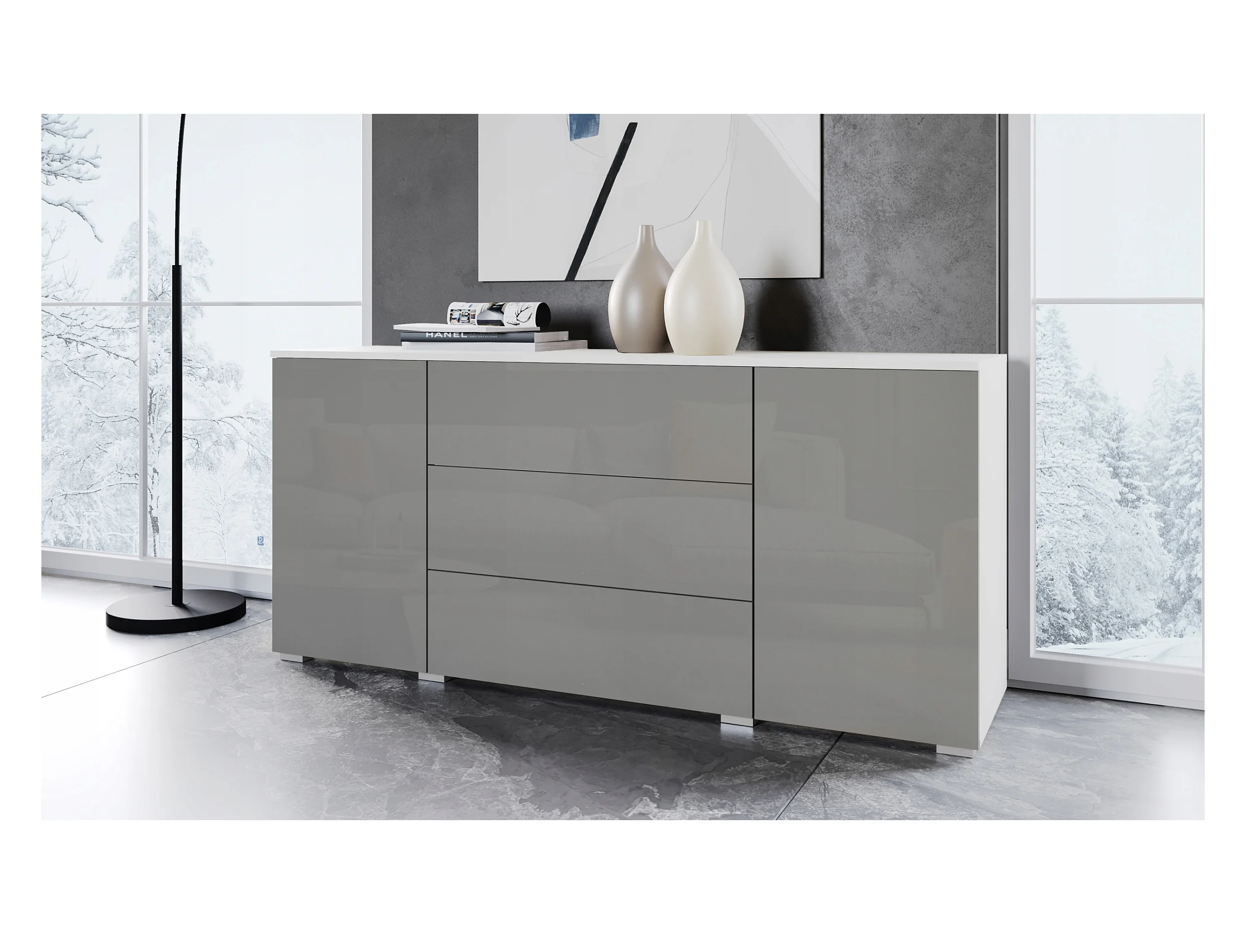 Commode moderne 150 cm pour salon – commode avec tiroirs et portes, corps blanc mat et façades gris brillant