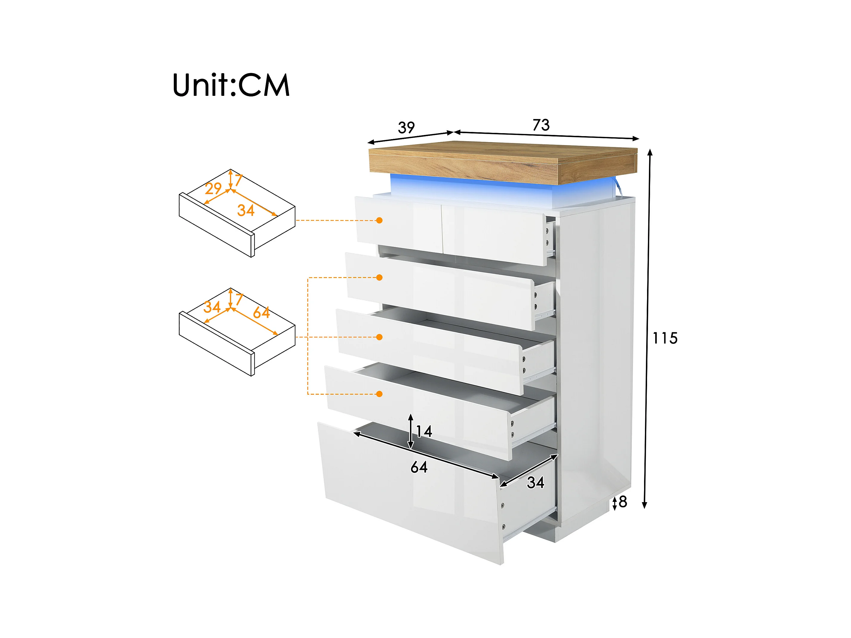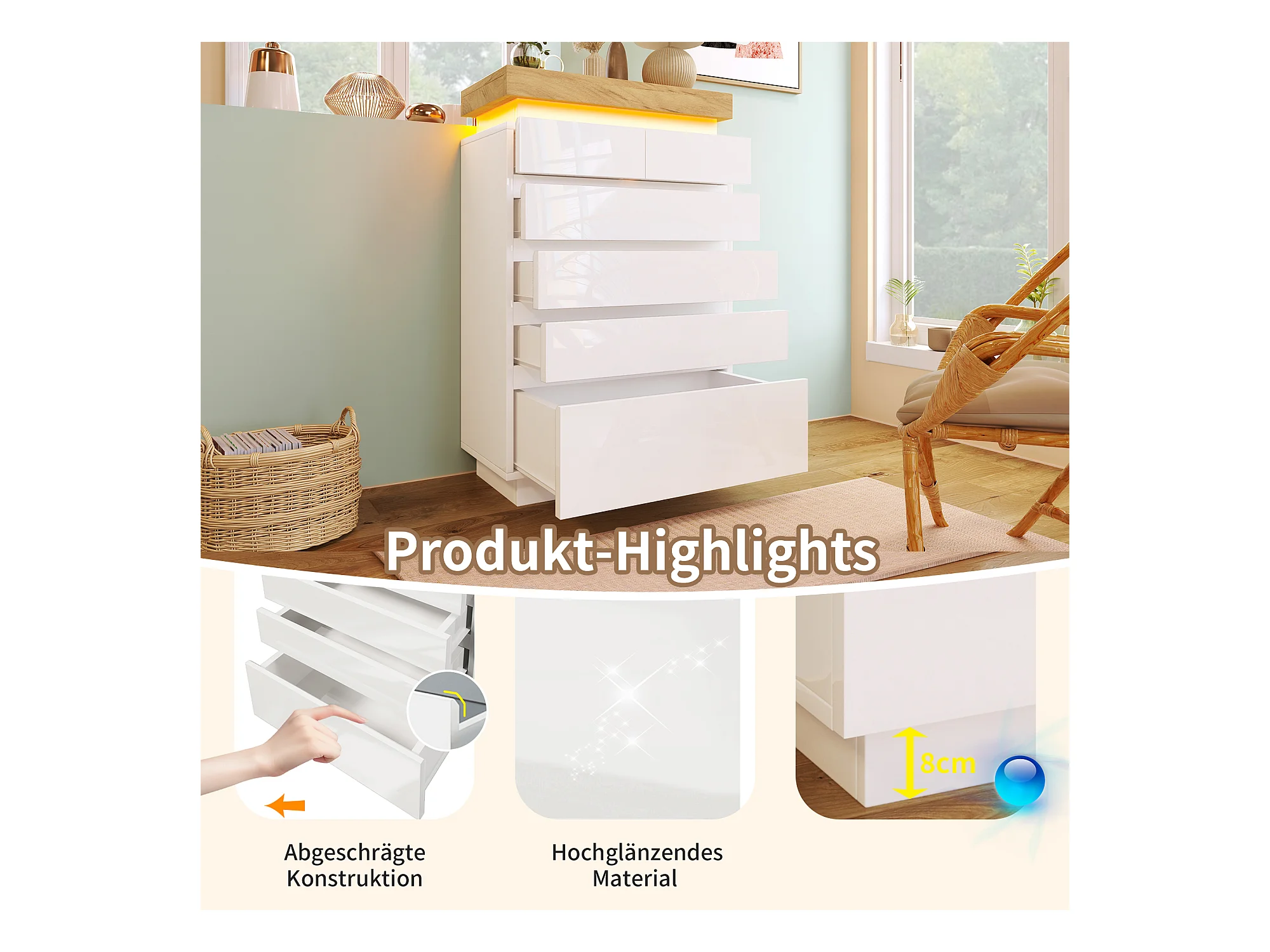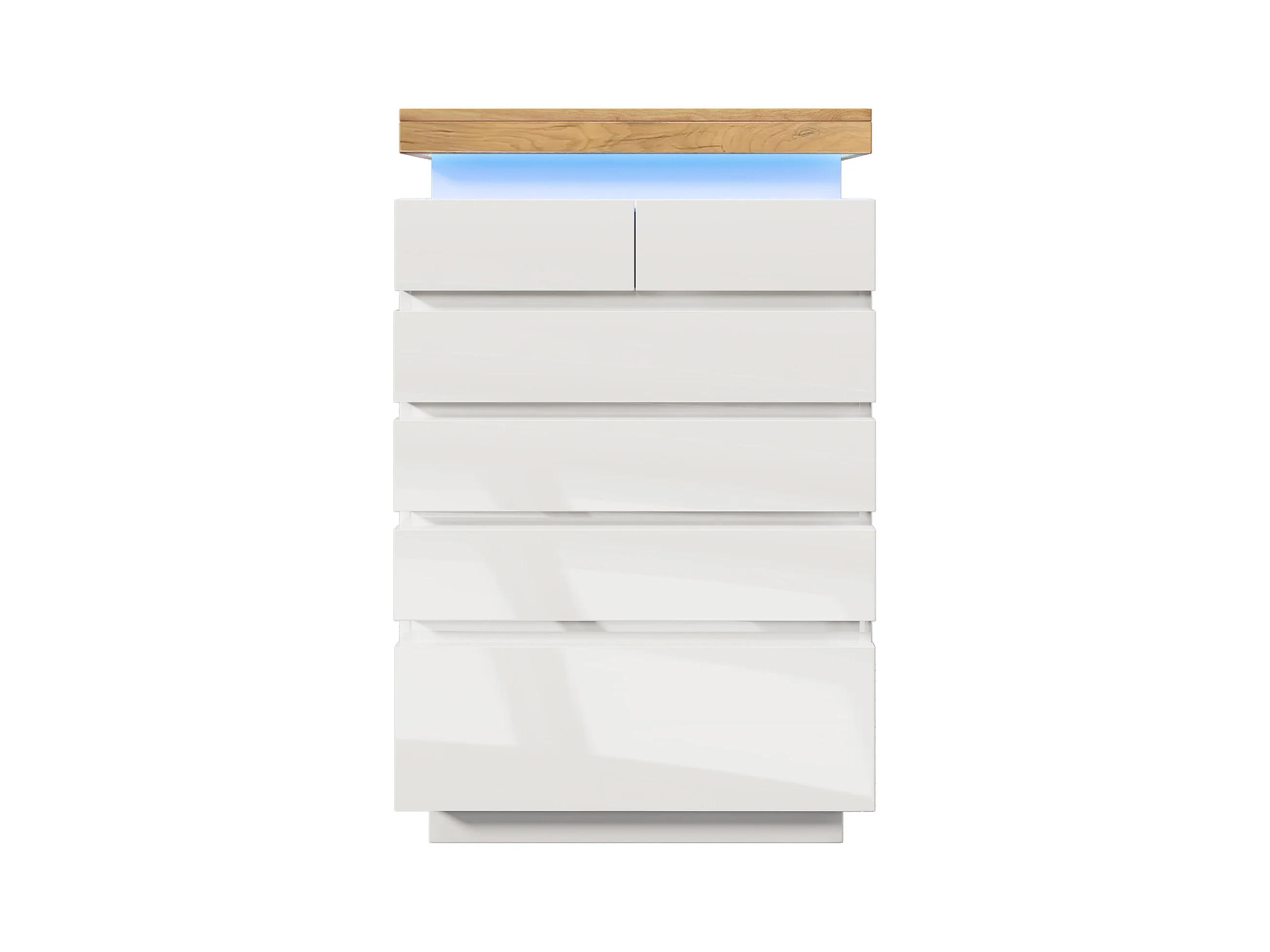 Commode moderne avec 6 tiroirs, LED contrôlable par application, meuble multifonction pour salon et chambre, blanc, (115x73x39 cm)
