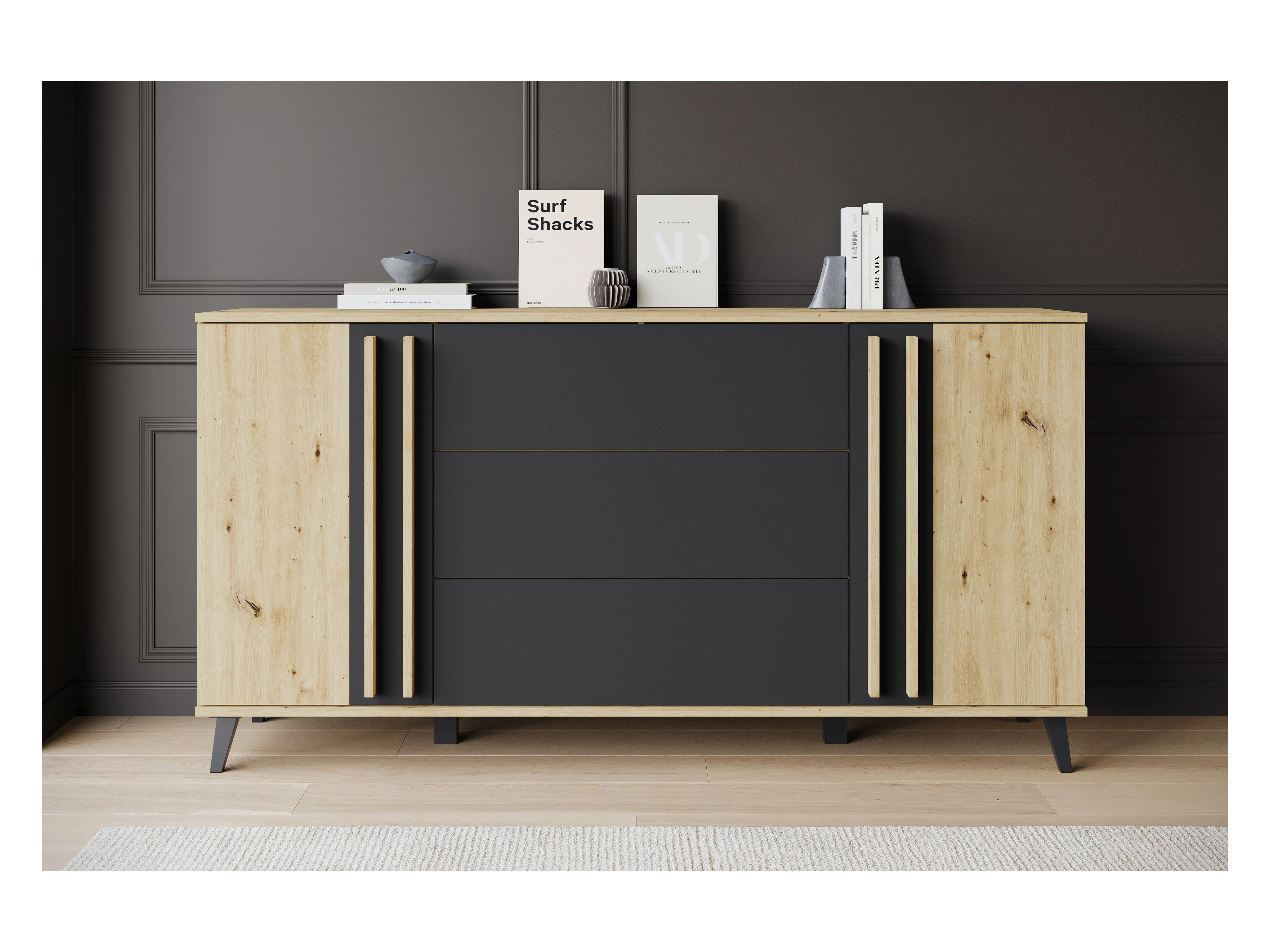 Buffet 150 cm sur pieds pour salon – moderne avec 3 tiroirs et 2 portes, mat Artisan + graphite noir
