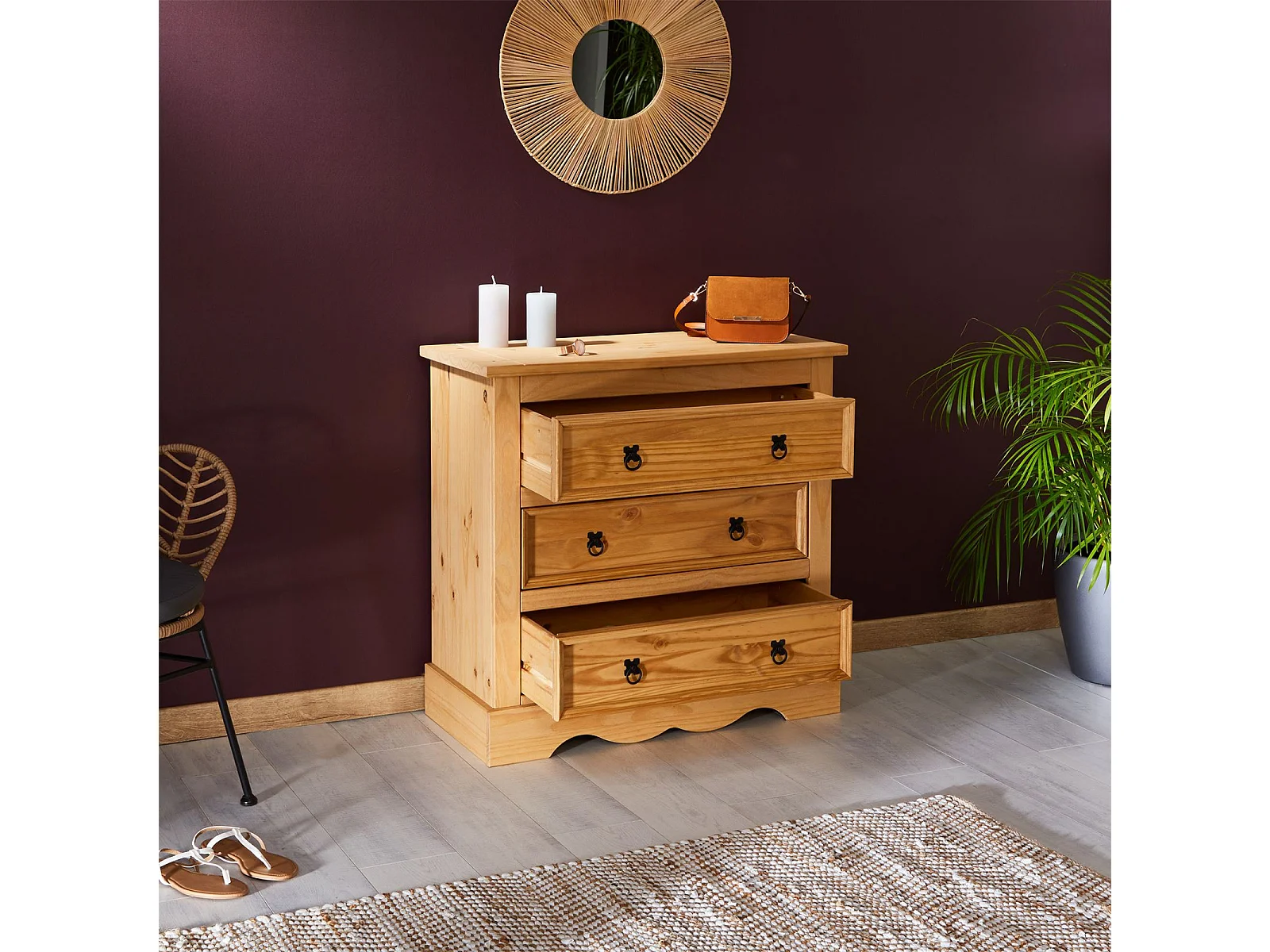 Commode TEQUILA buffet bahut vaisselier en bois style mexicain avec 3 grands tiroirs, en pin massif à la finition teintée et cirée