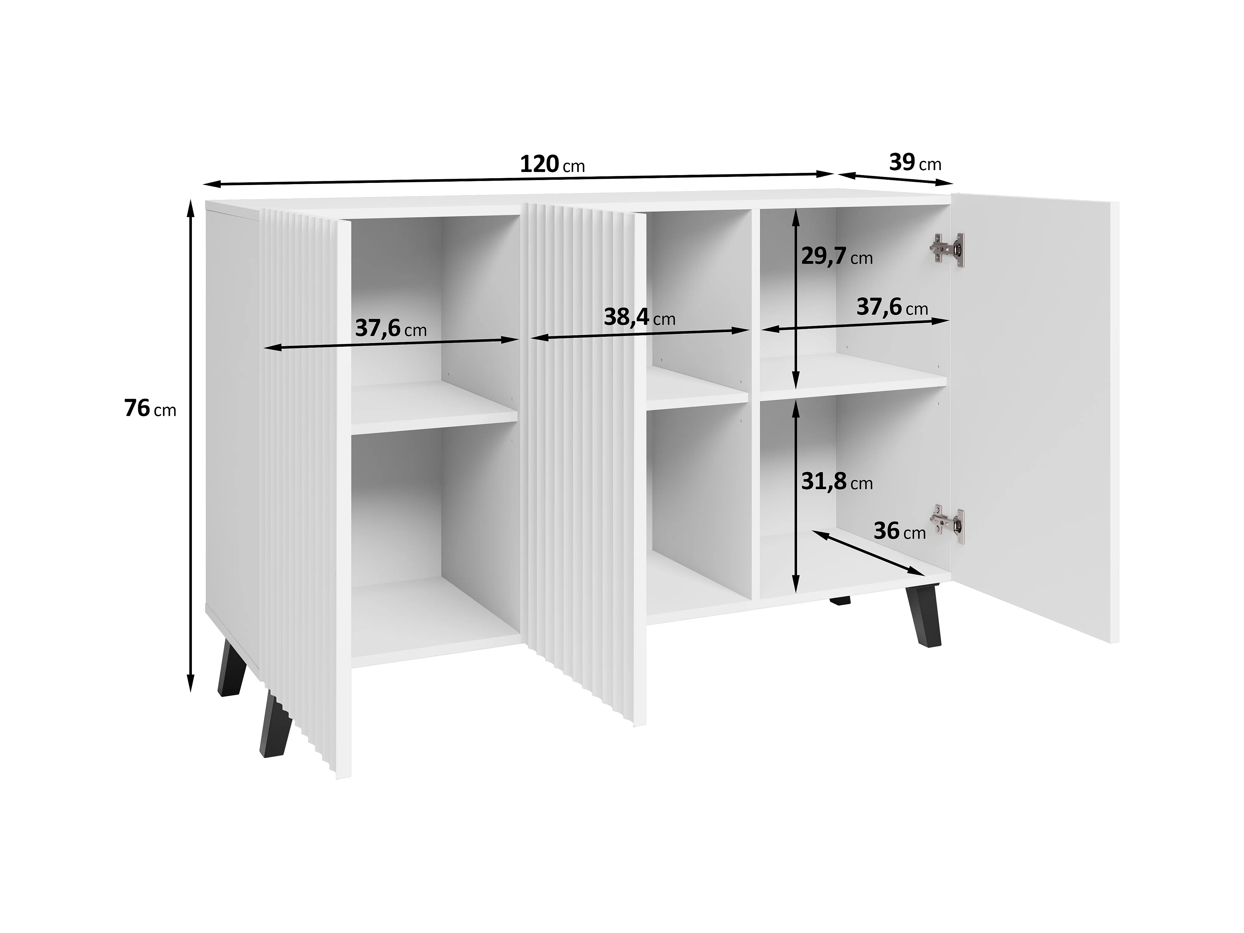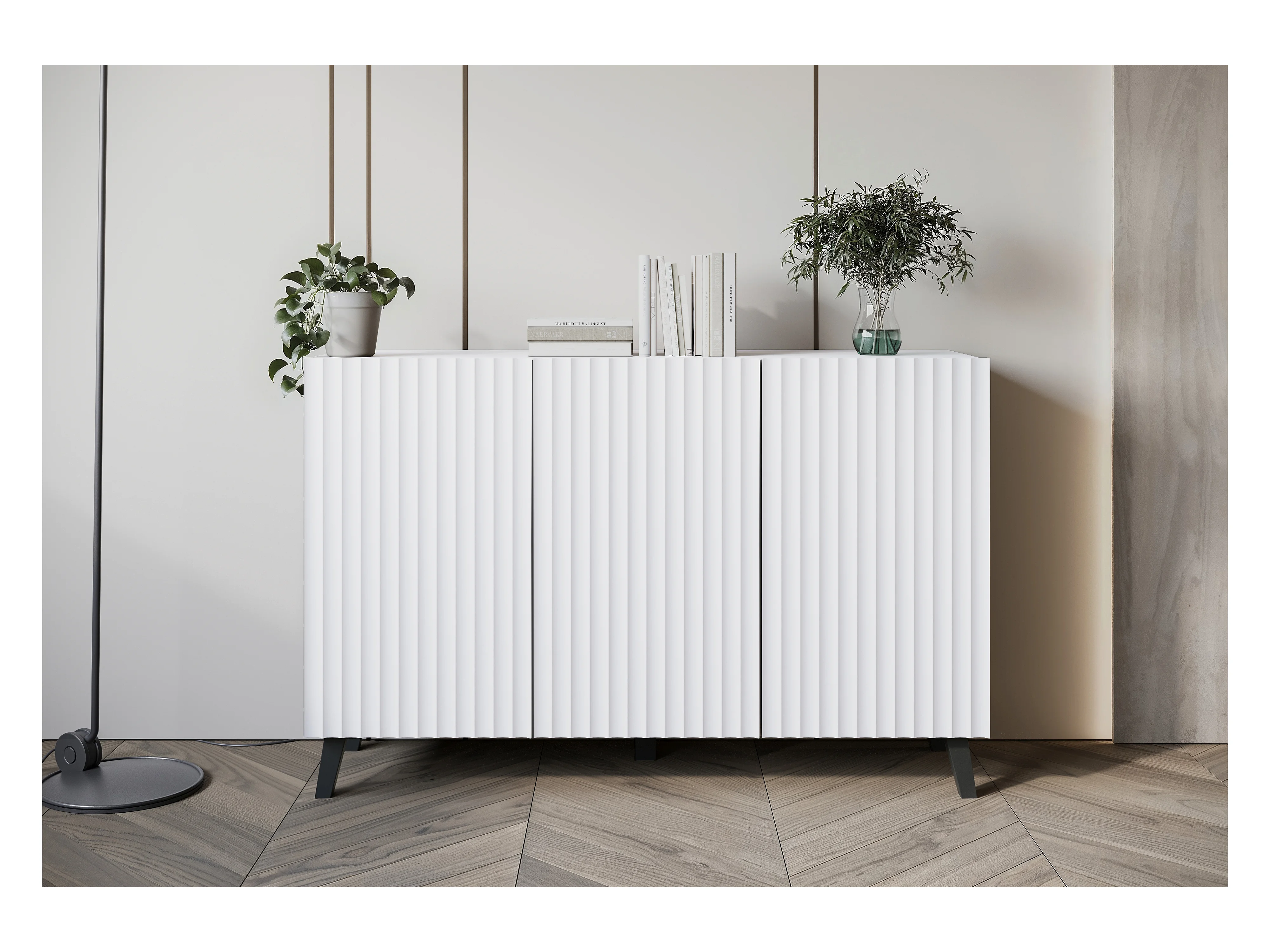 Commode moderne 120 cm pour salon sur pieds, blanche, façades MDF à larges rainures