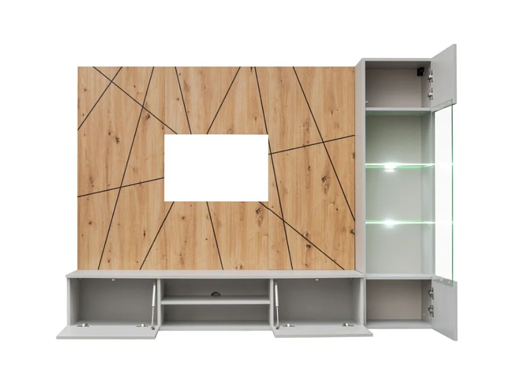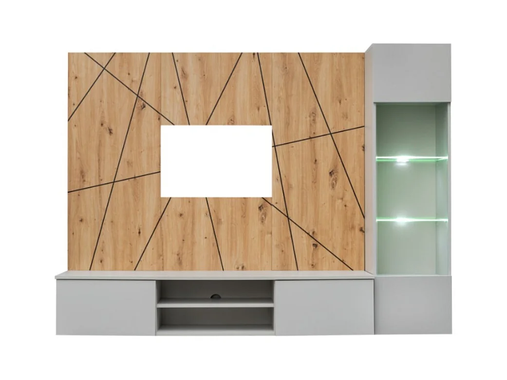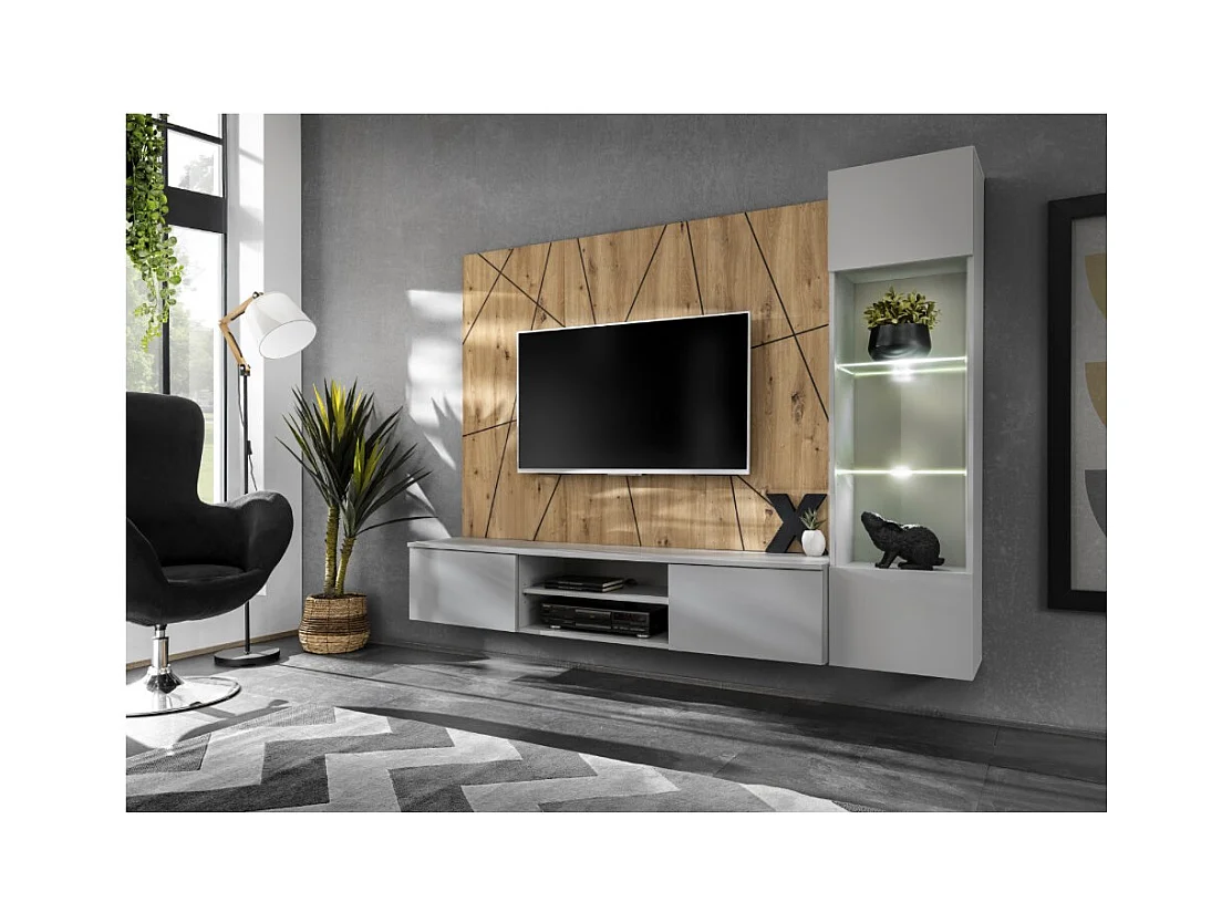 Composition murale IXAR géométrique – Meuble TV + vitrine suspendue + panneaux décoratifs