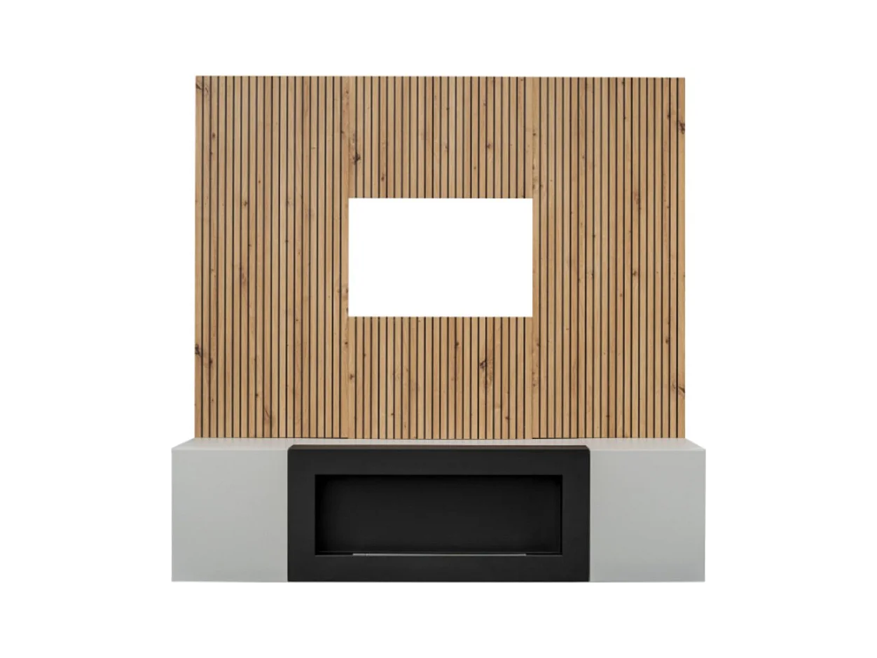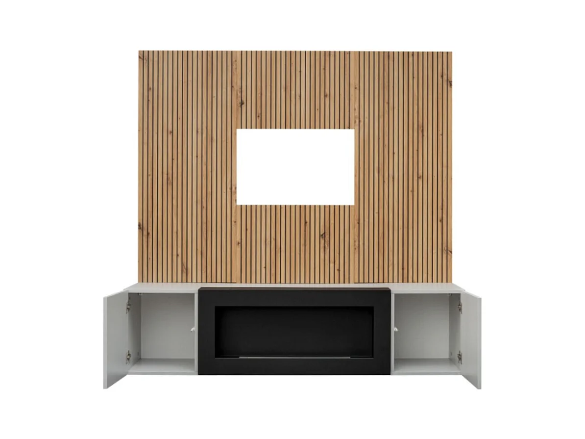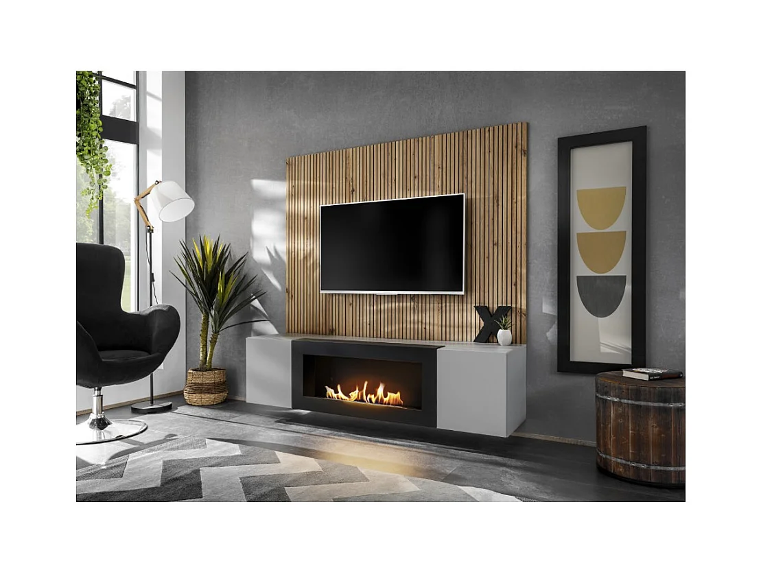 Composition murale IXAR – Meuble TV, panneaux muraux + cheminée bio-éthanol