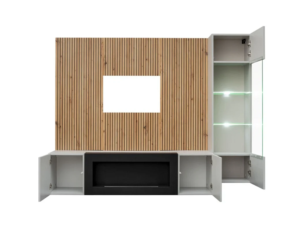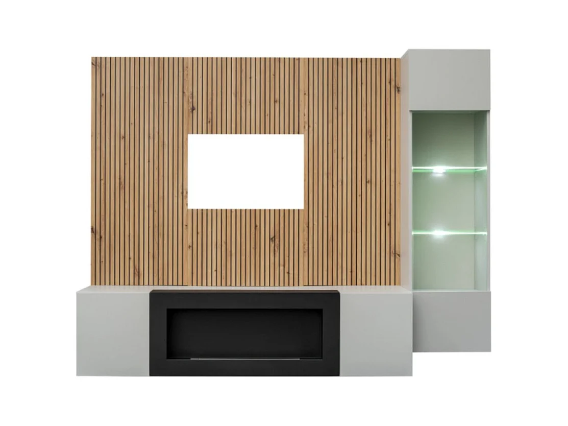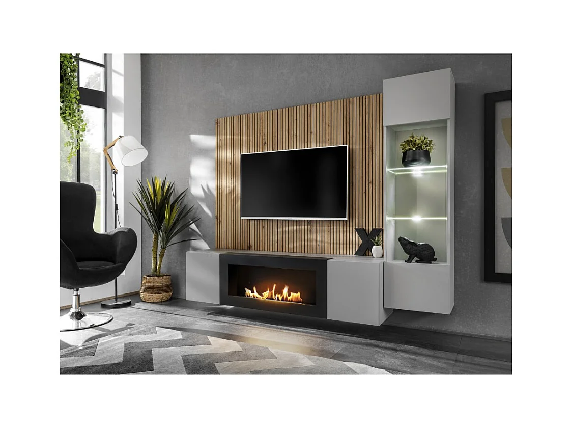 Composition murale IXAR – Meuble TV, vitrine suspendue, panneaux muraux et cheminée bio-éthanol