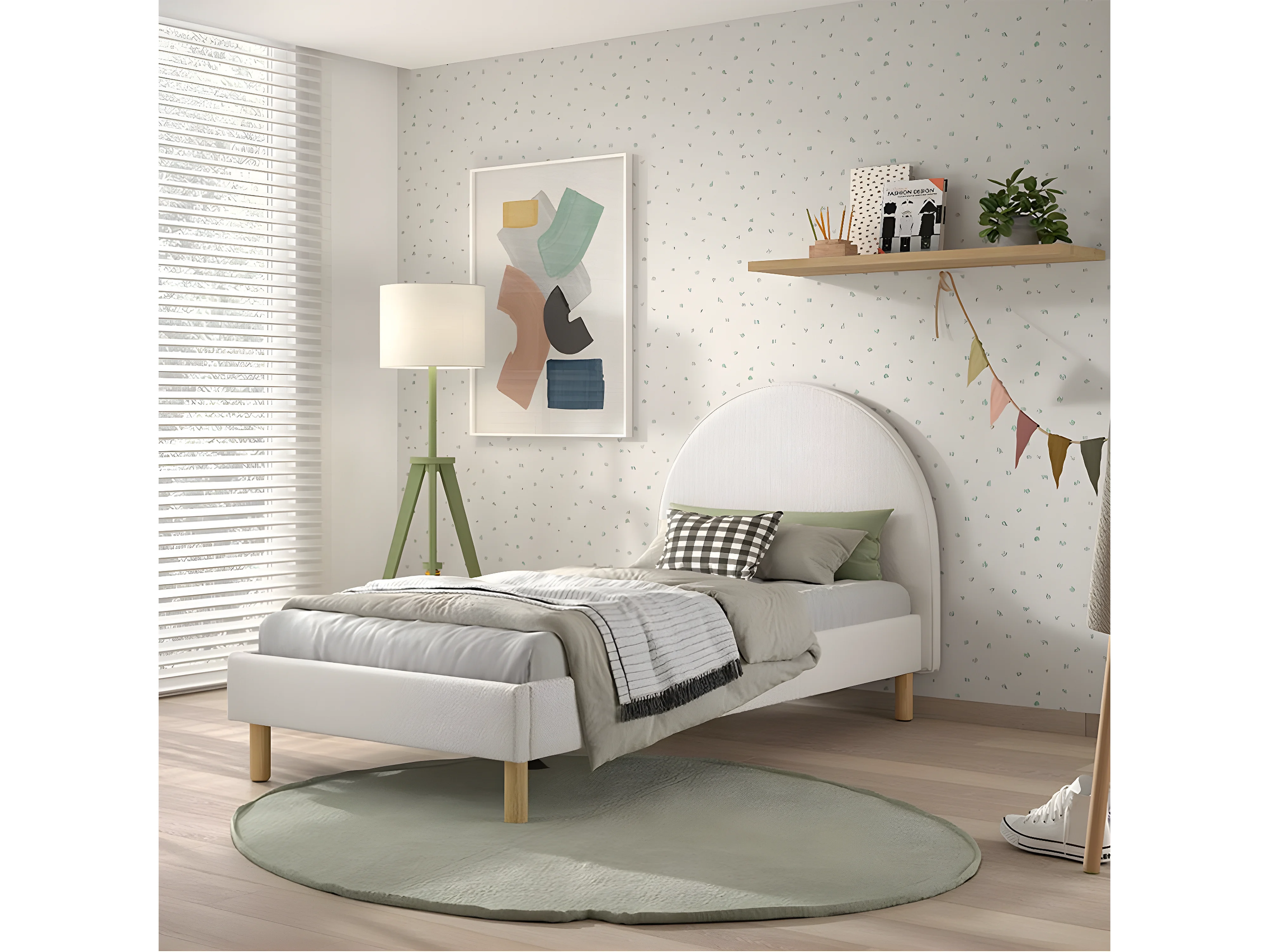 CONNIE - Pack Lit 90x200cm Tête Demi-Lune + Pouf Tissu Bouclé Blanc