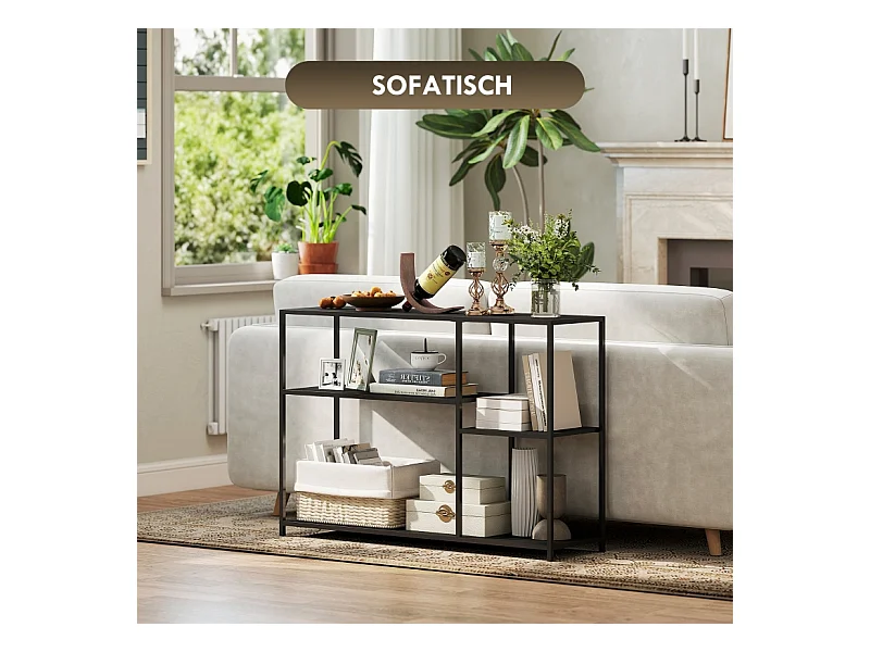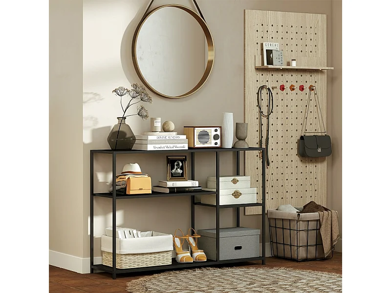 Console avec 4 étagères, design industriel, structure en acier, couleur noire (110x30x75 cm)