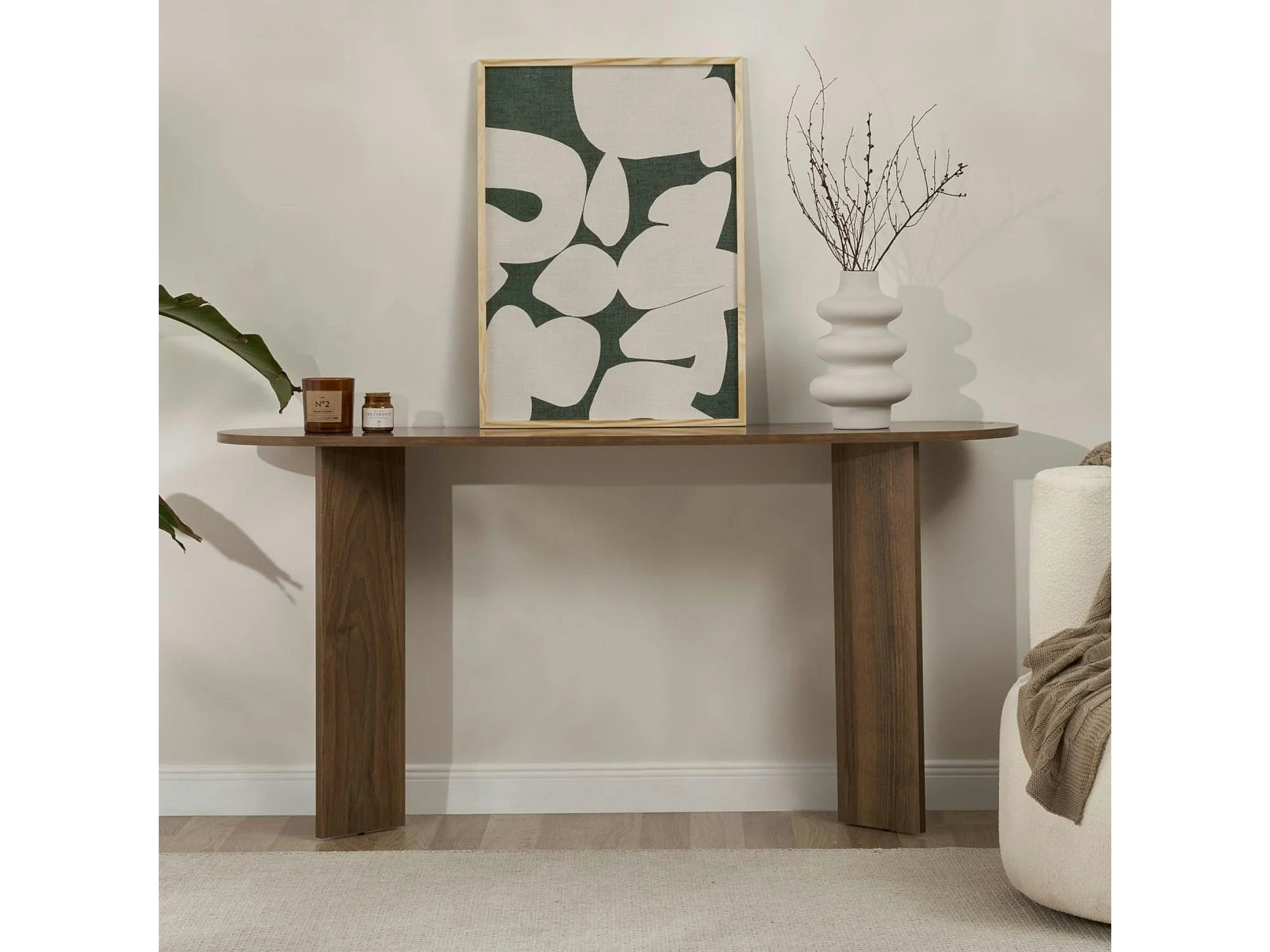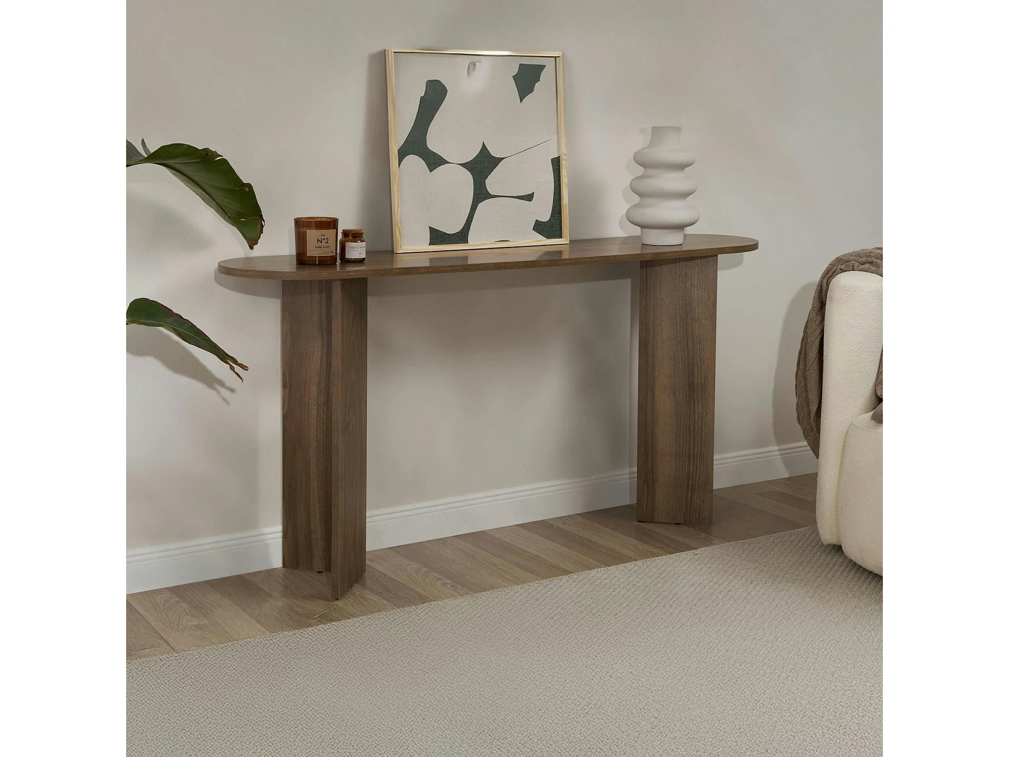 Console de salon ovale effet noyer clair - pieds en V MARFA
