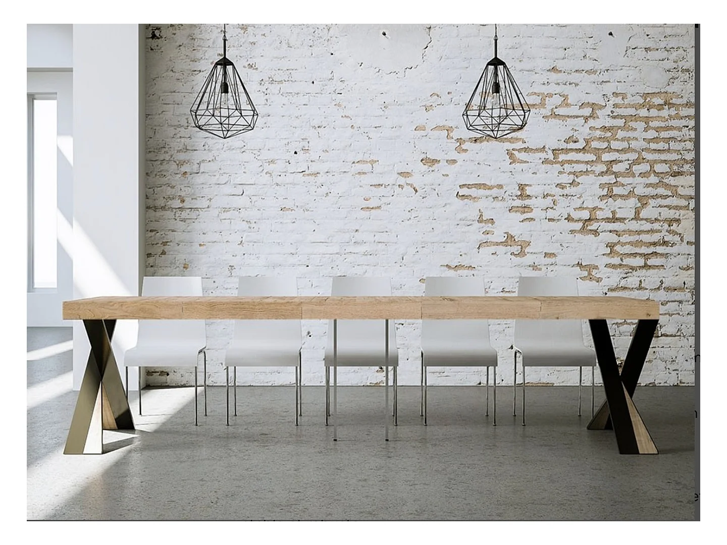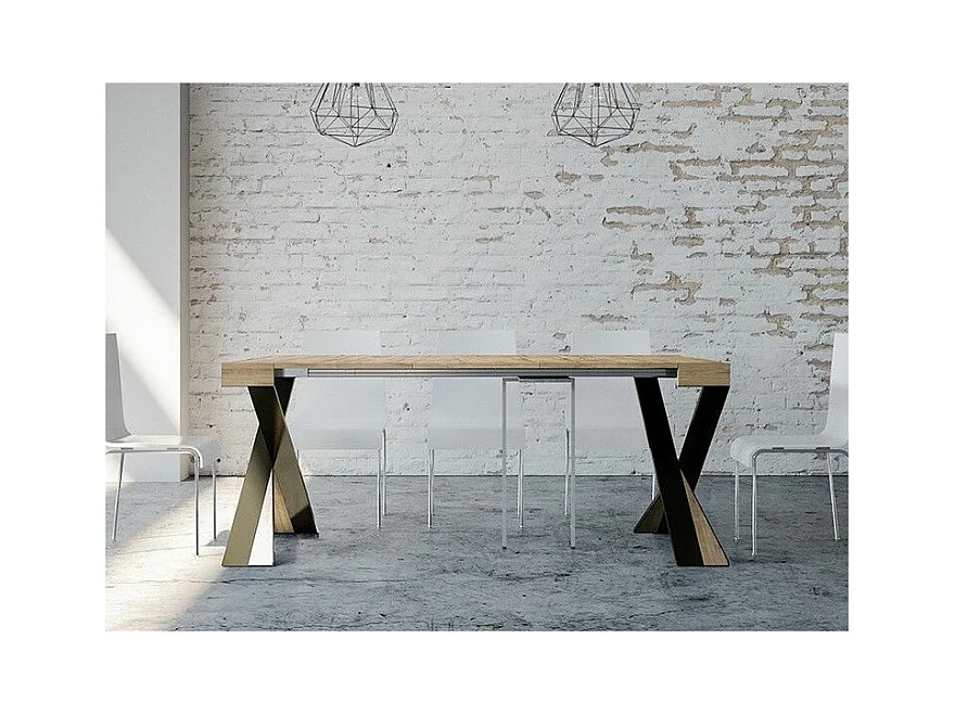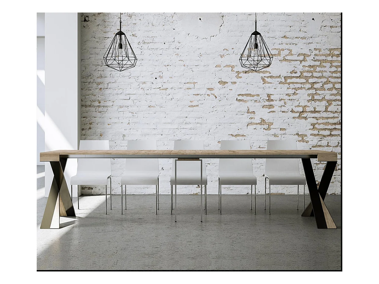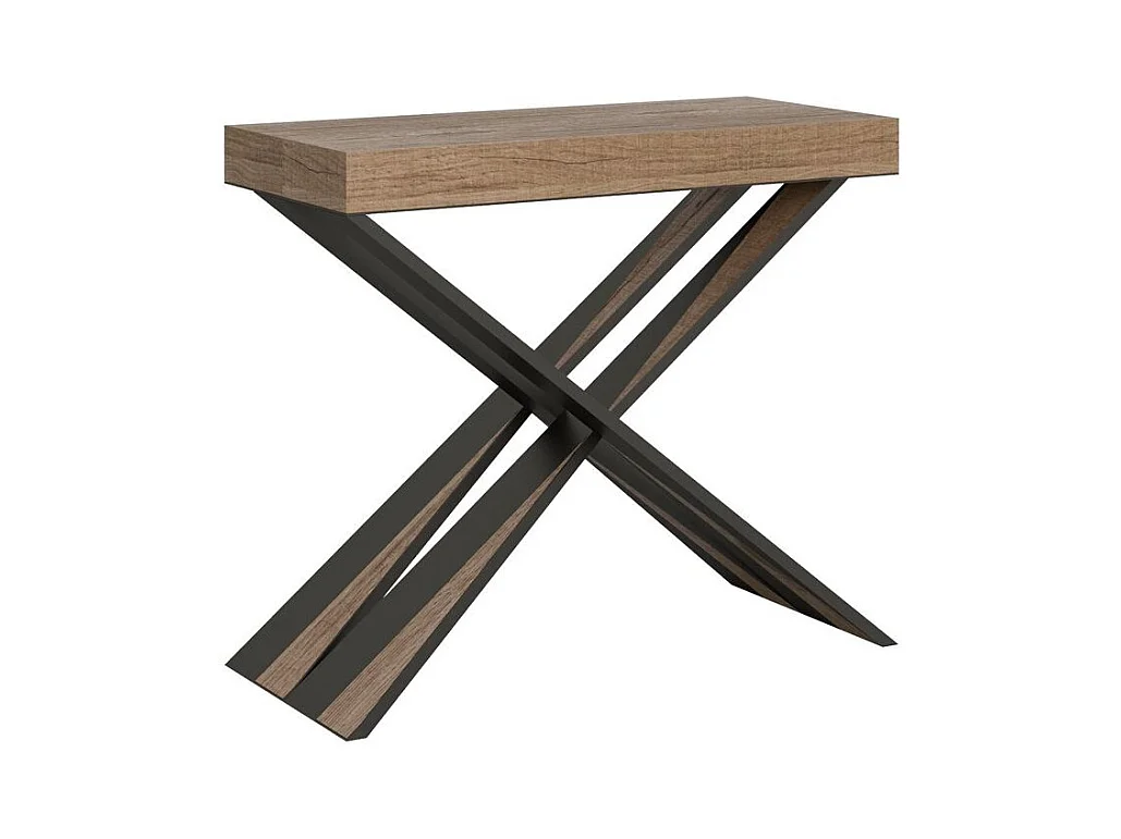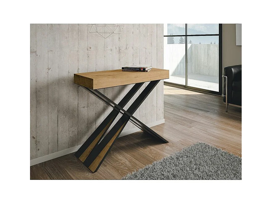 Console extensible design bois et pieds croisés acier anthracite Diago 90x40-196 ou 90x40-300-Couleur Naturel-Pied et support sur roulettes-5 rallonges fines