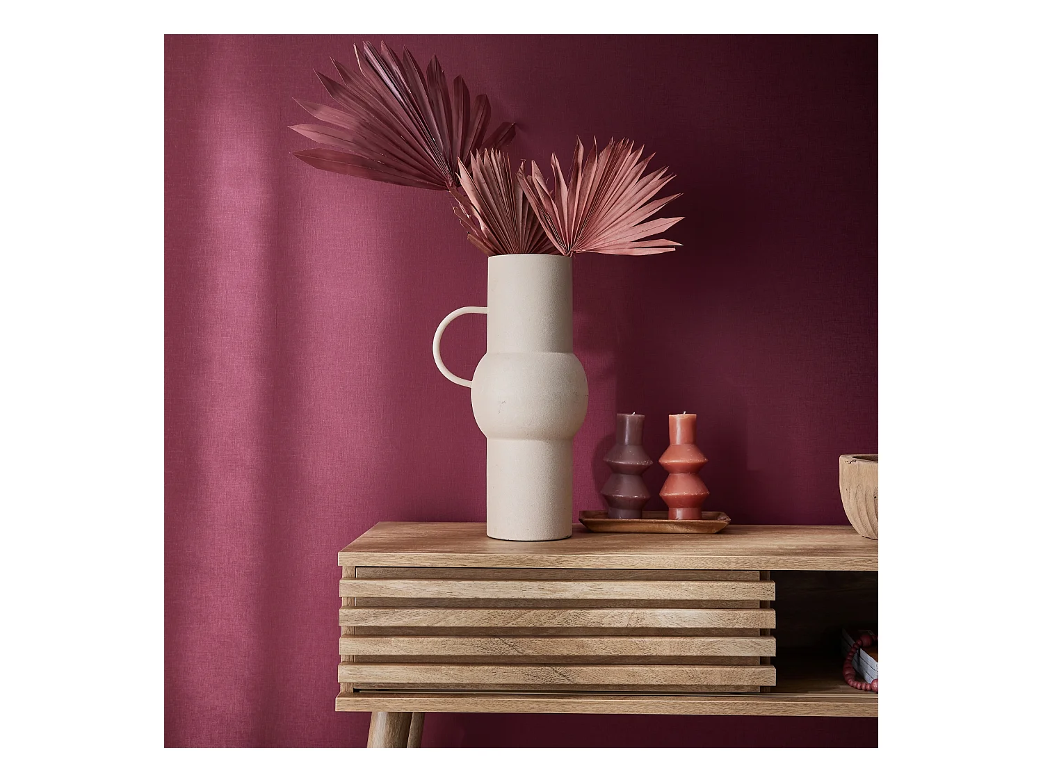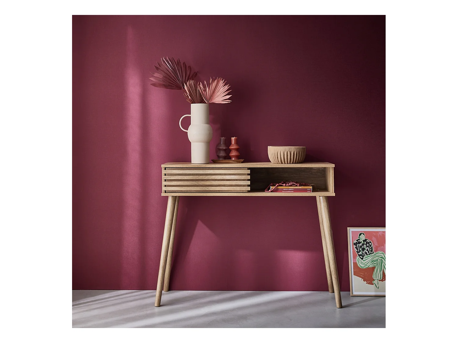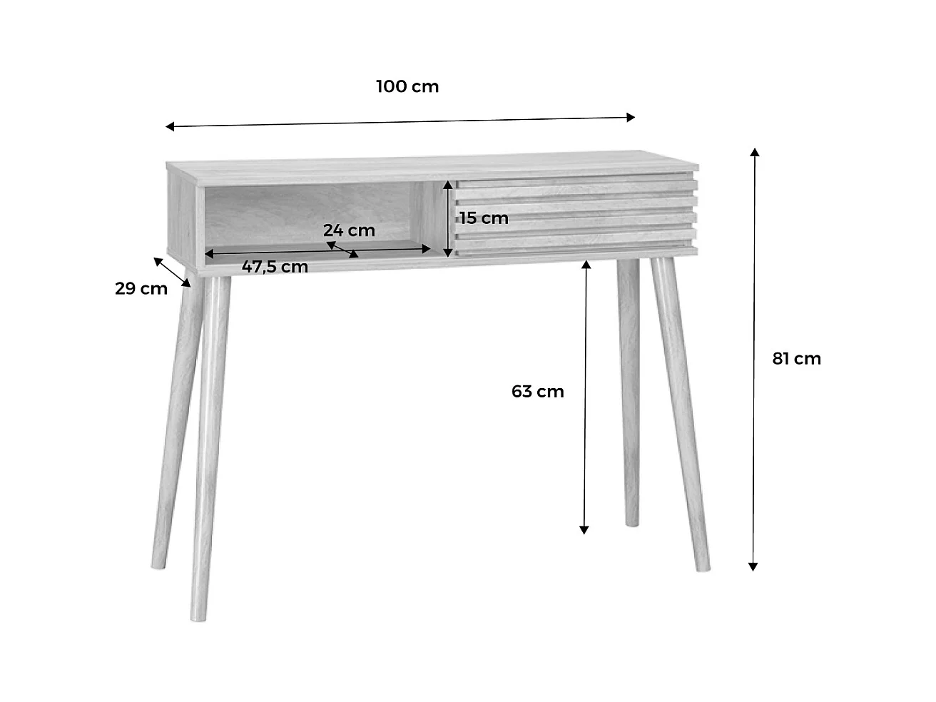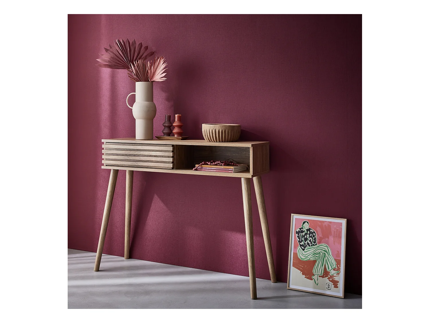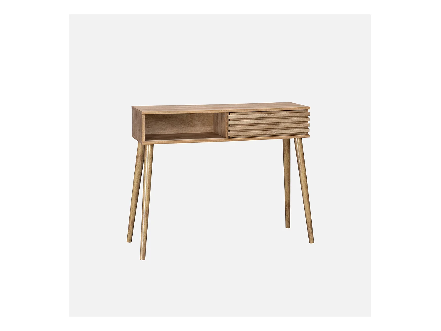 Console scandinave décor bois avec 1 porte coulissante rainurée 2 niches de rangement