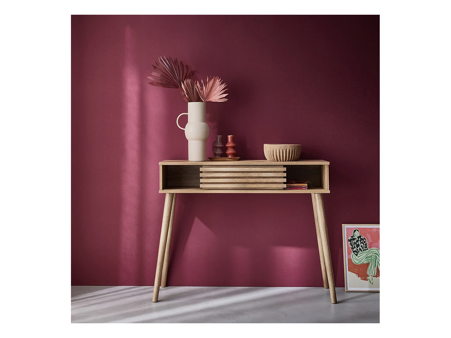 Console décor bois et cannage arrondi . Eva. 1 tiroir. 1 niche. pieds scandinaves. L 100 x l 29 x H 81cm