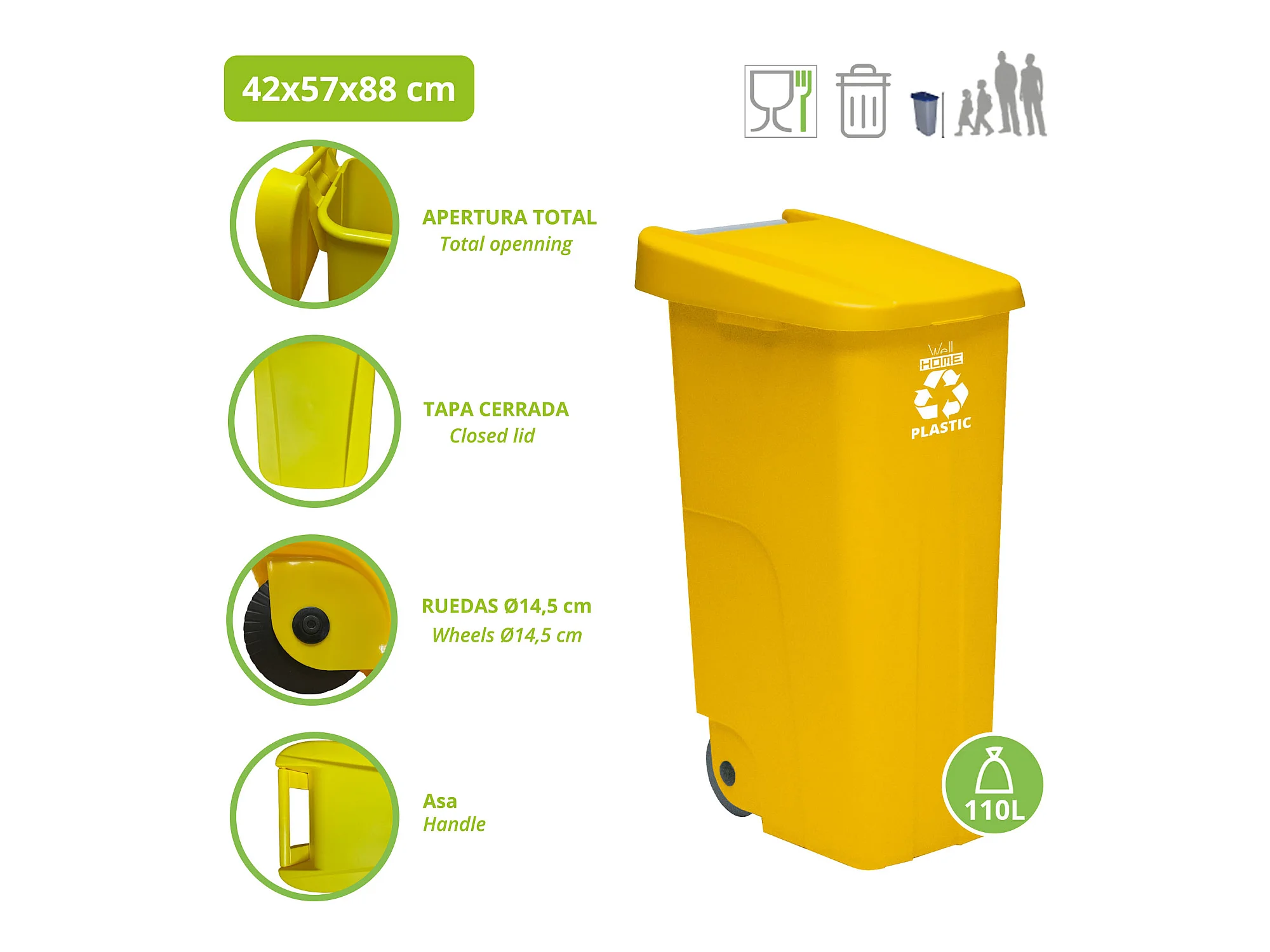 Container recycle 110 litres, fermé avec le couvercle, idéal pour le recyclage des plastiques, avec des roues + 3x sacs à ordures de 10 unités, L57 P 42 H88