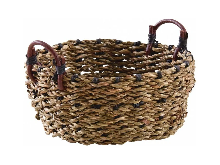 Corbeille ronde en jonc avec anses en cuir 14 cm