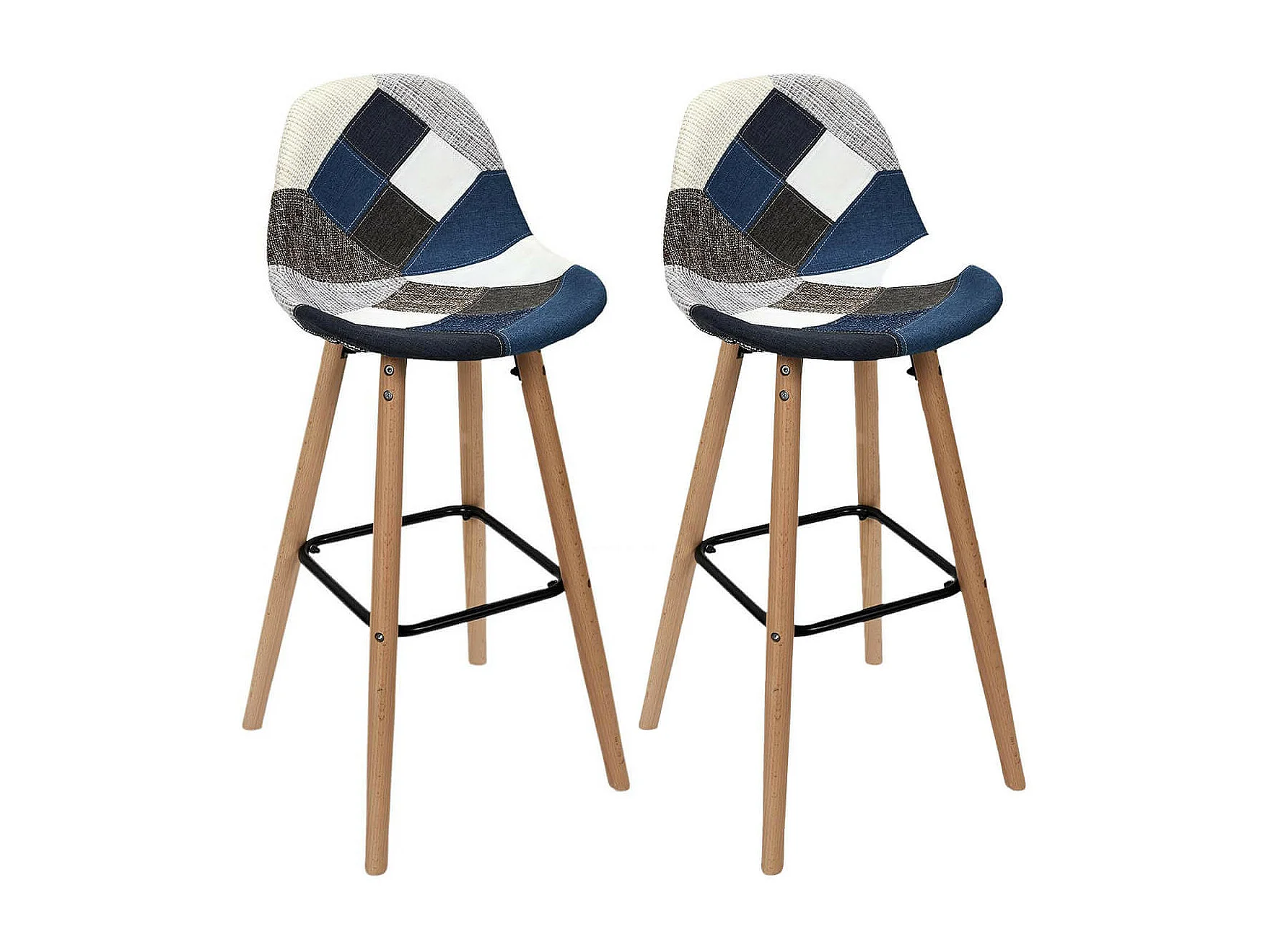 Lot 2 chaise de bar 67cm patchwork tissu large siège rembourré pieds bois SLICK (bleu)