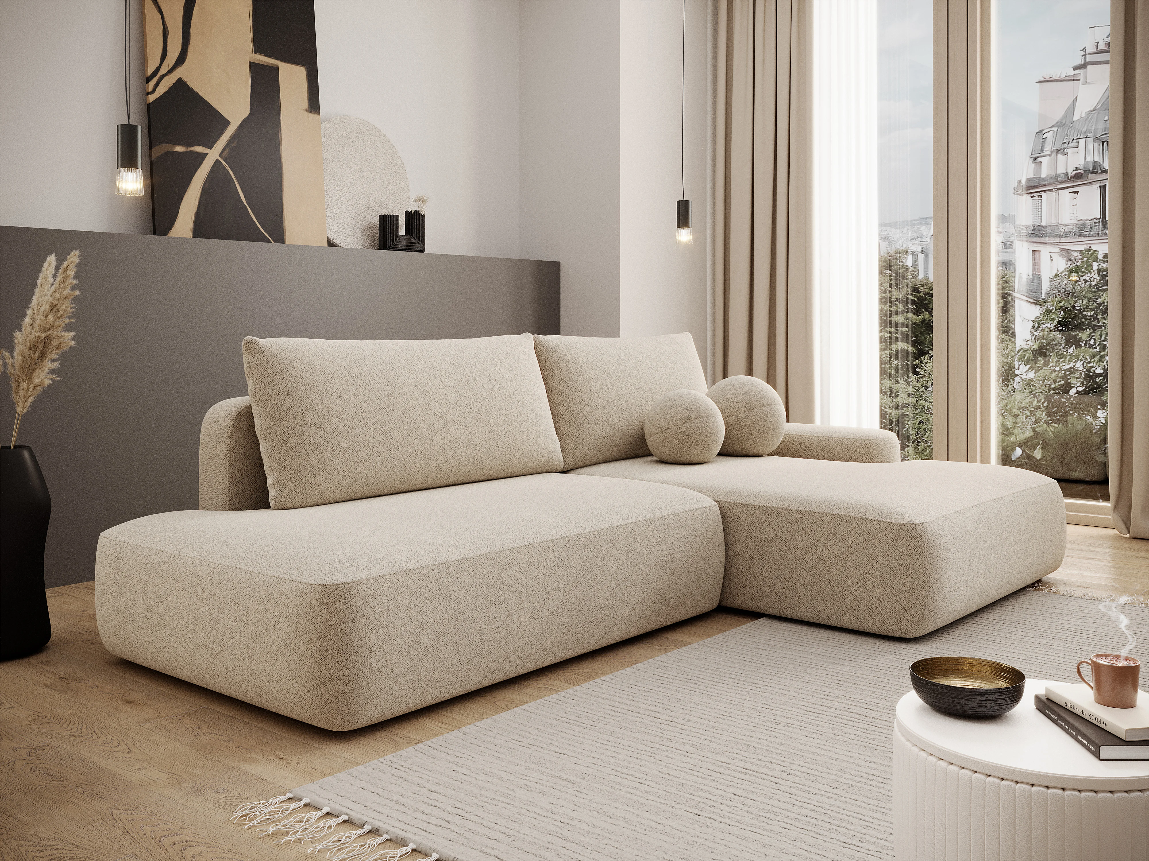 Canapé d'angle droit ouvert convertible en tissu chiné crème DAVISO