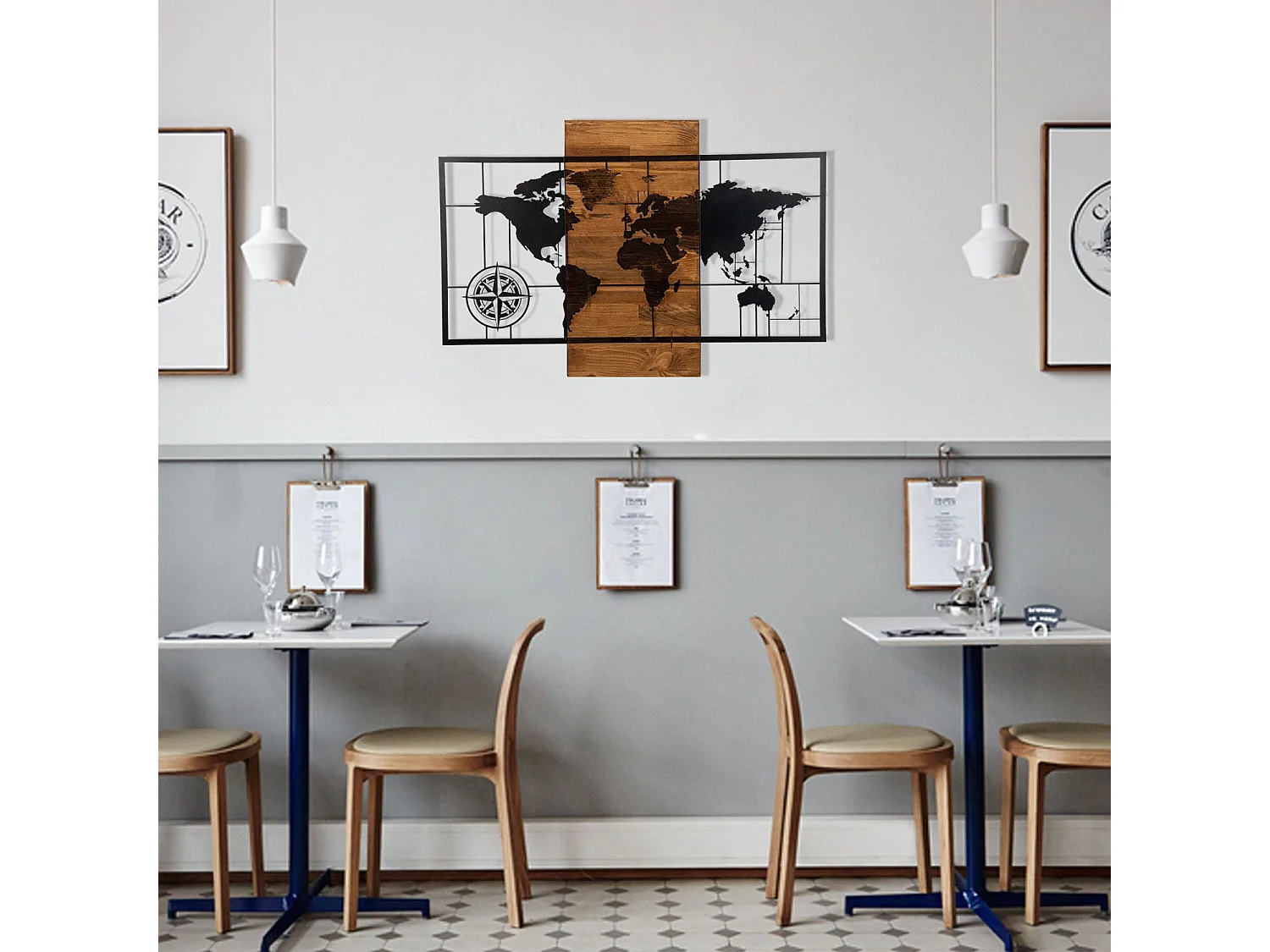 Décoration murale mappemonde avec points cardinaux Chiara L85xH58cm Bois foncé et Métal Noir