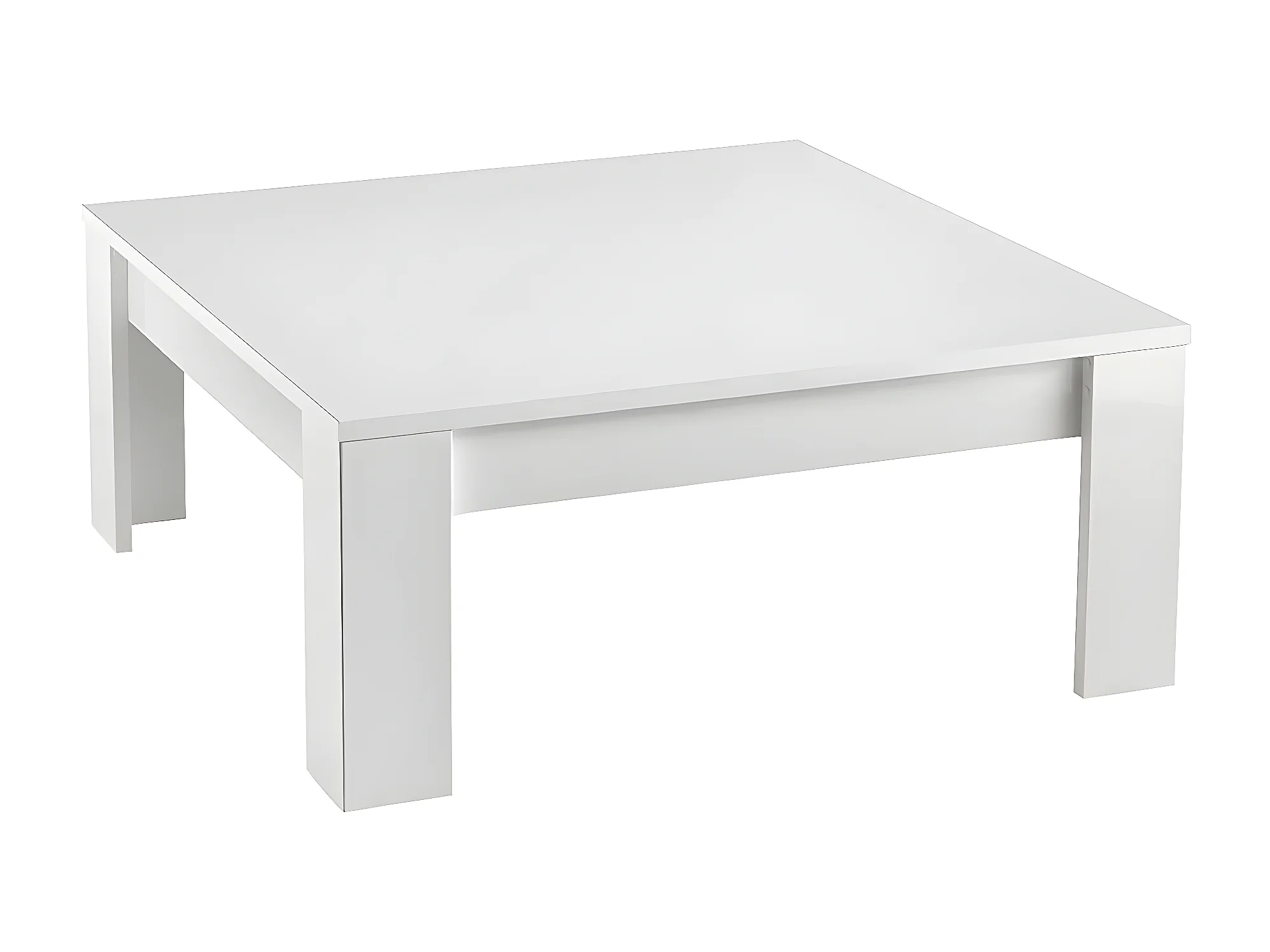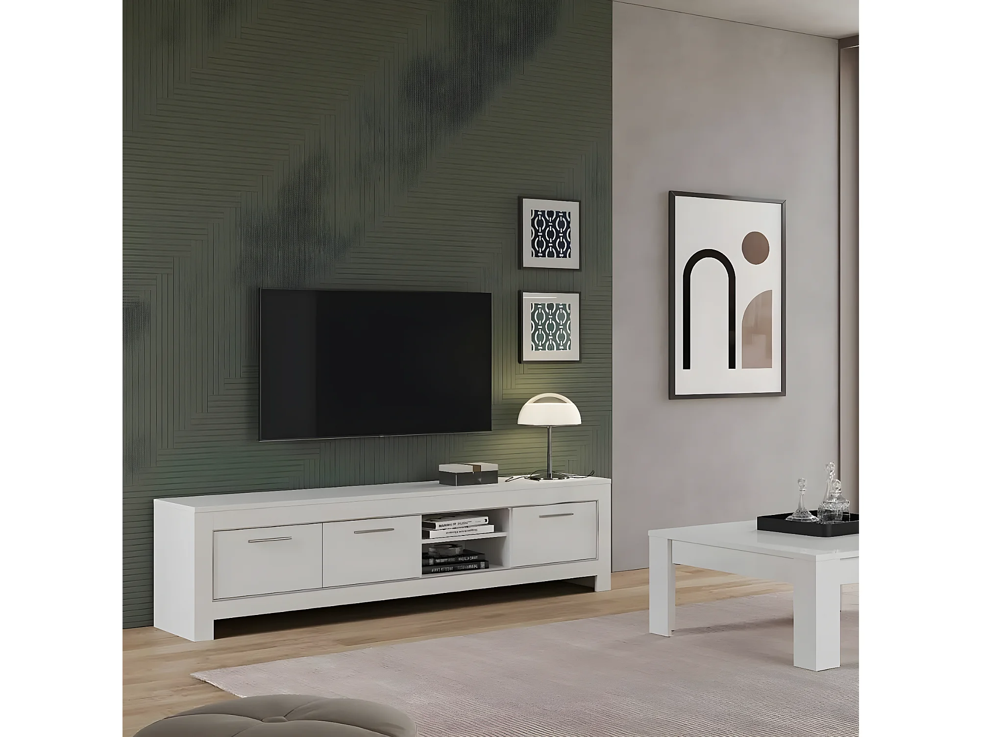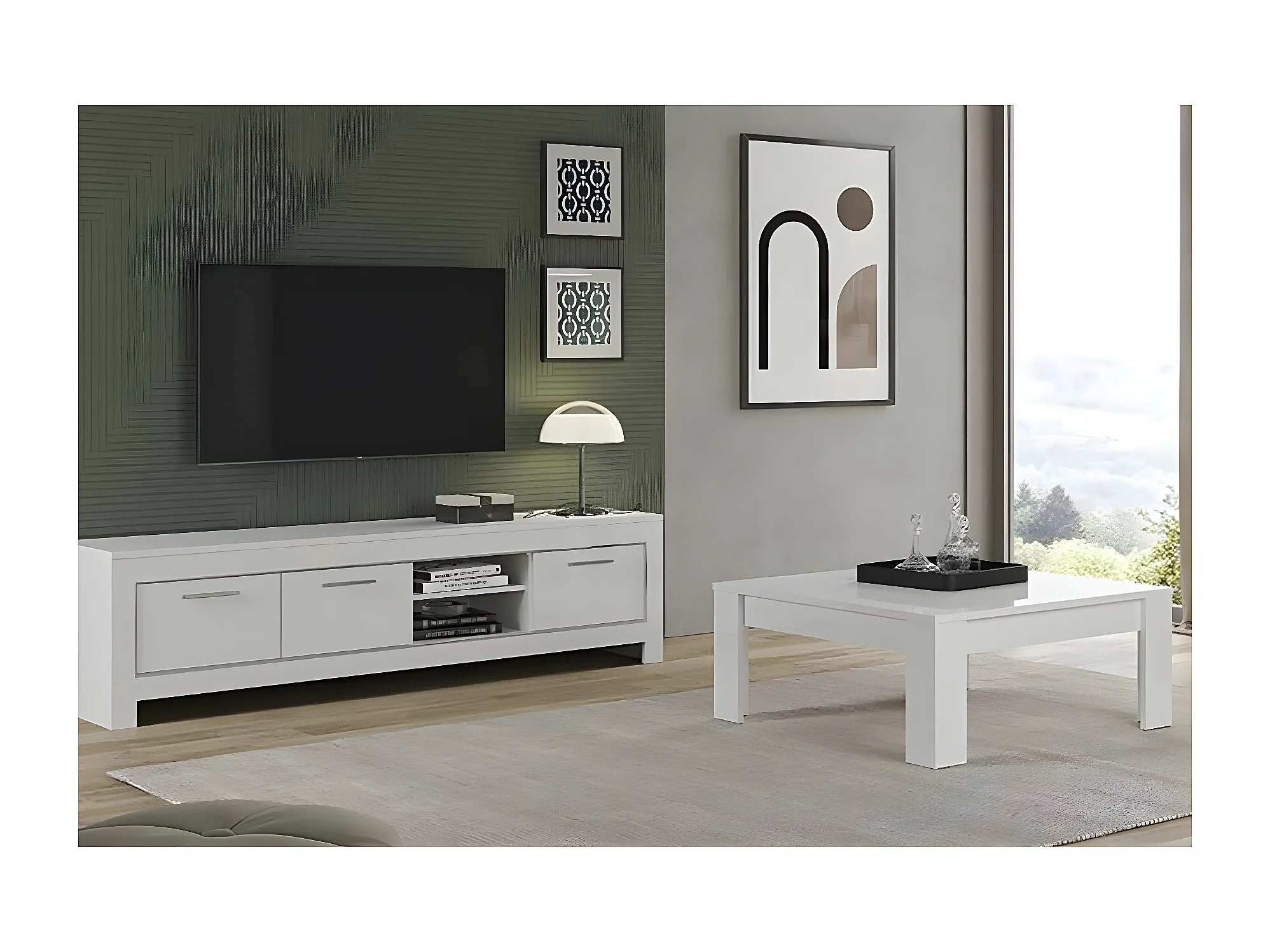 DENAE - Ensemble Salon Laqué Blanc Brillant Meuble TV 3 Portes + Table Basse Carrée