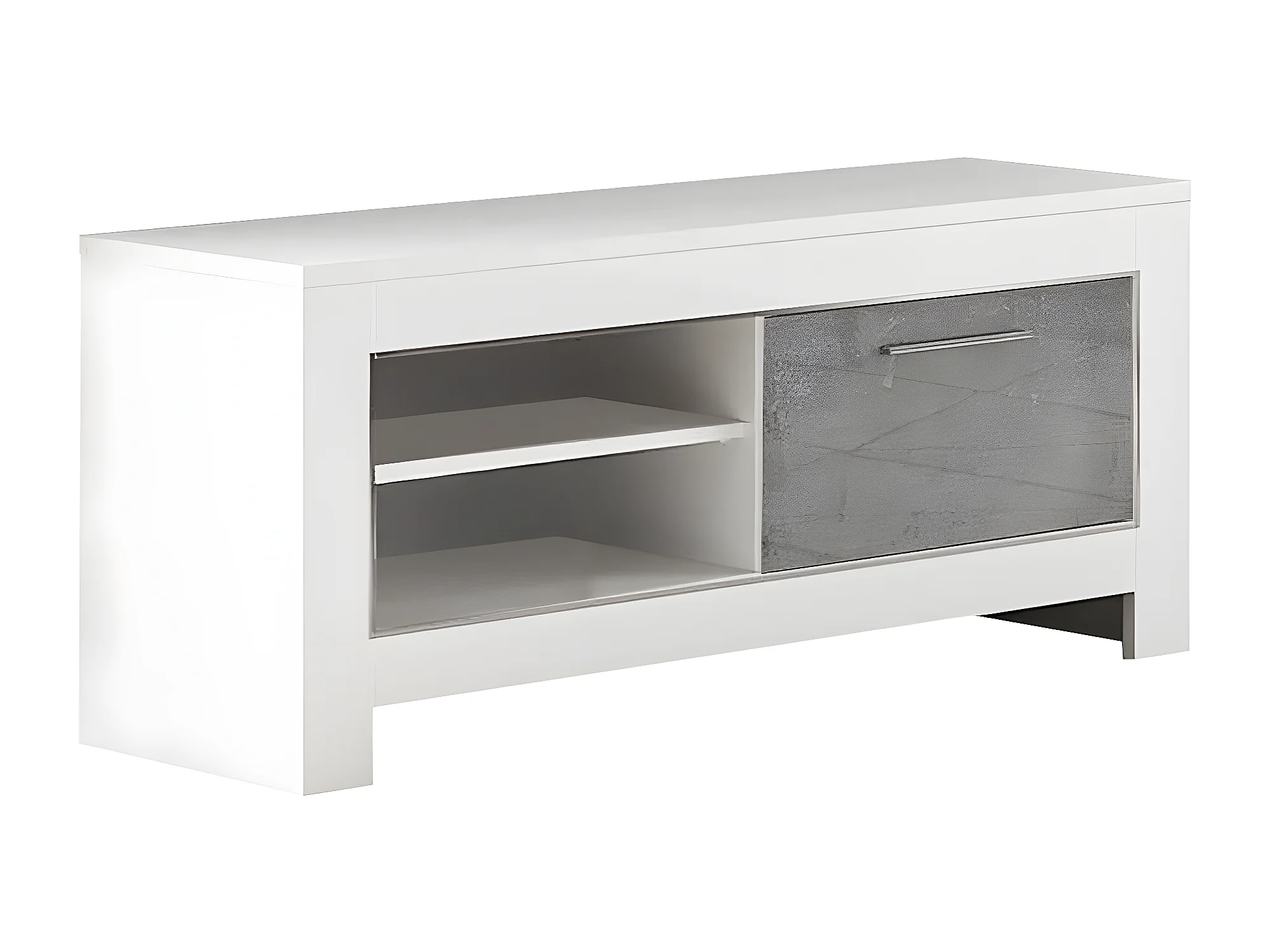 DENAE - Meuble TV 1 Porte L112cm Laqué Blanc Brillant et Gris Marbré