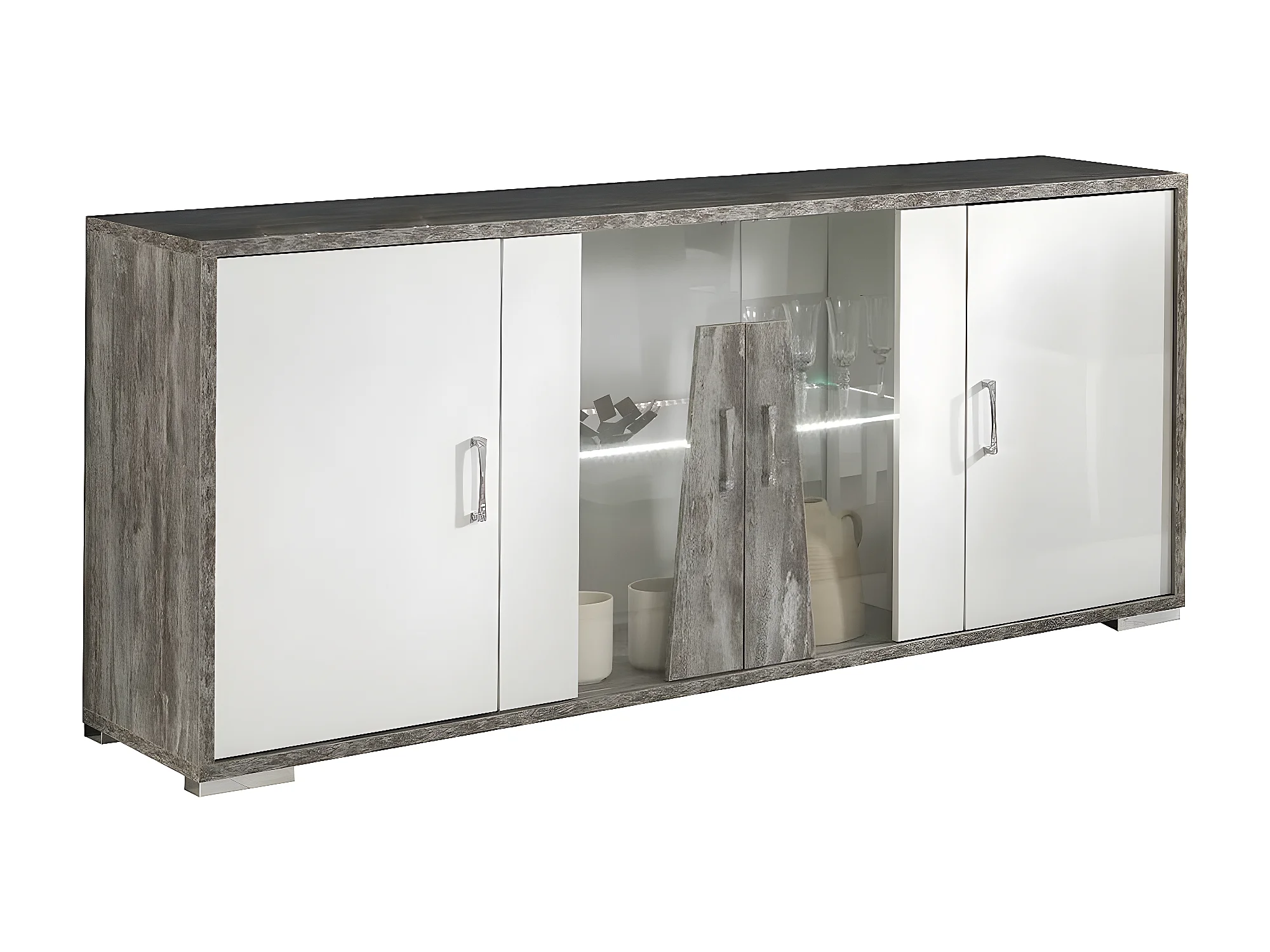 DENYS - Buffet 4 Portes Laqué Blanc et Effet Bois Taupe avec Led
