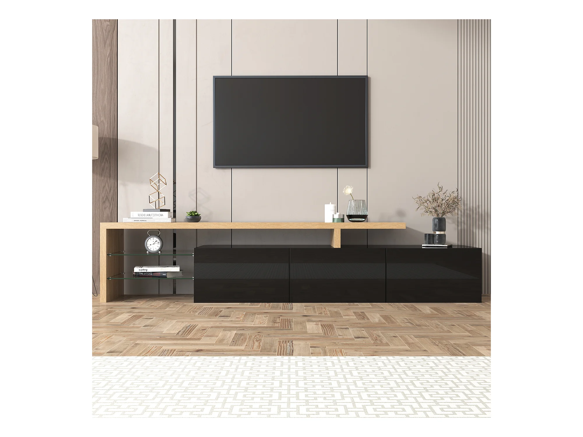 Design de meuble TV moderne noir brillant aspect bois éclairage LED avec 3 portes battantes et étagères en verre rangement NIKRID