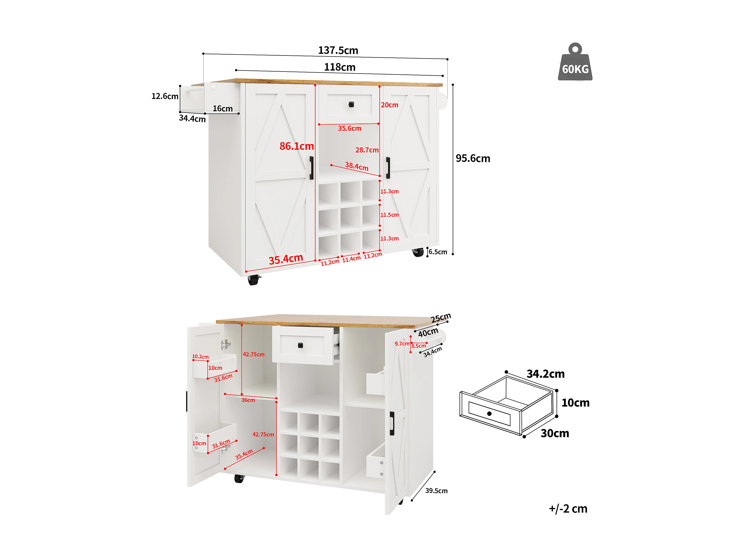 Desserte de cuisine (118×40×95.6 cm) moderne avec rangements, plateau extensible et étagères à snacks – naturel+blanc