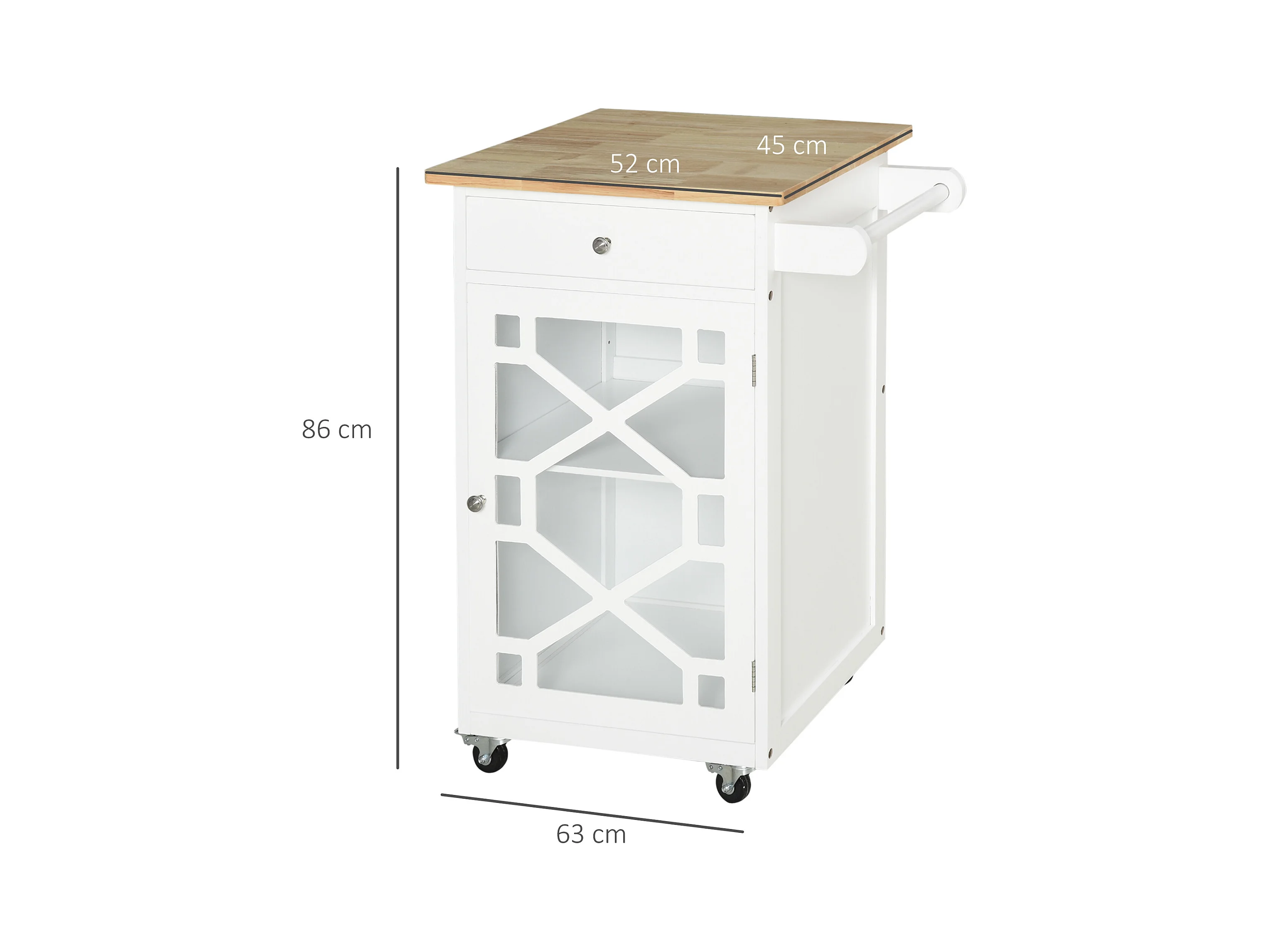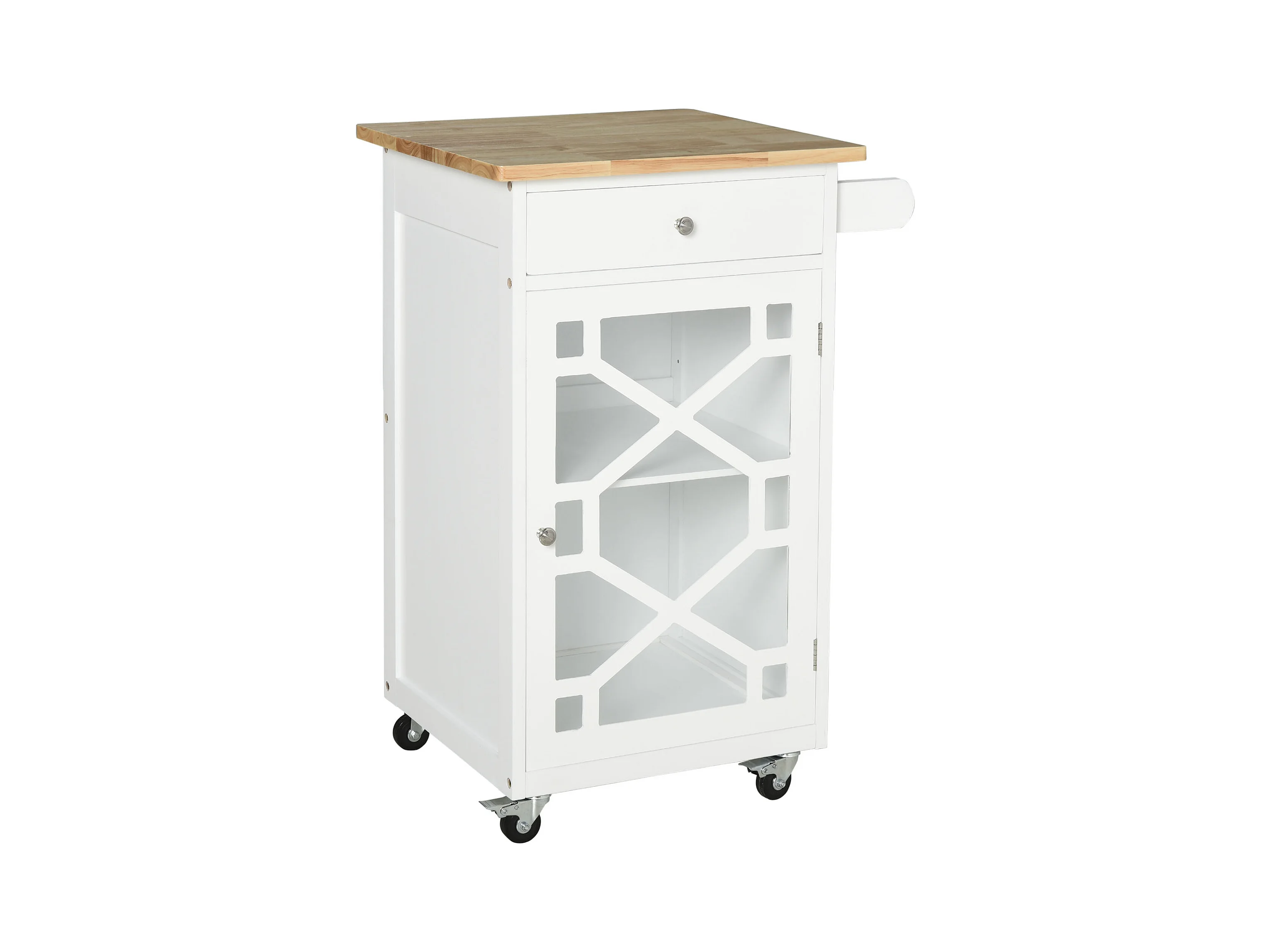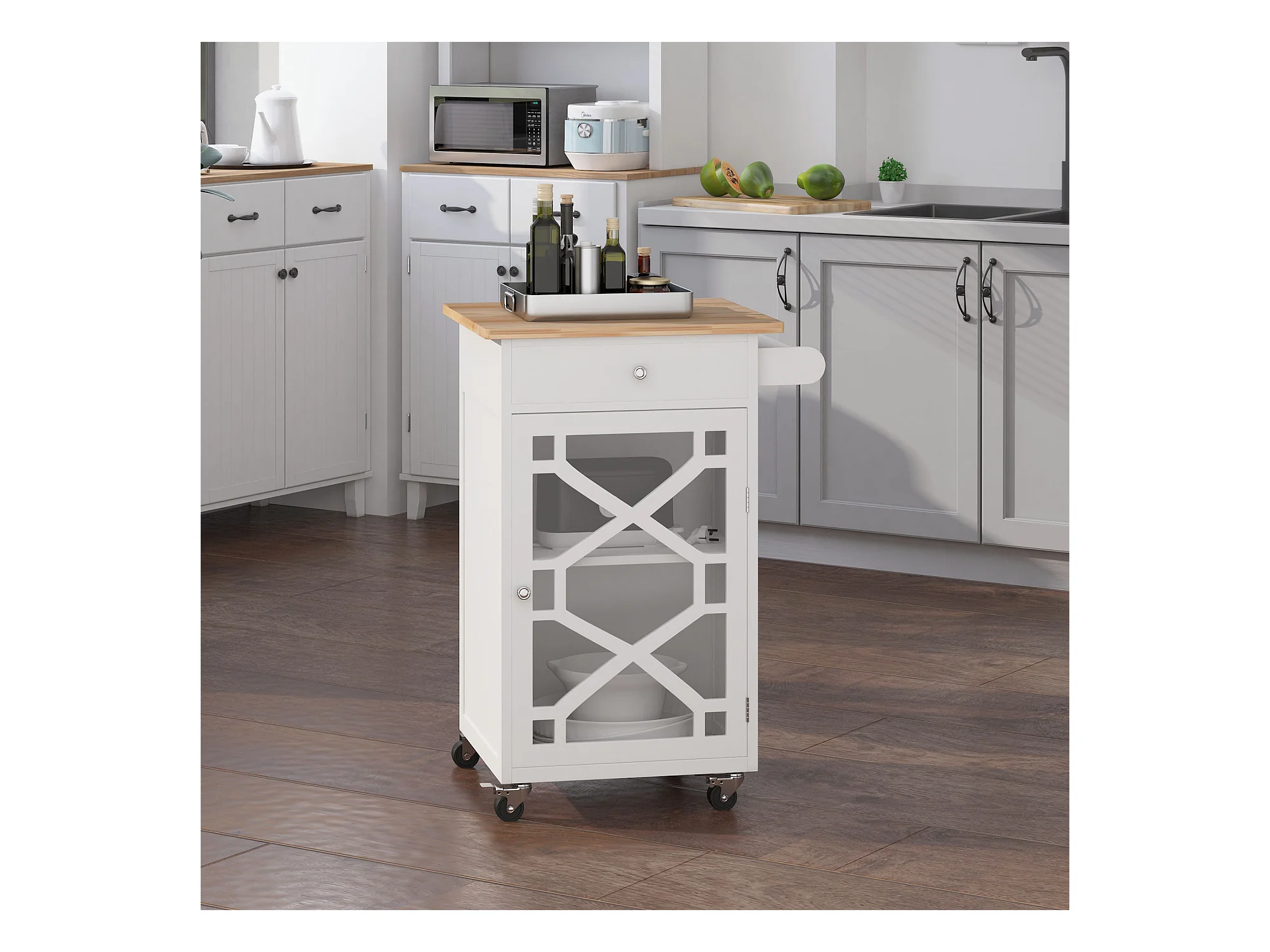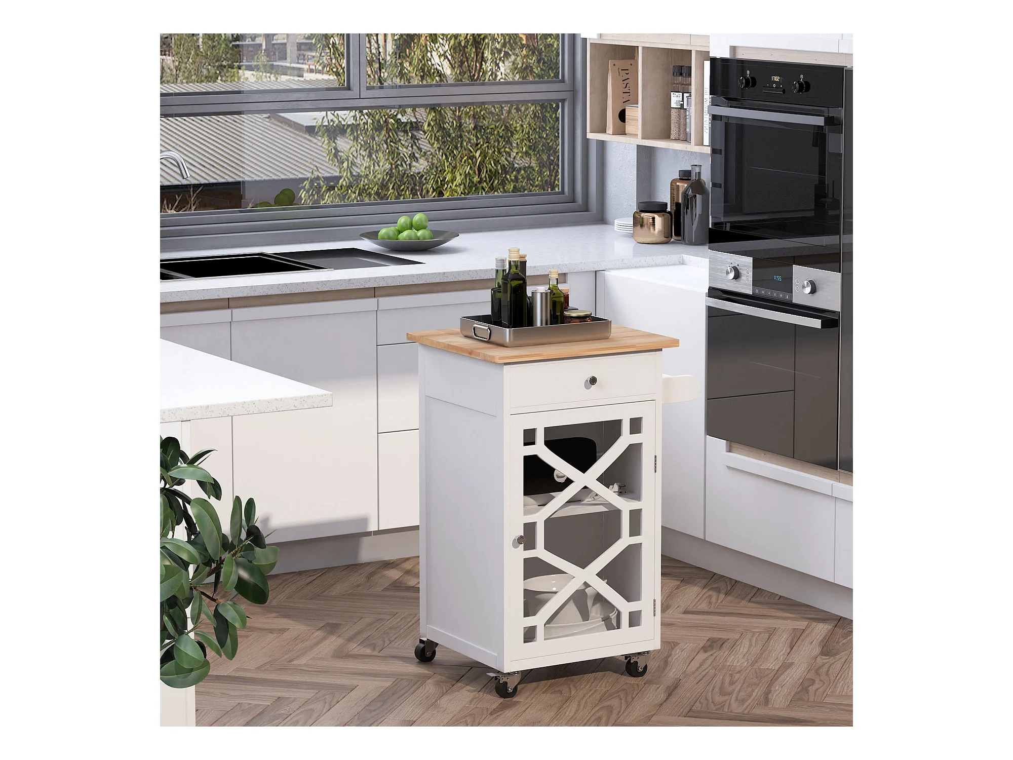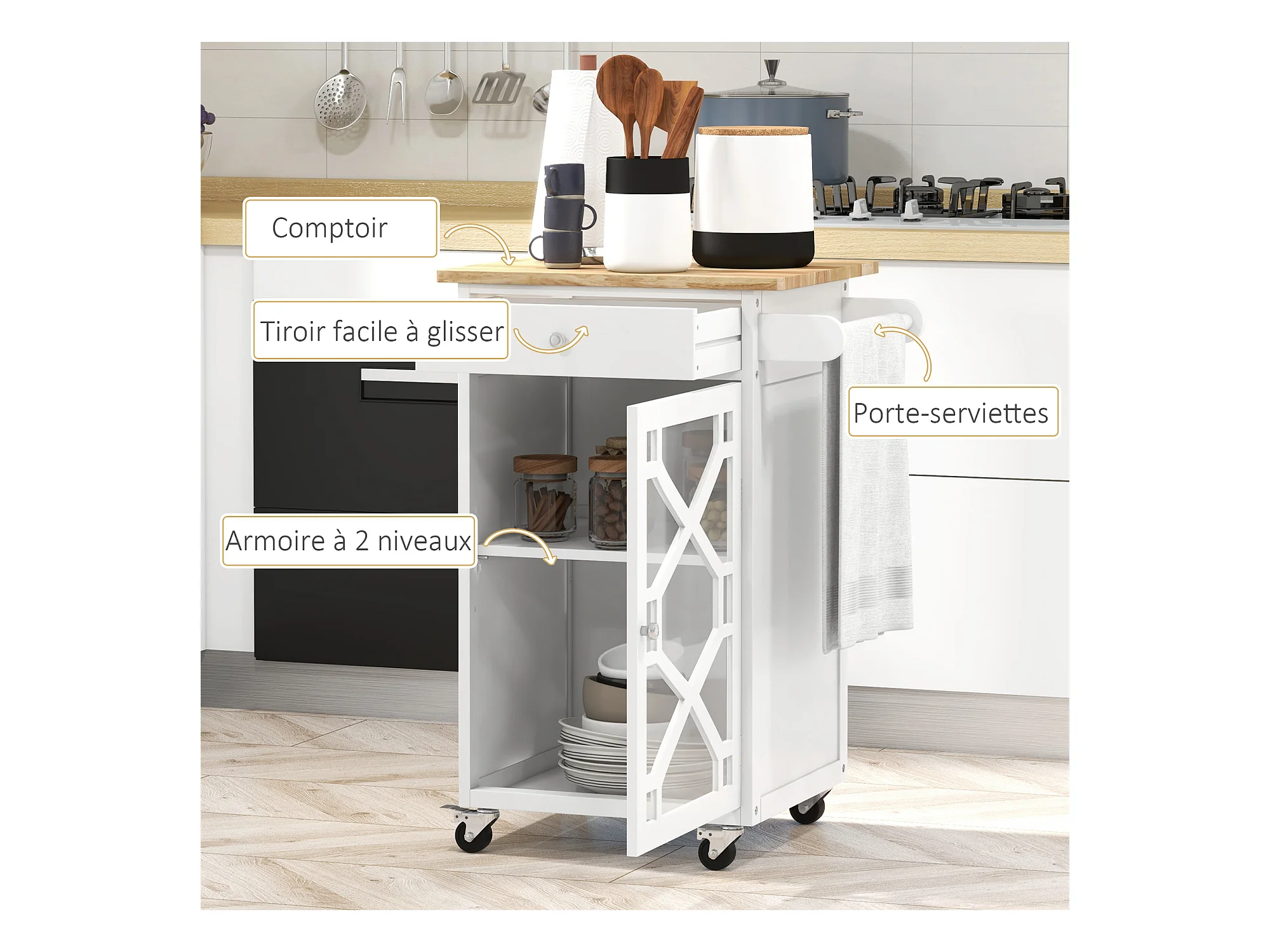 Desserte de cuisine à roulettes - tiroir, placard, porte-serviette - MDF blanc plateau bois hévéa