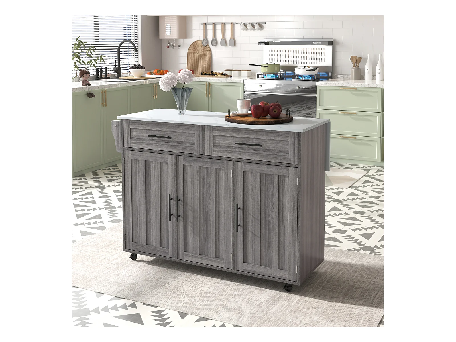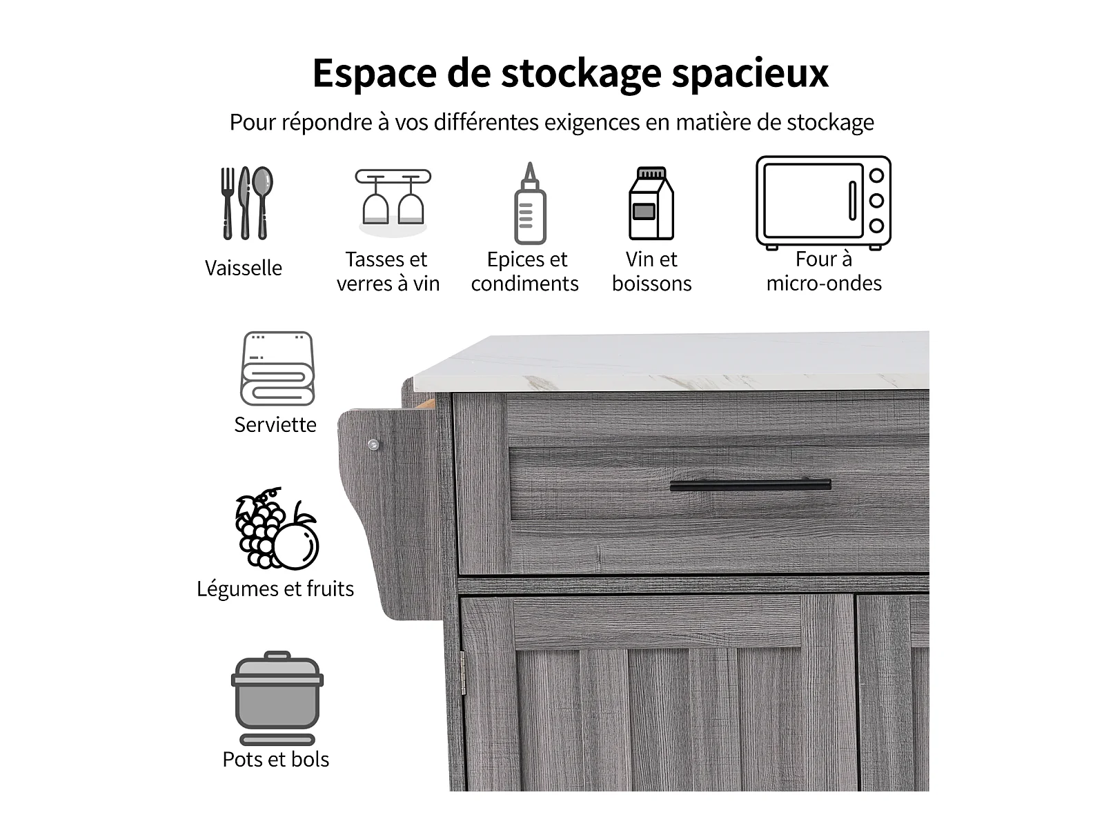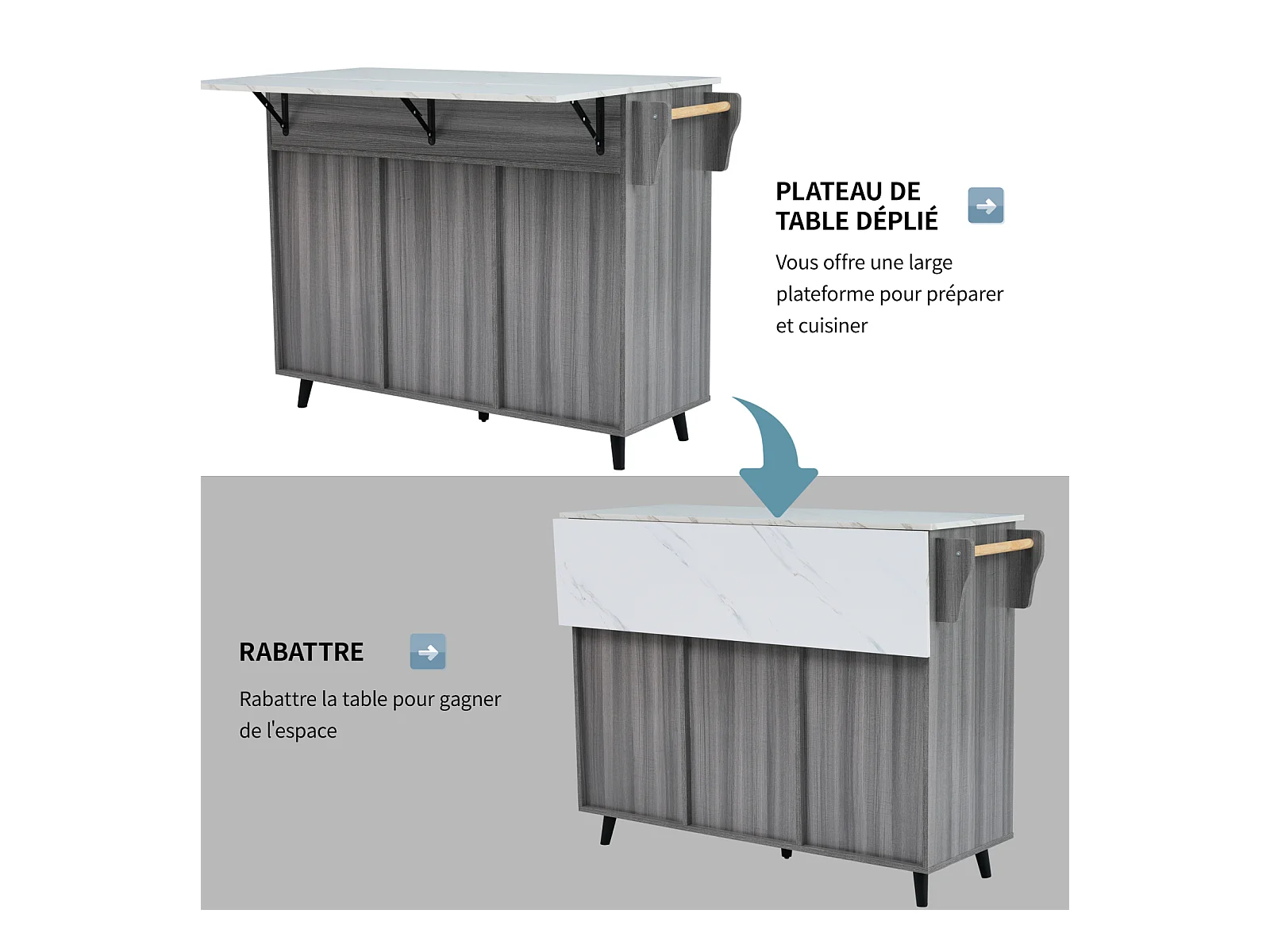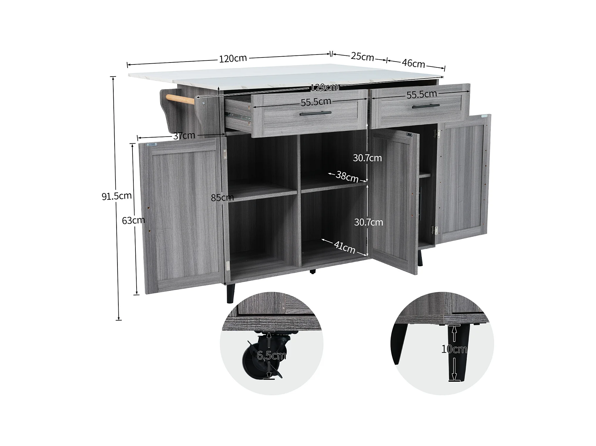 Desserte de cuisine, Chariot de table 129x76x91,5cm, plateau rabattable, étagères intérieures, îlot de cuisine, blanc + gris kaki