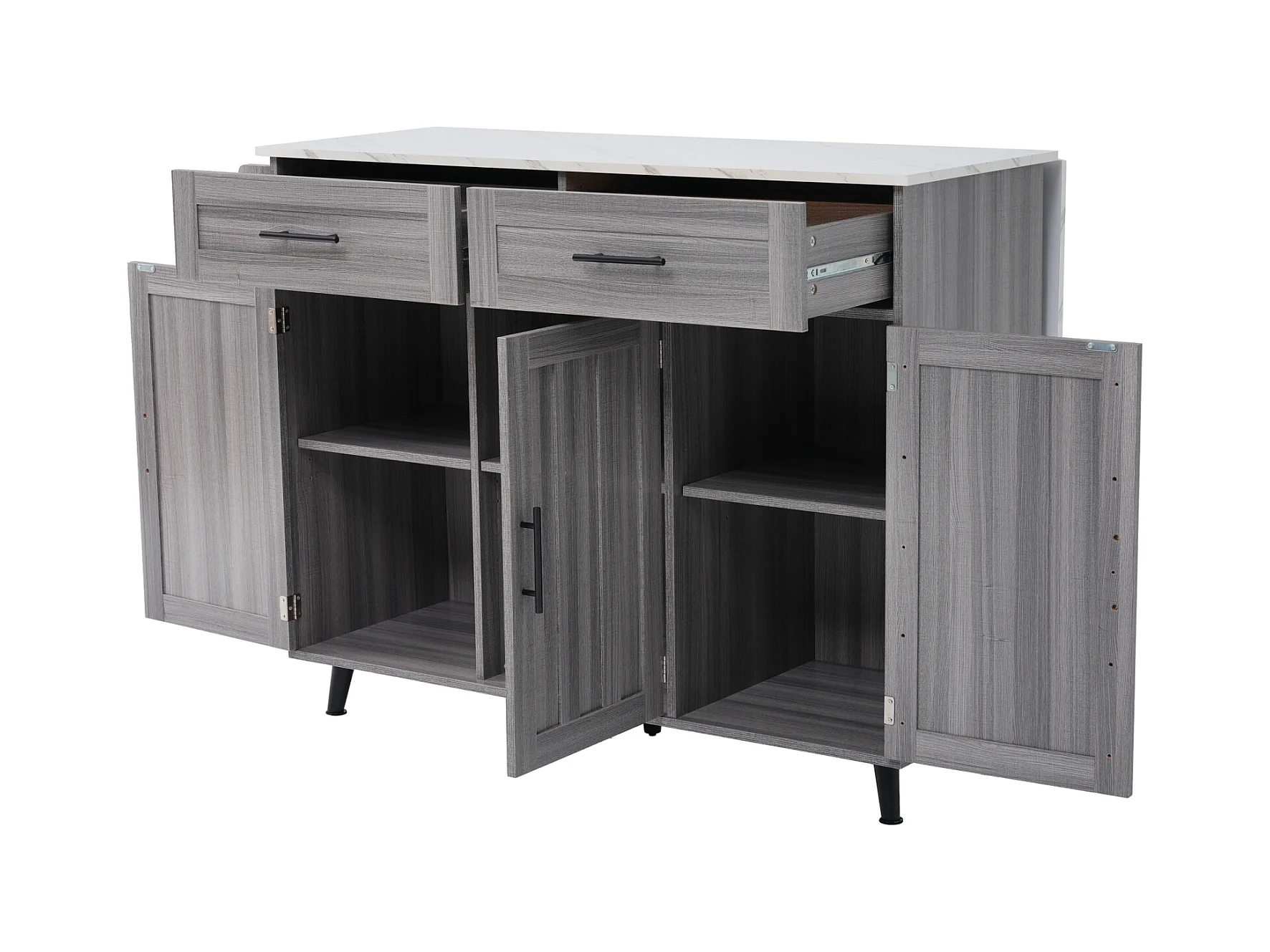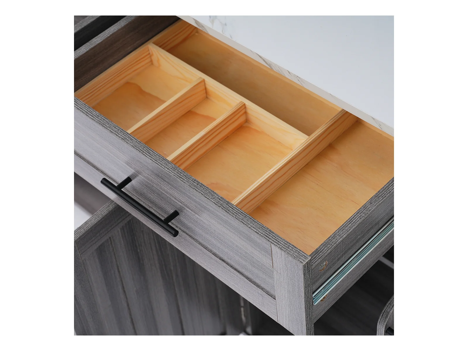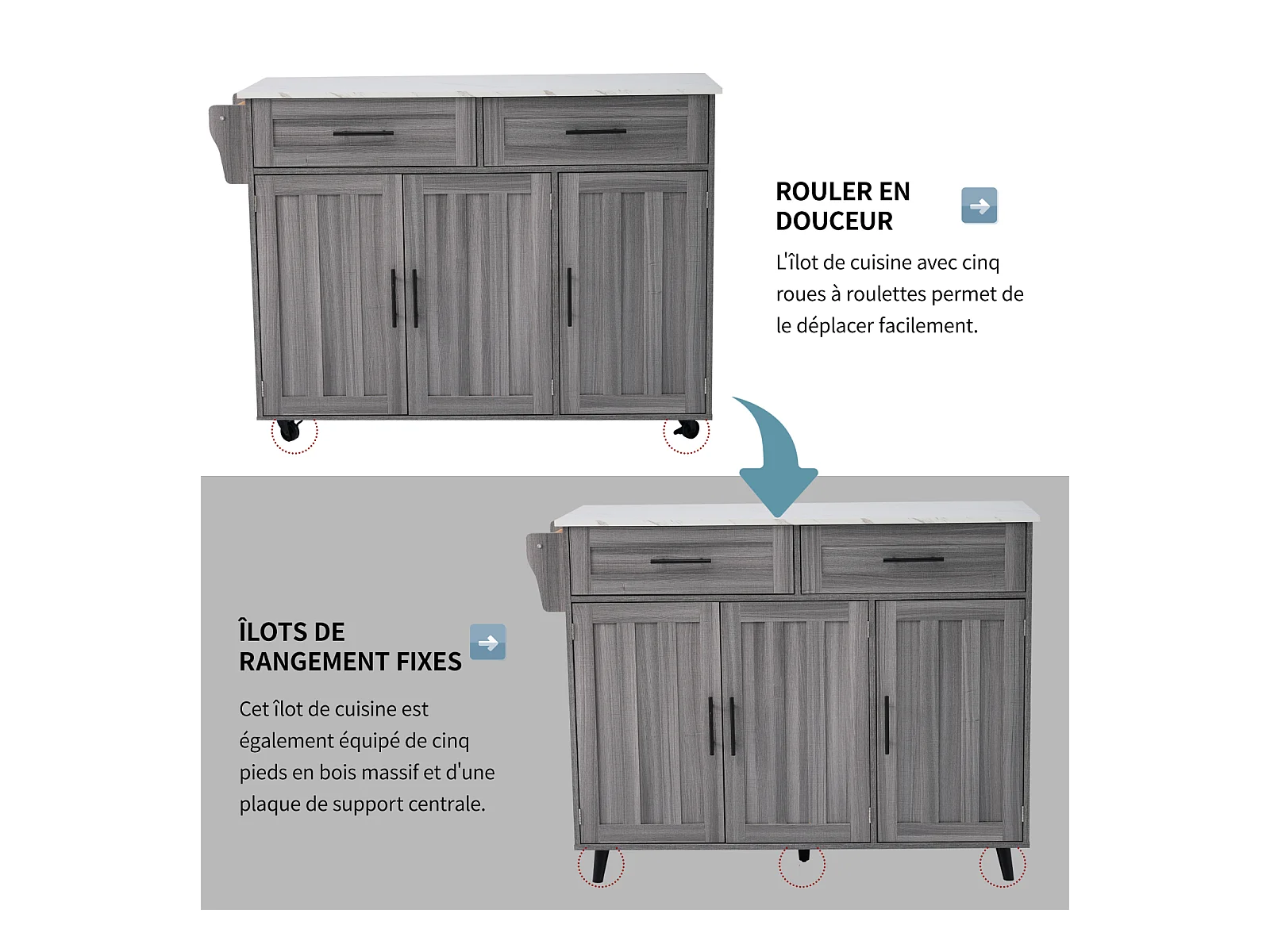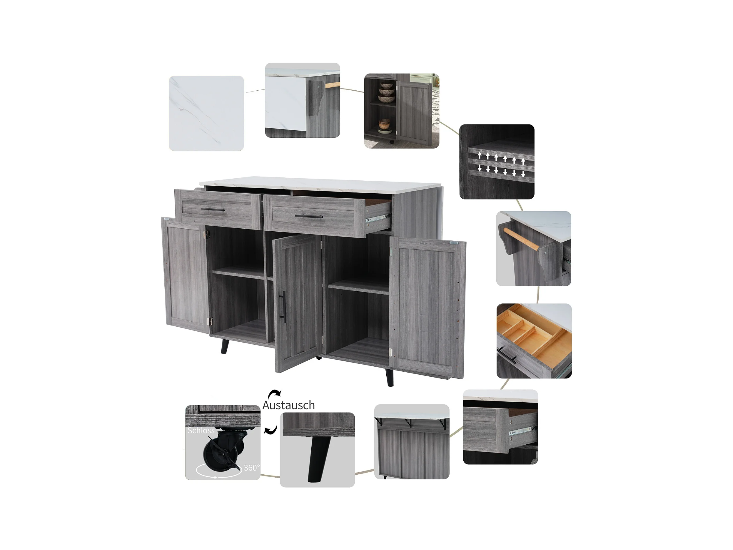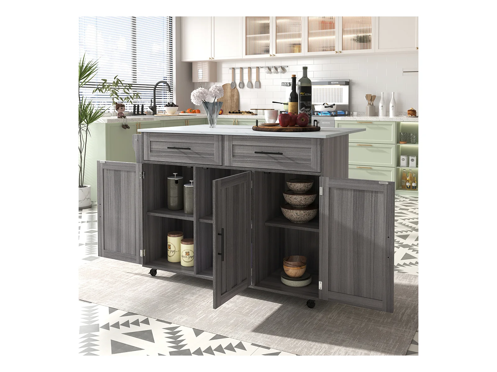 Desserte de cuisine, Chariot de table 129x76x91,5cm, plateau rabattable, étagères intérieures, îlot de cuisine, blanc + gris kaki