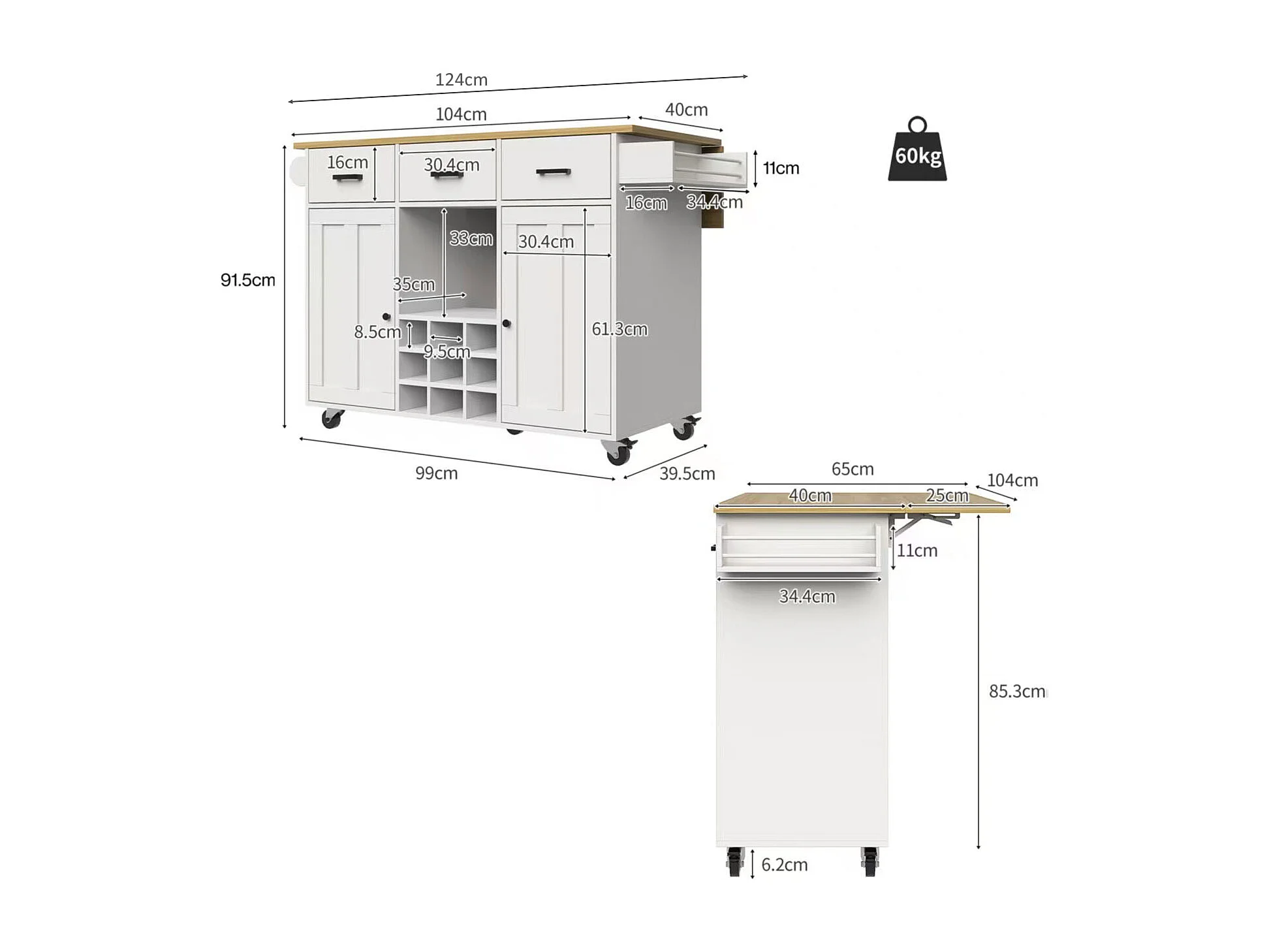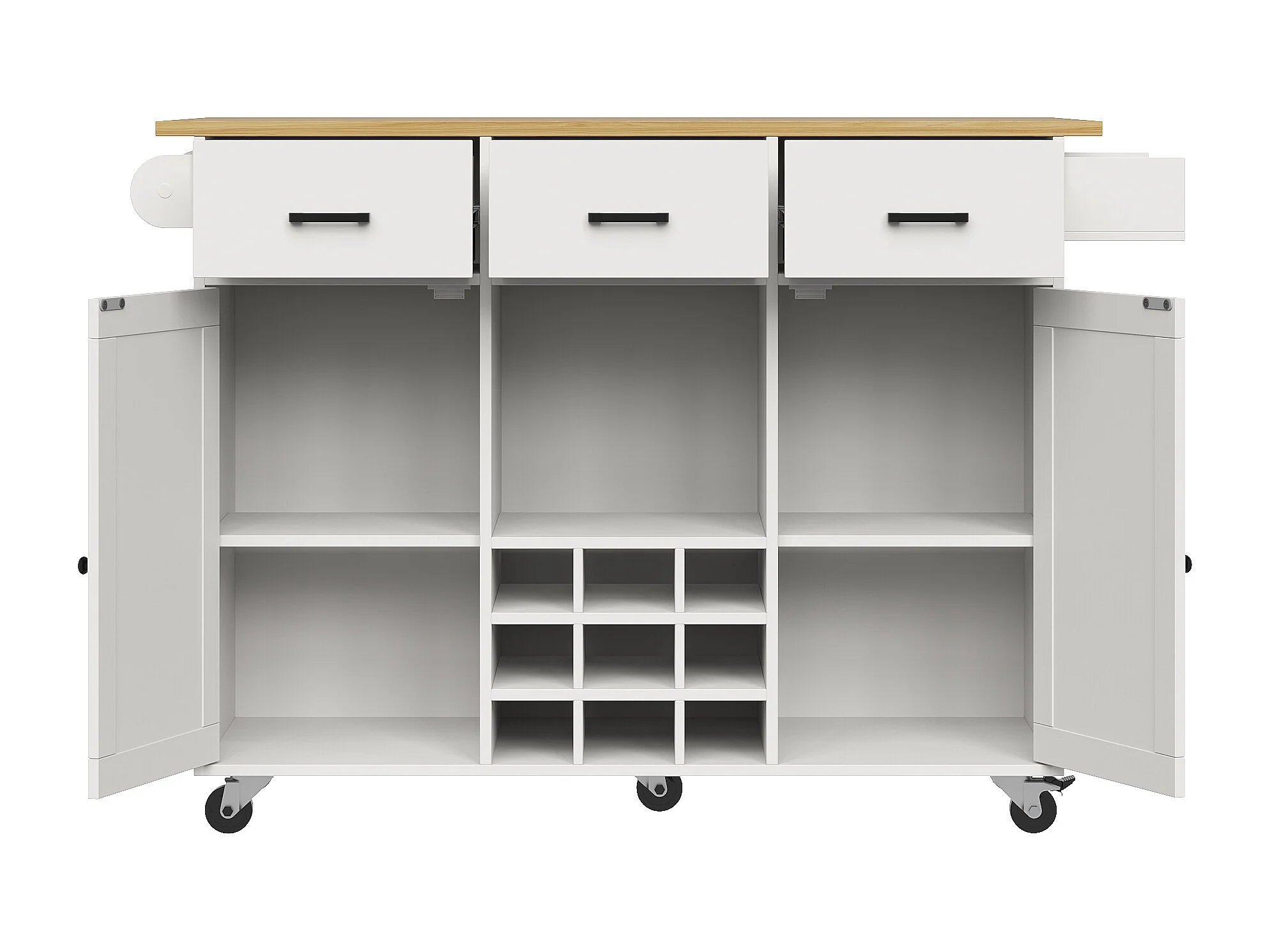 Desserte de cuisine pliable (104×40×91,5 cm), avec tiroirs, casier à vin et grand espace de rangement, blanc