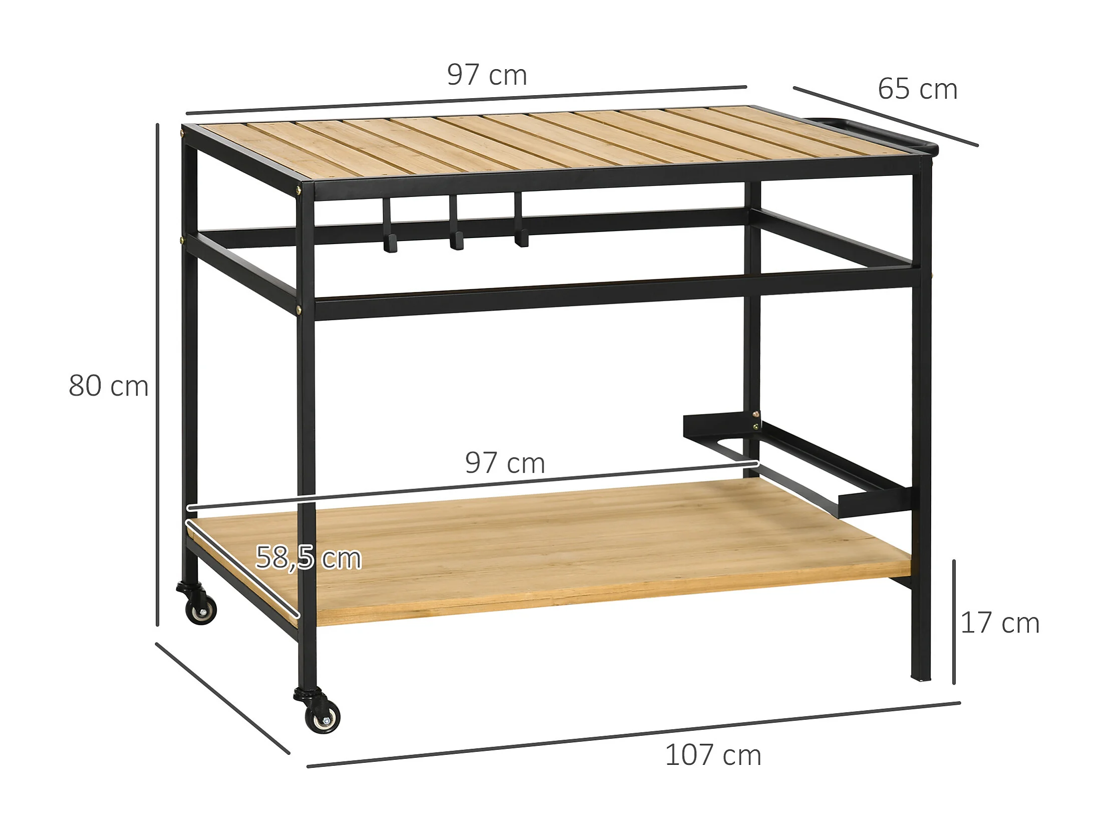 Desserte de jardin chariot pour plancha barbecue en bois et métal avec 2 étagères et 3 crochets - 107 x 65 x 80 cm noir naturel