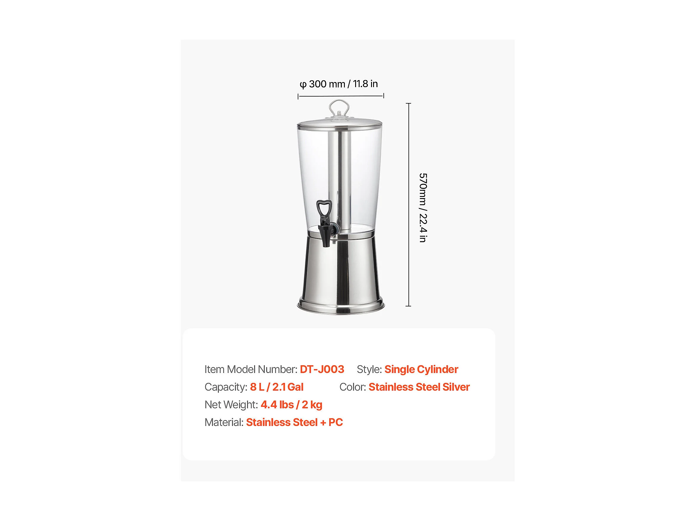 Distributeur de Boissons SucceBuy, Capacité 8 L, Fontaine à Eau en Acier Inoxydable et Plastique, Distribution de Jus Limonade Thé Glacé, Cafés