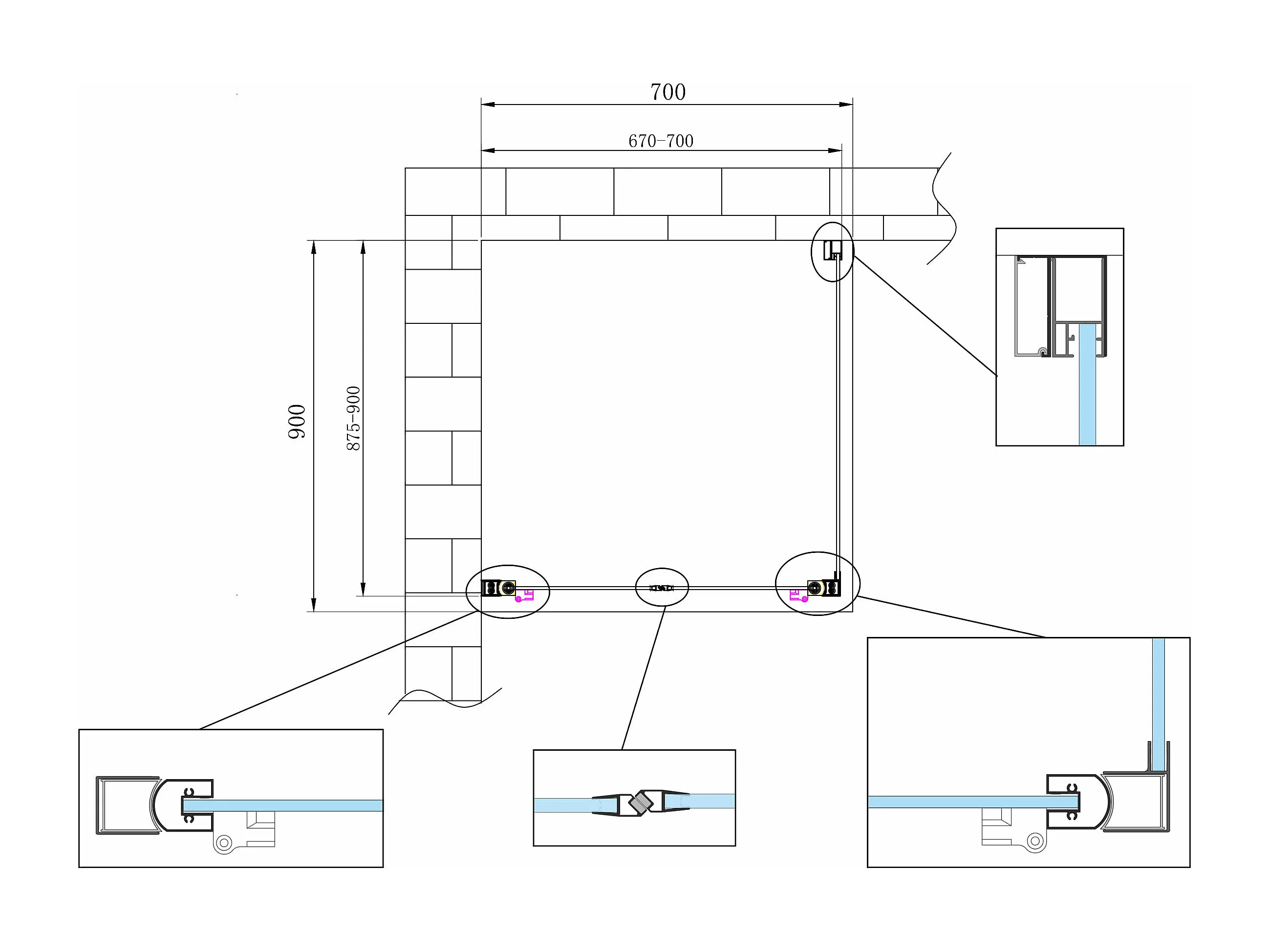 Douche de 6 mm avec un paroi fixe laterale et porte type saloon (receveur non inclu) – 87,5-90 fixe x 67-70 saloon