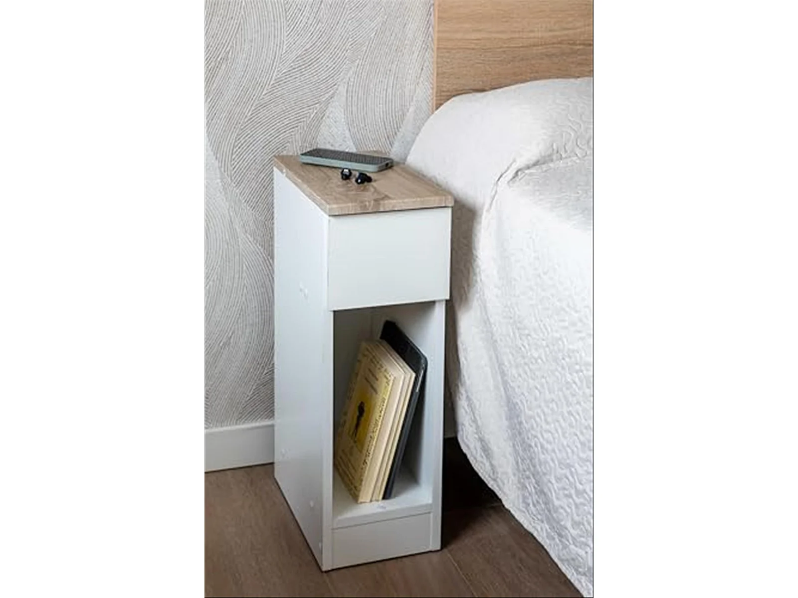 DUPI Mesita de Noche Estrecha Slim para Espacios reducidos. Optimiza el Almacenamiento y Ofrece funcionalidad. (Blanco)