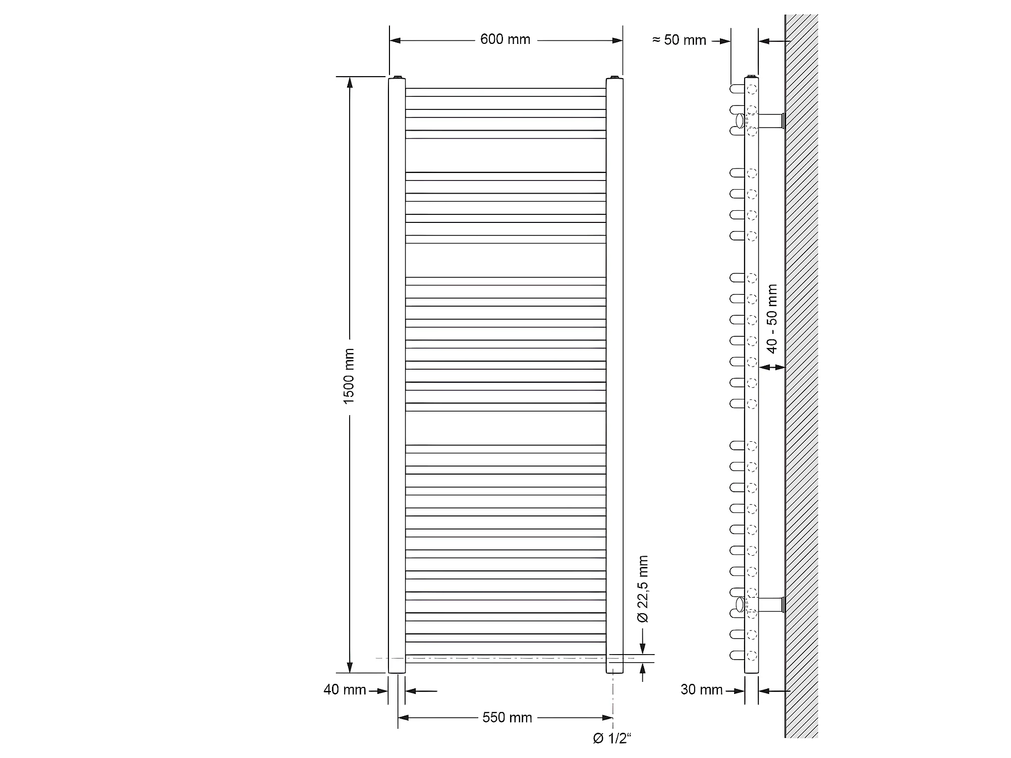 ECD Germany Radiateur Sèche-Serviettes Sahara - 600 x 1500 mm - Blanc - Courbé avec Raccordement Latéral - Radiateur Sèche Serviette Salle de Bain - Pas Électrique