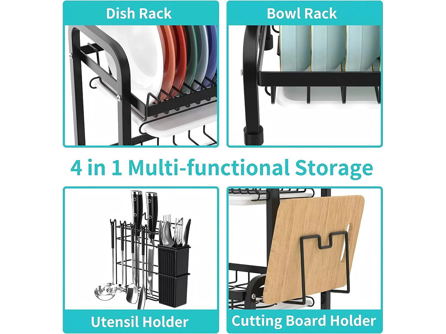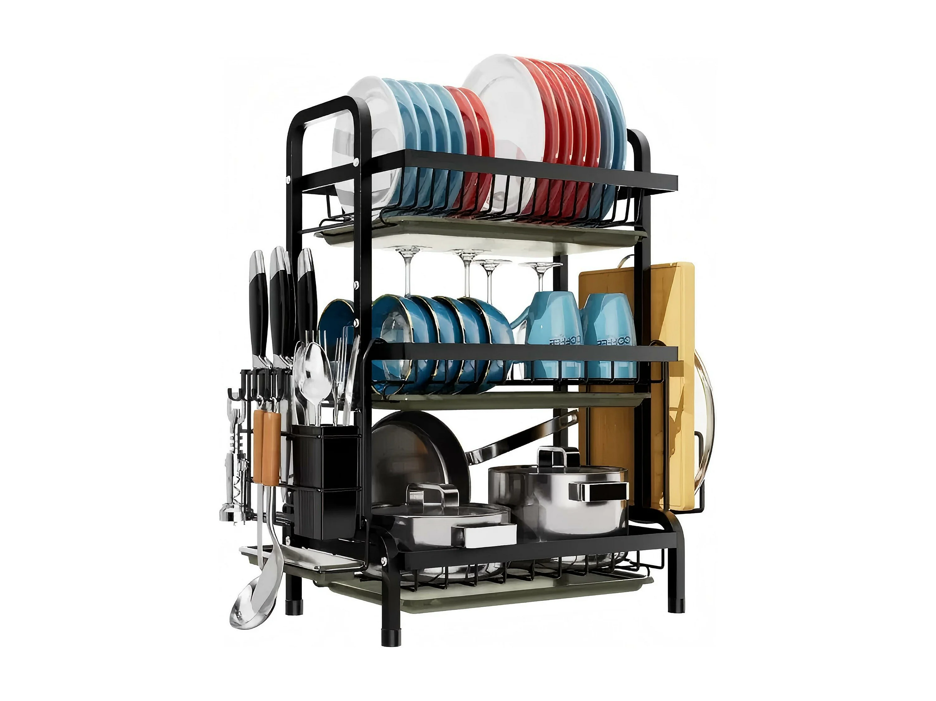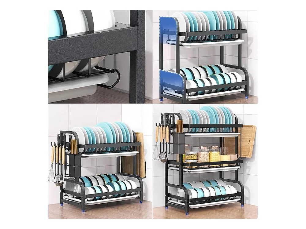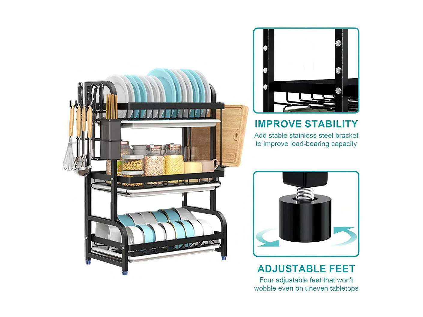 Egouttoir à vaisselle, 3 Niveaux, Grande Capacité, avec Support de Planche à découper, 4 Crochets, Rangement Vaisselle, 54 x 23 x 59cm