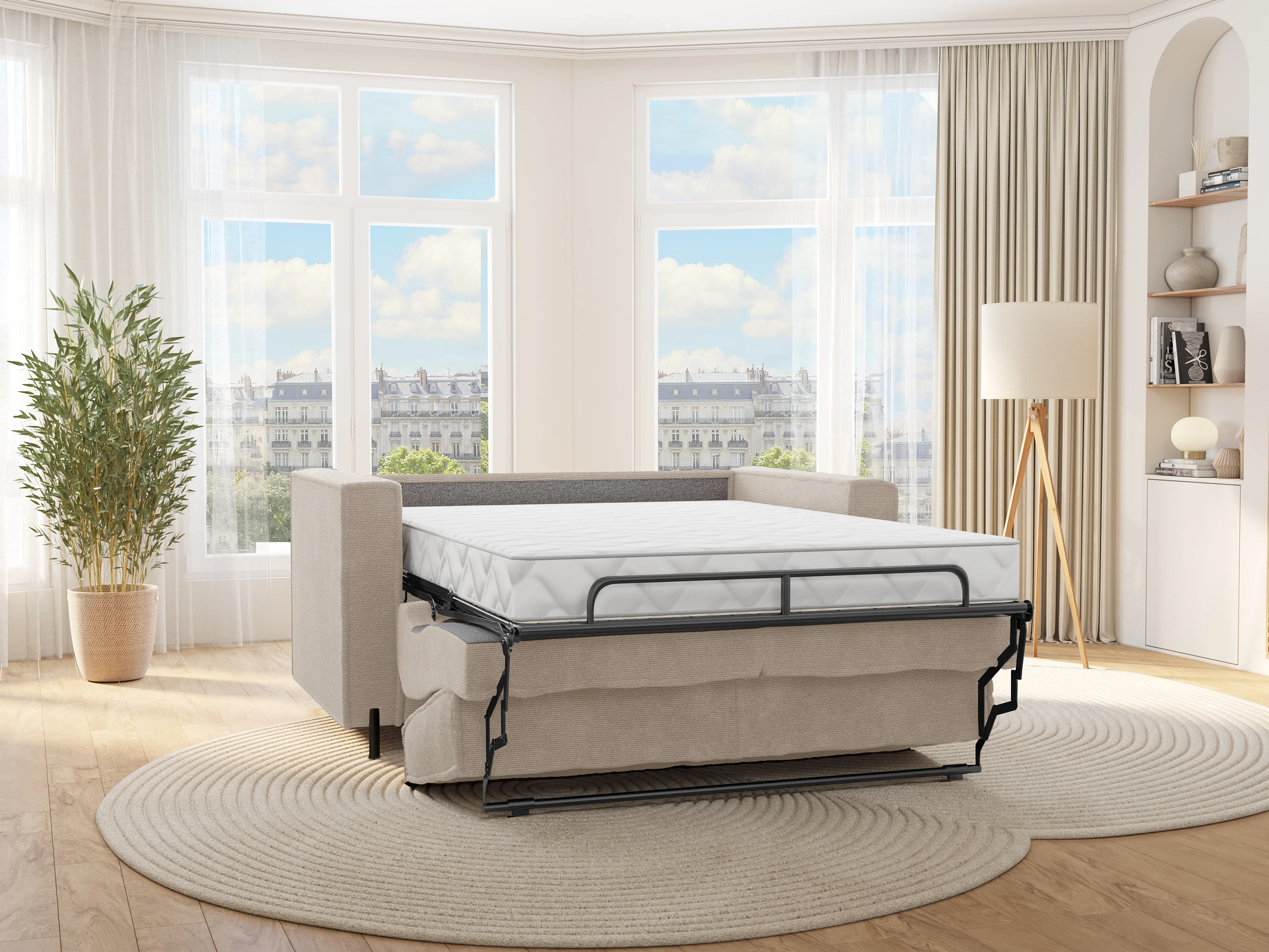 Canapé 3 places convertible express en tissu texturé beige - Couchage 140 cm - Matelas 14 cm - ELORYA