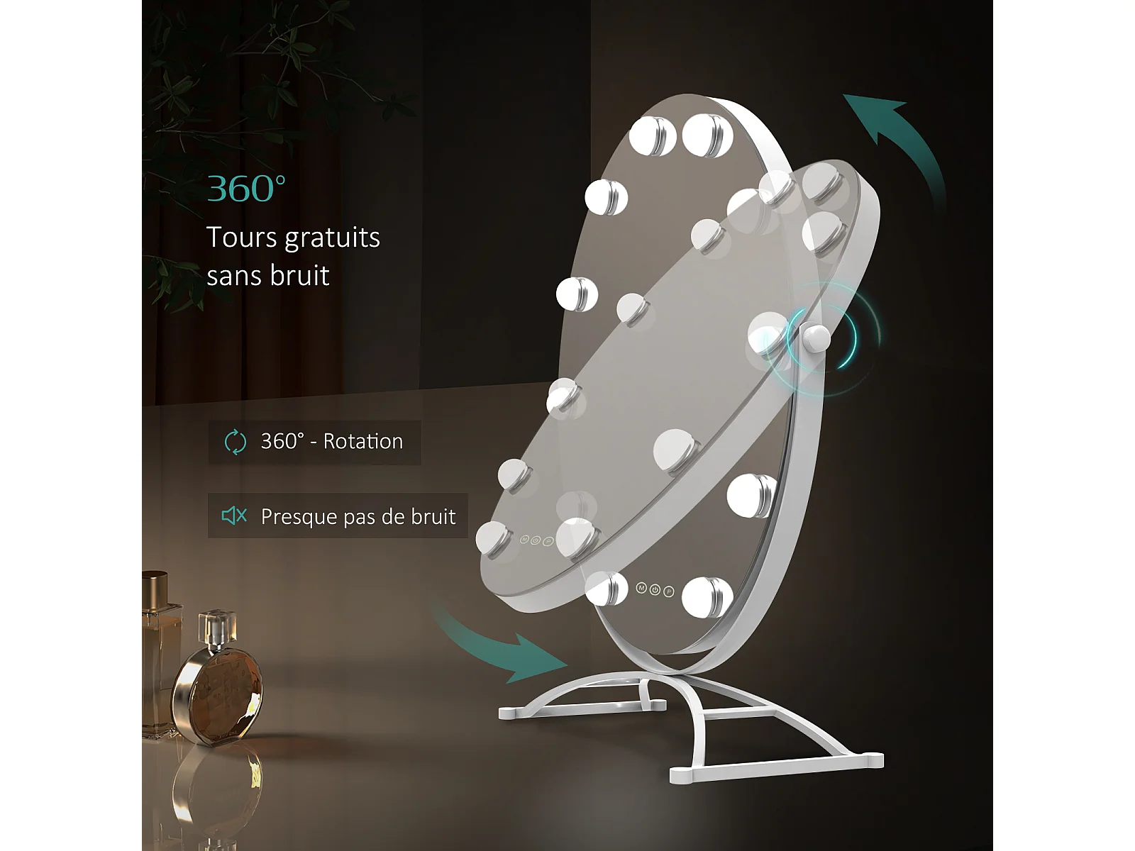 Miroir Maquillage Lumineux Hollywood 15 Ampoules,LED Miroir Coiffeuse Contrôle Tactile Luminosité Réglable sur Table et sur Mur 58x48cm - Blanc