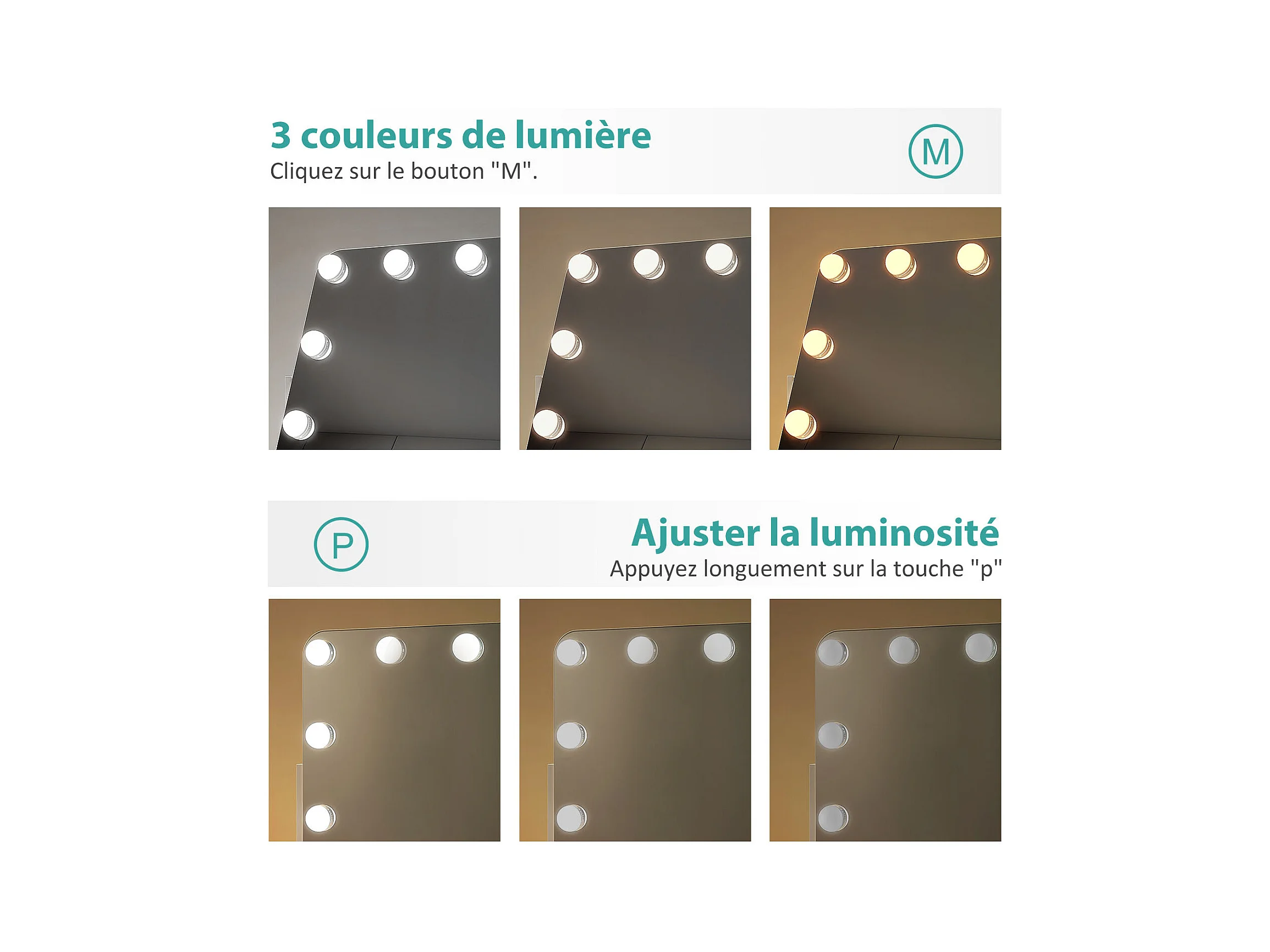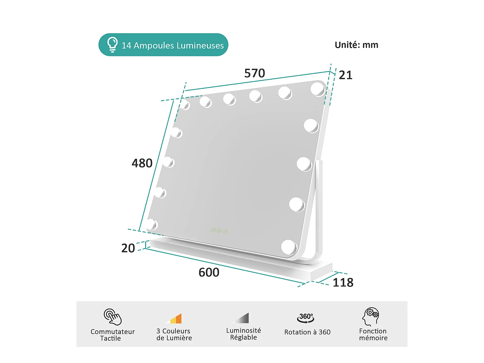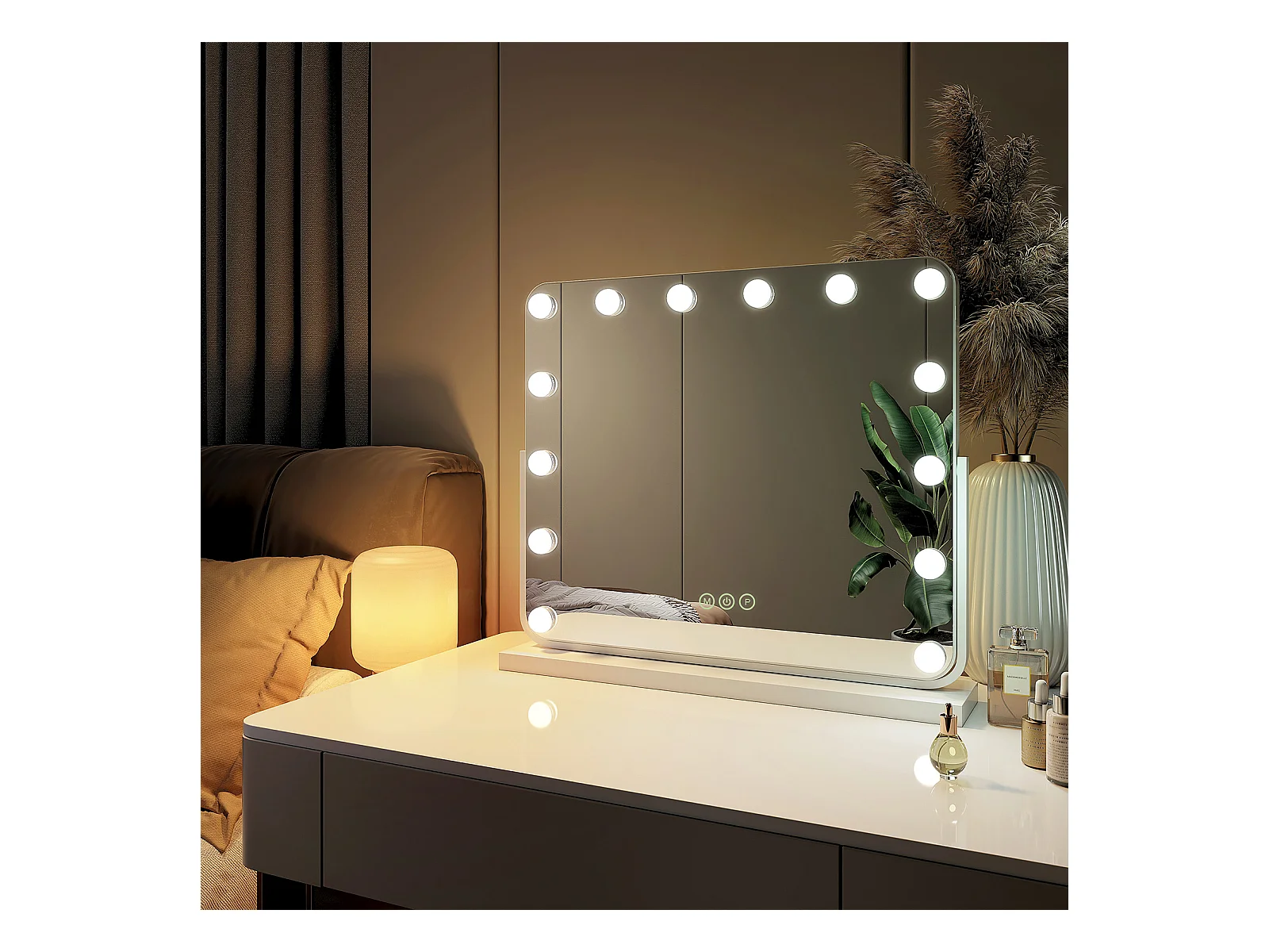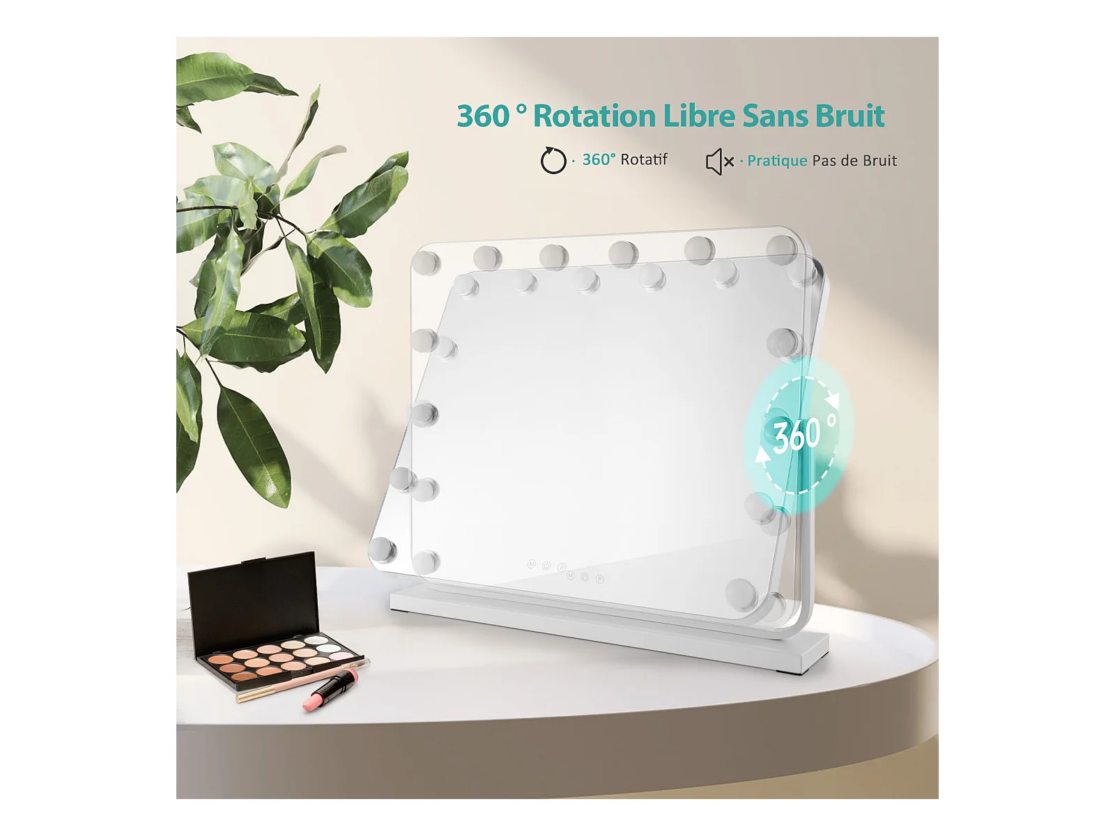 Miroir Maquillage Lumineux Hollywood 15 Ampoules,LED Miroir Coiffeuse Contrôle Tactile Luminosité Réglable sur Table et sur Mur 58x48cm - Blanc
