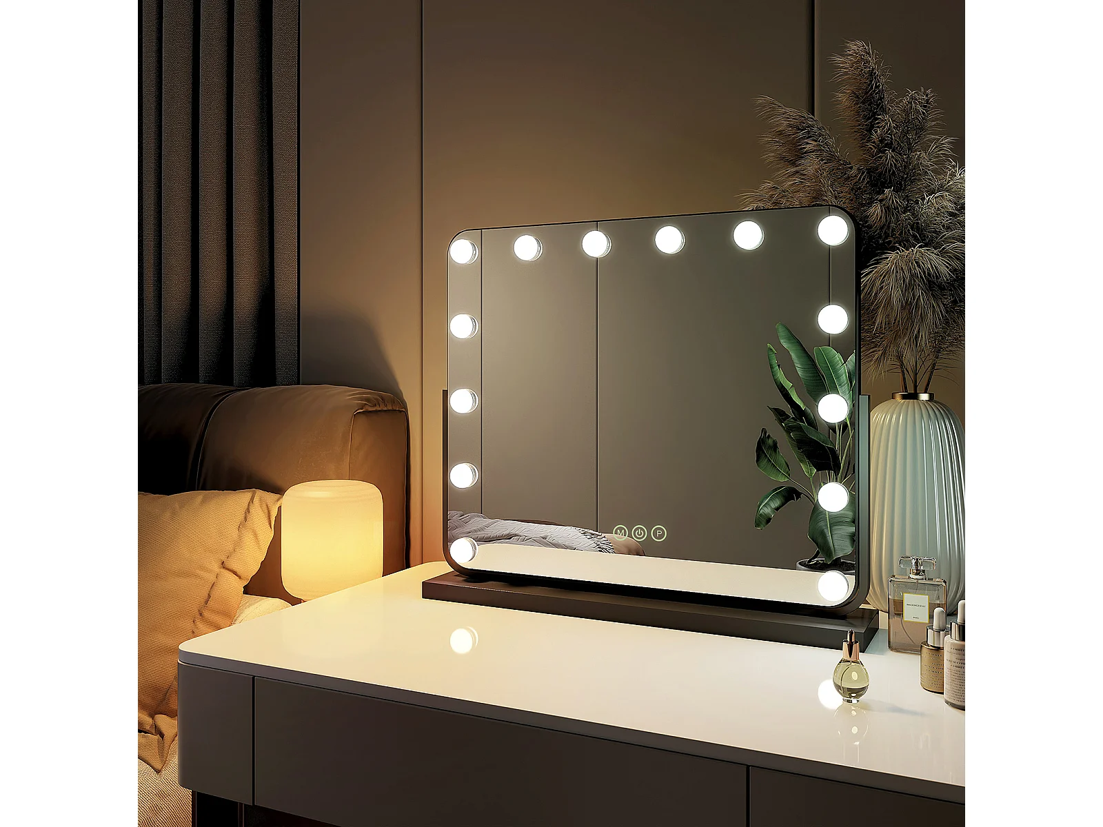 EMKE Hollywood miroir de courtoisie avec lumière, 47.5x36.4cm noir, miroir de coiffeuse pivotant à 360°, avec 3 lumières dimmables