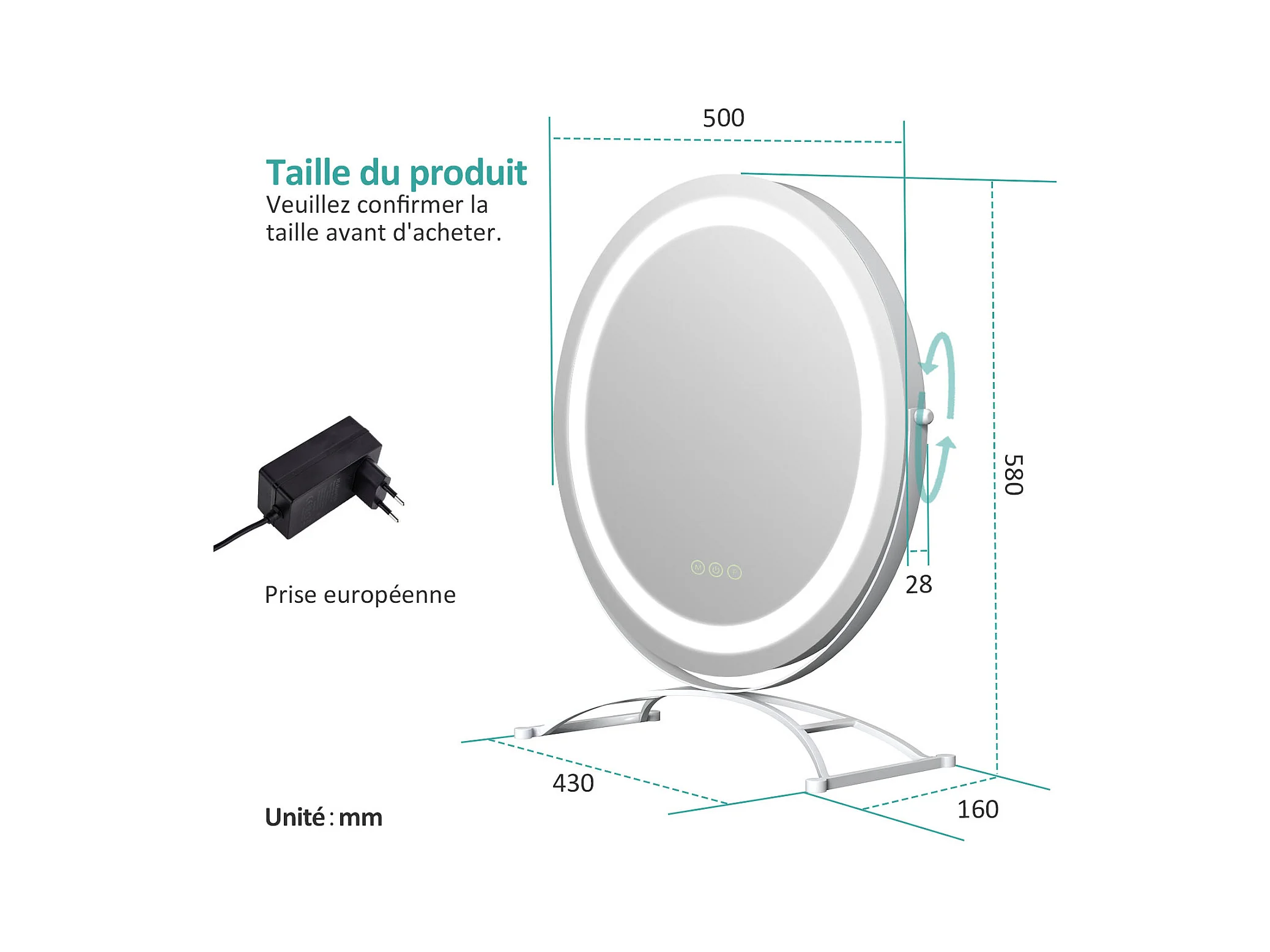 Miroir de table avec éclairage LED blanc, miroir de maquillage pivotant, miroir coméstique avec support - Diamètre 15 x Hauteur 28.5 cm