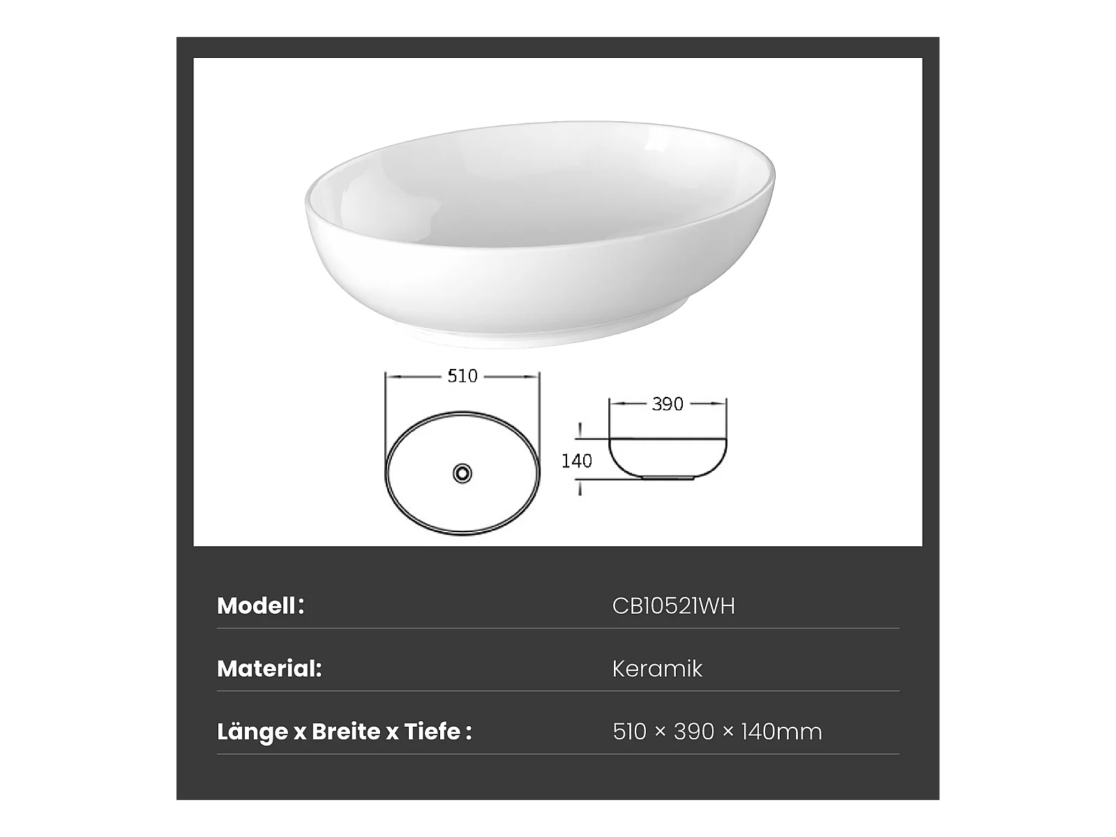 Lavabo en céramique blanc avec garniture de vidage 630x420 mm ECD Germany