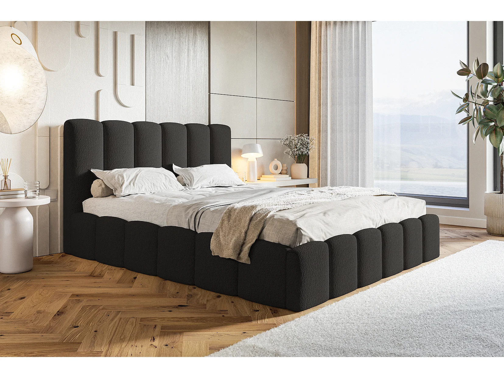 Emporius Lit Rembourré 140 x 200 cm avec Rangement Palermo - Lit Double 140x200, tissu bouclé Noir (Anthology 19)