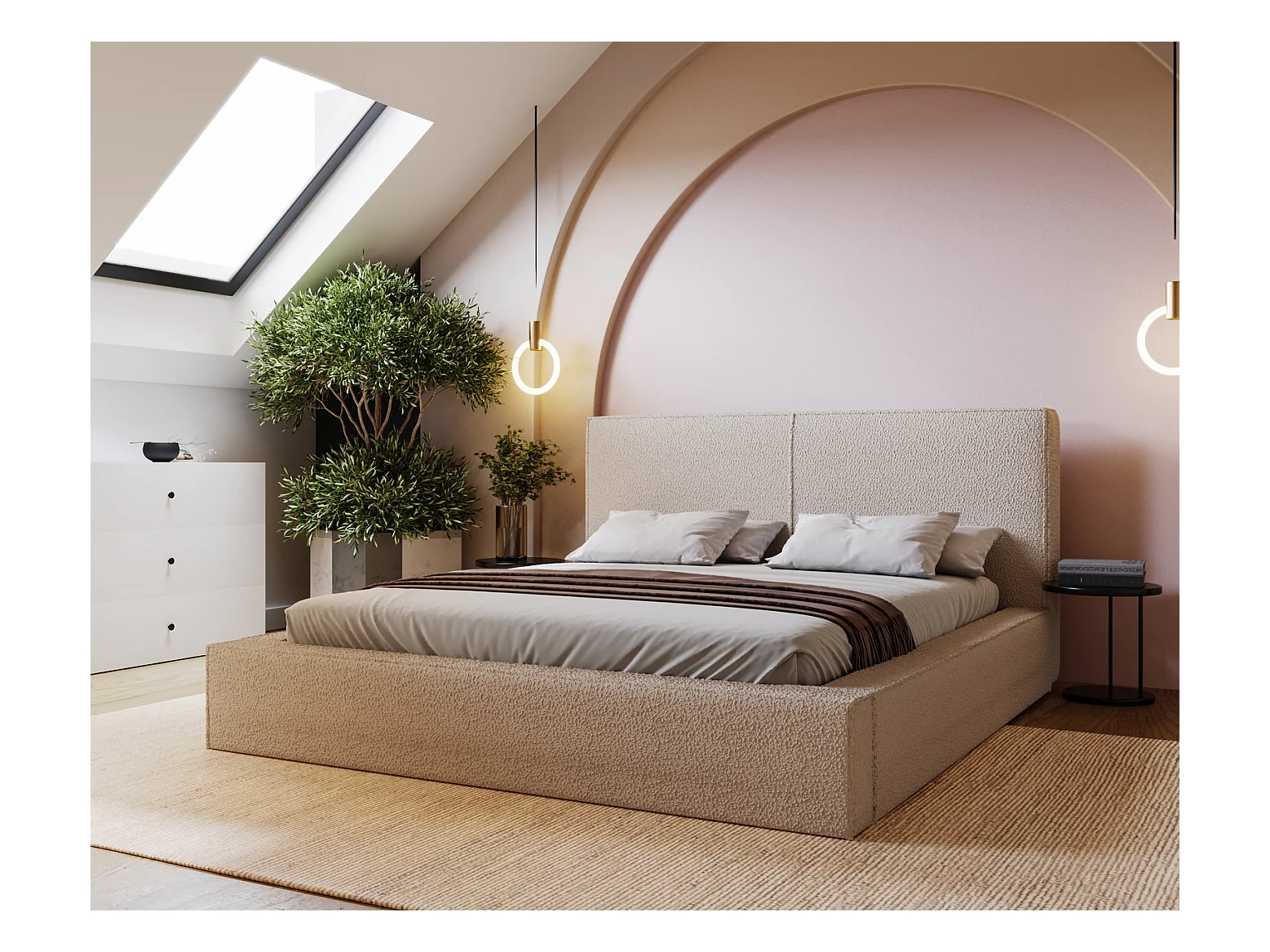 Emporius Morin lit double 200x200 avec rangement, sommier à lattes, tête de lit - lit bouclé 200x200 Beige (Anthology 3)