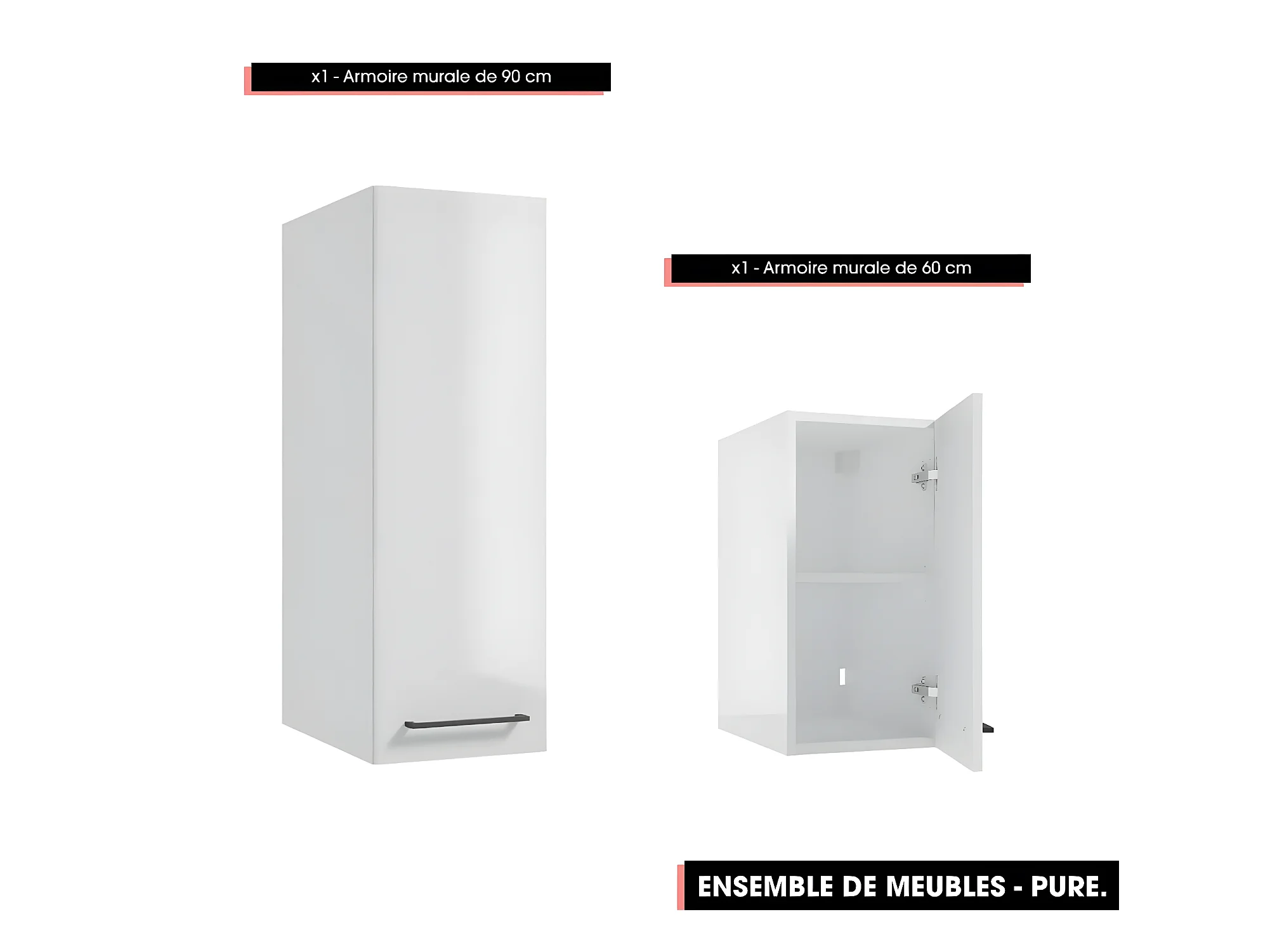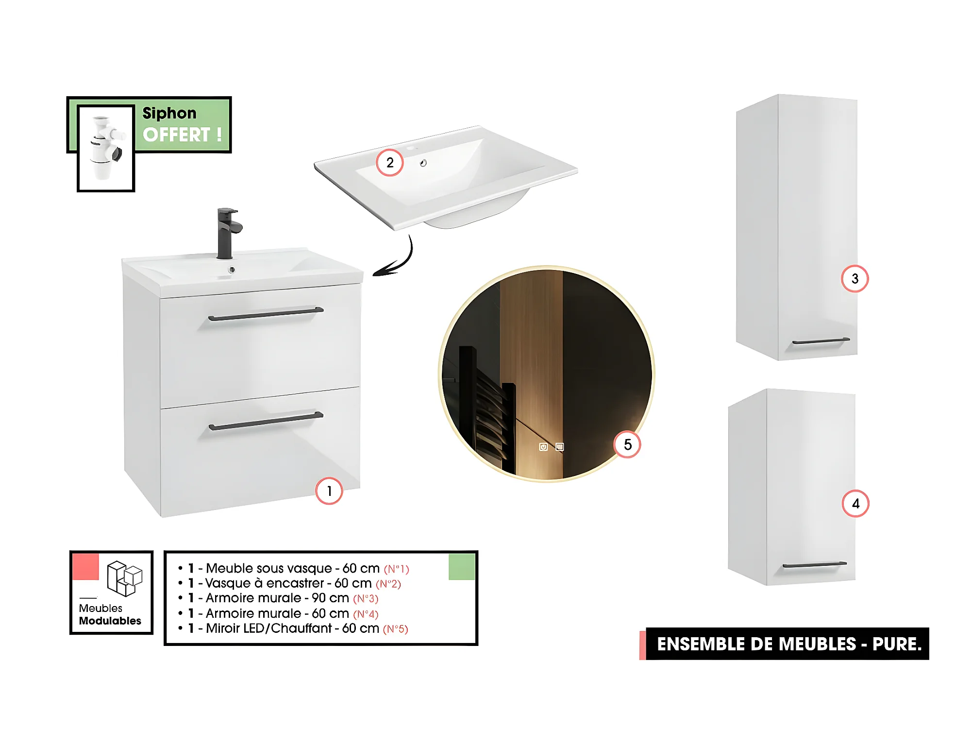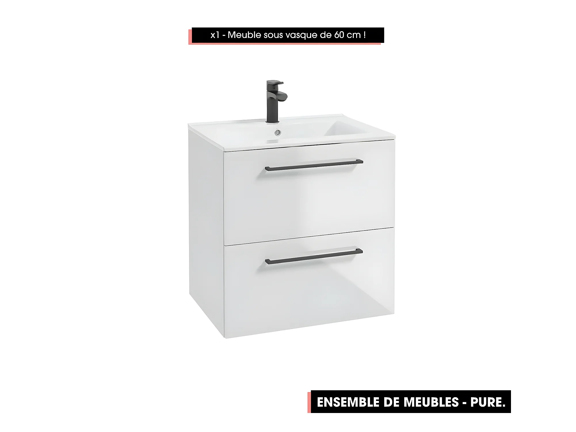 Emsemble complet de salle de bain - Meuble - Armoires - Miroir - Vasque à encastrer avec Siphon OFFERT | PURE | Blanc | 60 x 60 x 45 cm